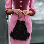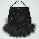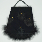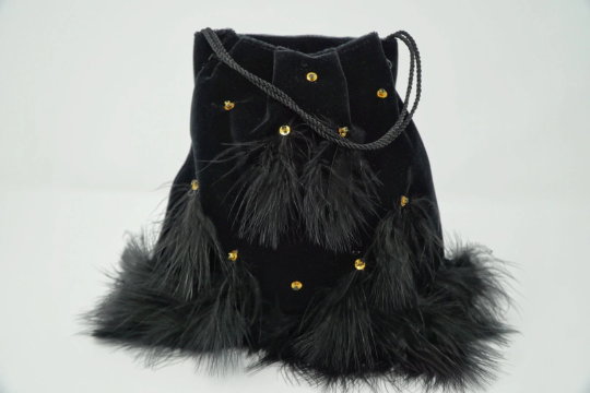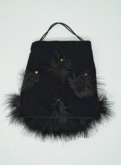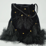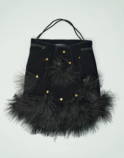 This original model, in addition to how confortable and practical, is essential for guest looks in autumn and winter. The bag is made of black velvet and decorated with black feathers and gold rhinestone details. Its measures are 20 cm high and 20 cm long.
