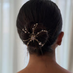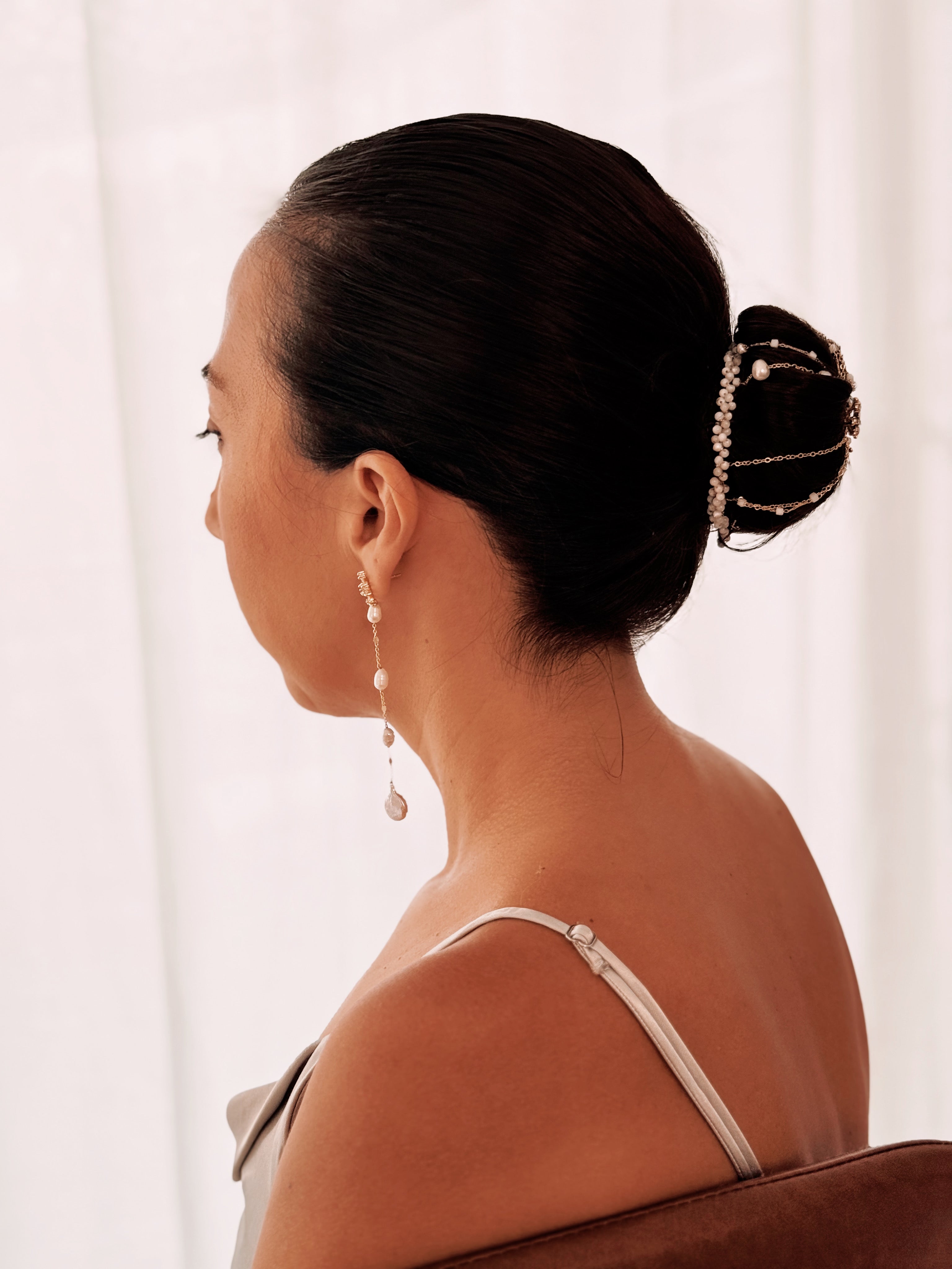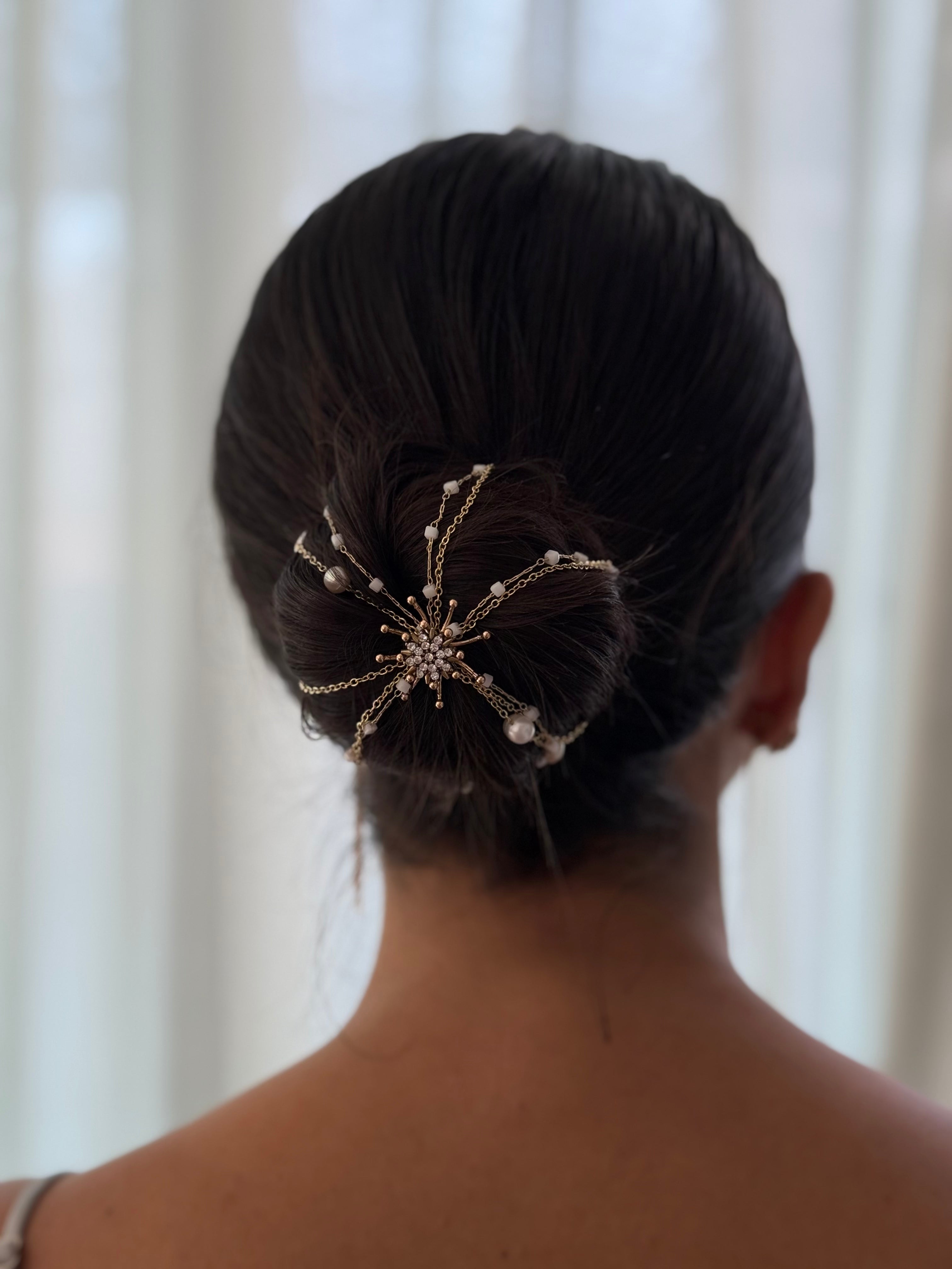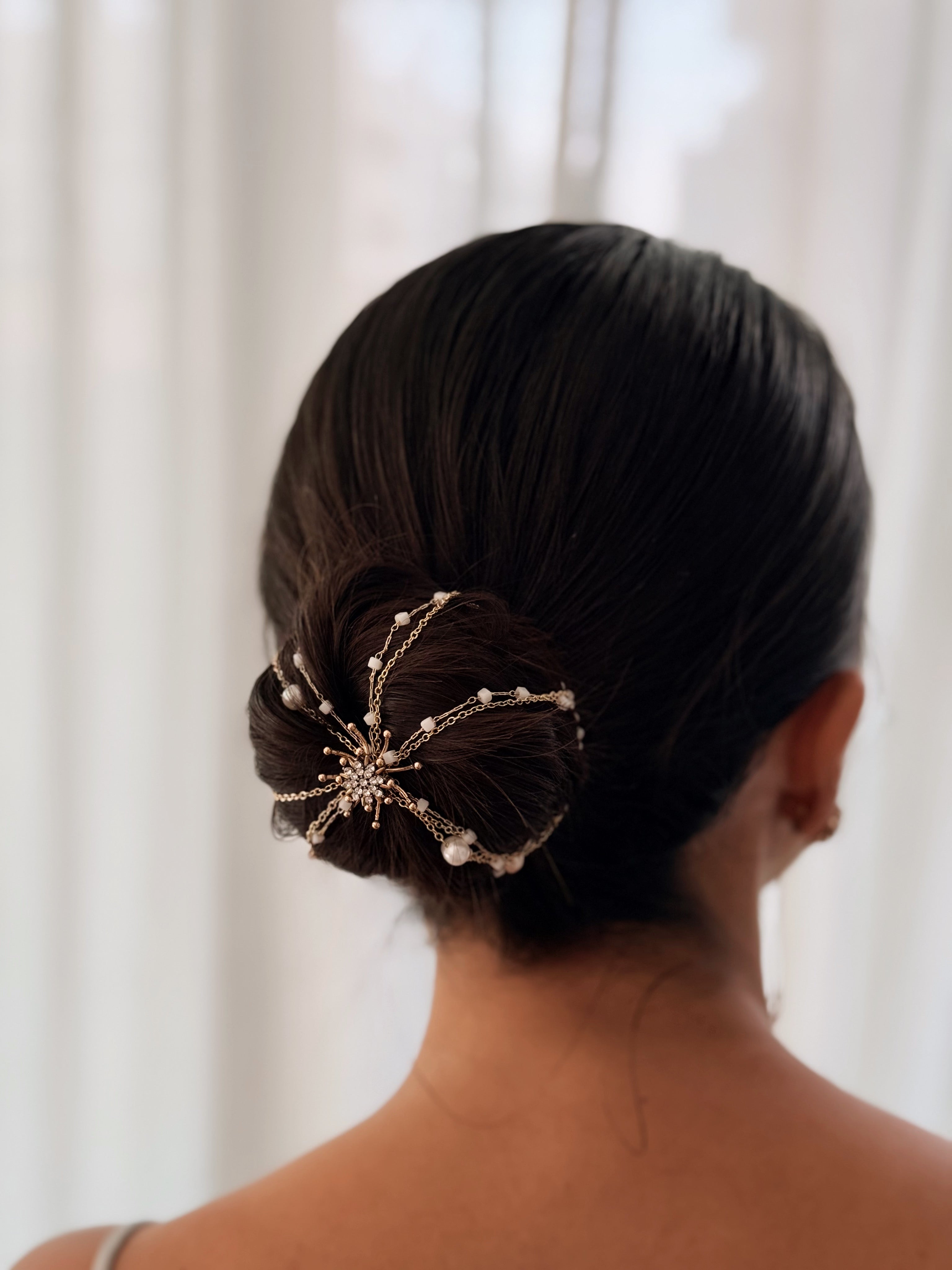 Diseñado para realzar recogidos y moños, este accesorio de pelo artesanal combina la esencia de la joyería para el cabello con la sofisticación de un tocador de novia o invitada elegante. Ligero, cómodo y único, convierte cualquier peinado en un look inolvidable.