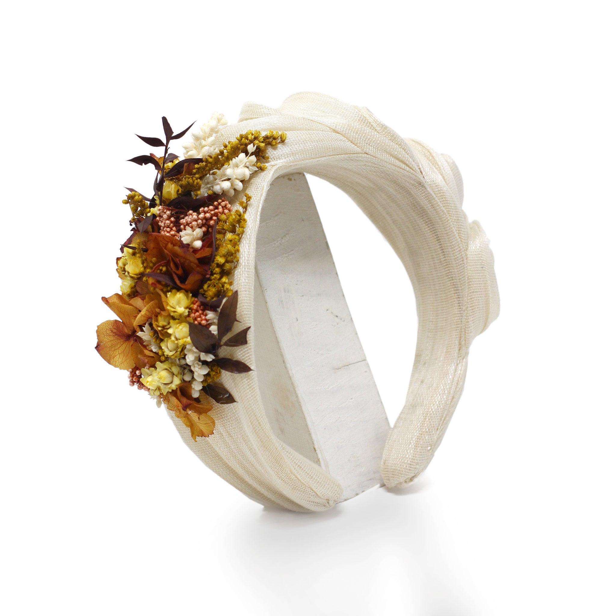 Wrinkled headband in beige sinamay silk decorated with preserved flowers in mustard and earth tones on one side. On the other we perform a manual wrinkle that adds height to the look and stylizes it.