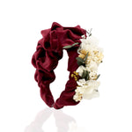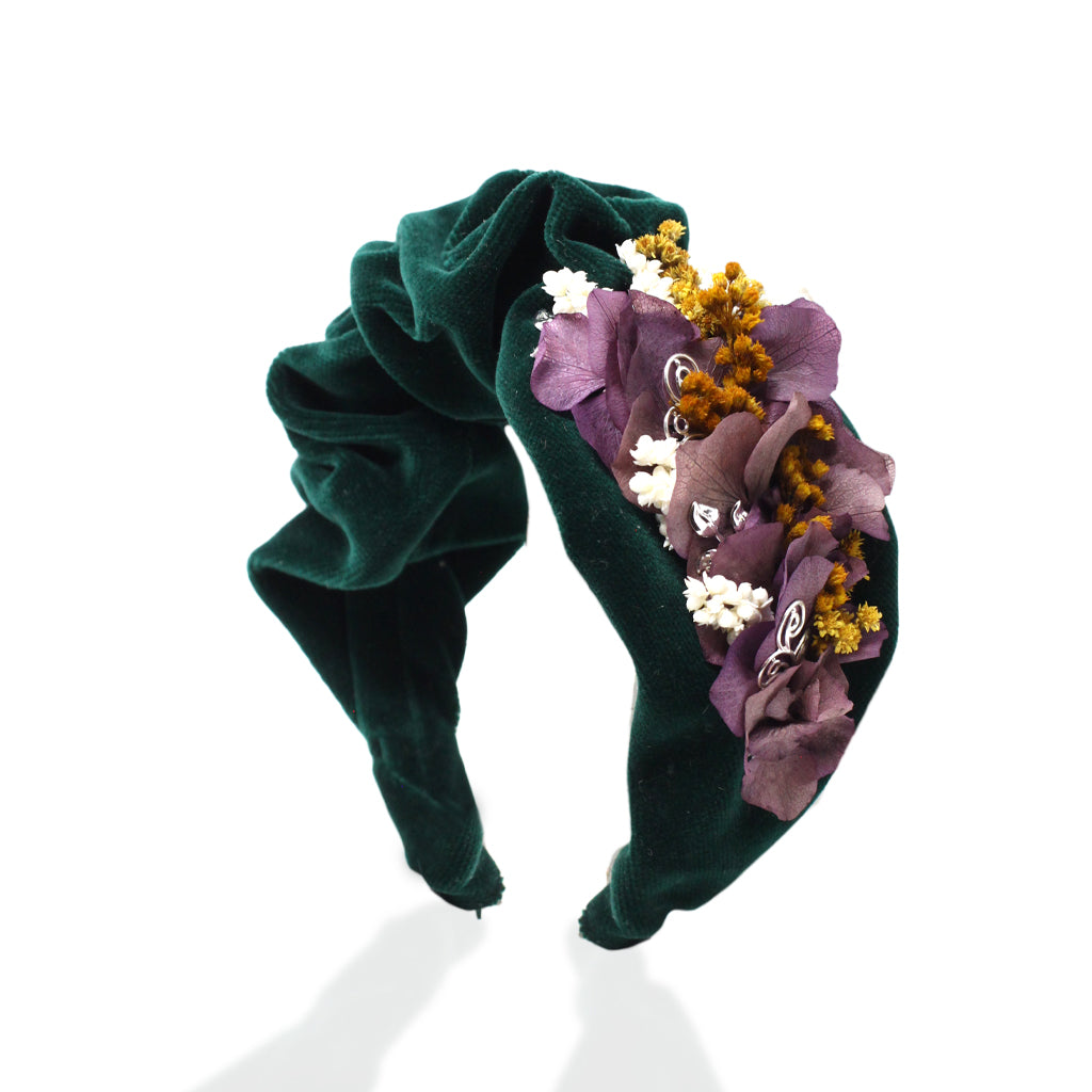 Handmade wrinkled velvet headband. This beautiful headband adds a little volume to your look and is decorated with preserved natural flowers. You can choose the headband with or without a short tulle veil.