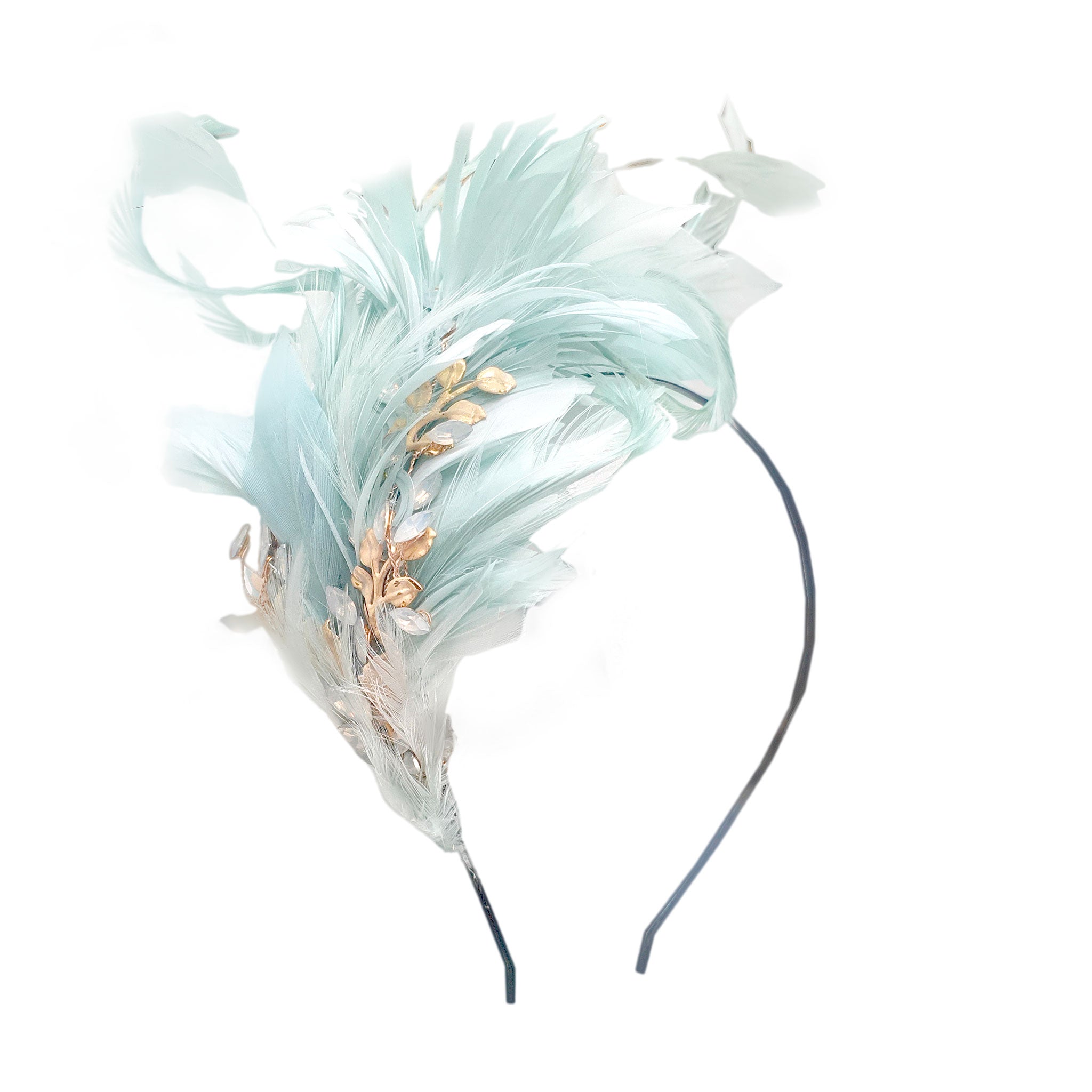 Handmade thin metal headband , decorated with green feathers, jewel pieces in gold, and glass. This headband is very special and perfect to give that touch of elegance to events such as weddings, baptisms, communions and even cocktail parties.