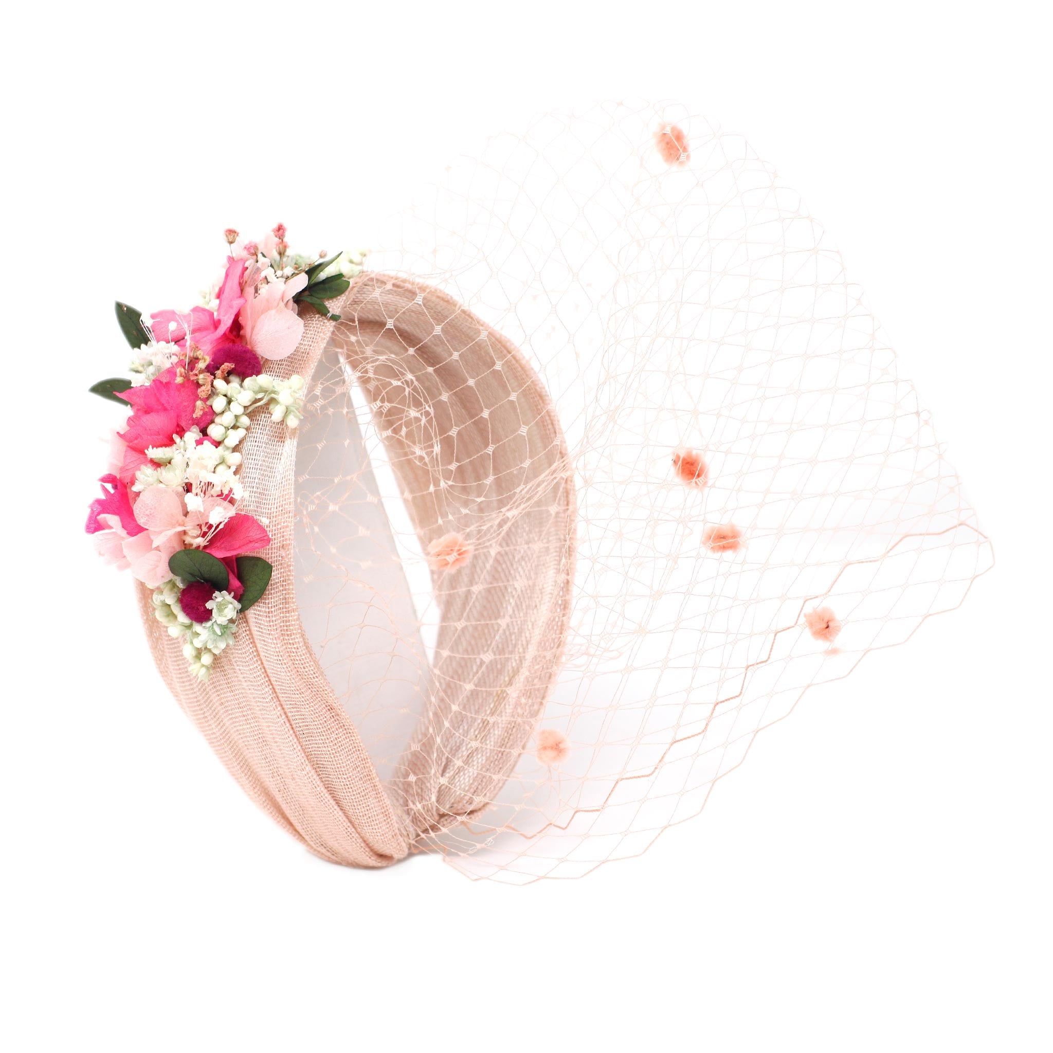 Handmade sinamay fabric headband, wrinkled on a side. This beautiful headband adds a little volume to your look and is decorated with preserved natural flowers and jewellery pieces. You can choose the headband with or without a short tulle veil.