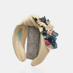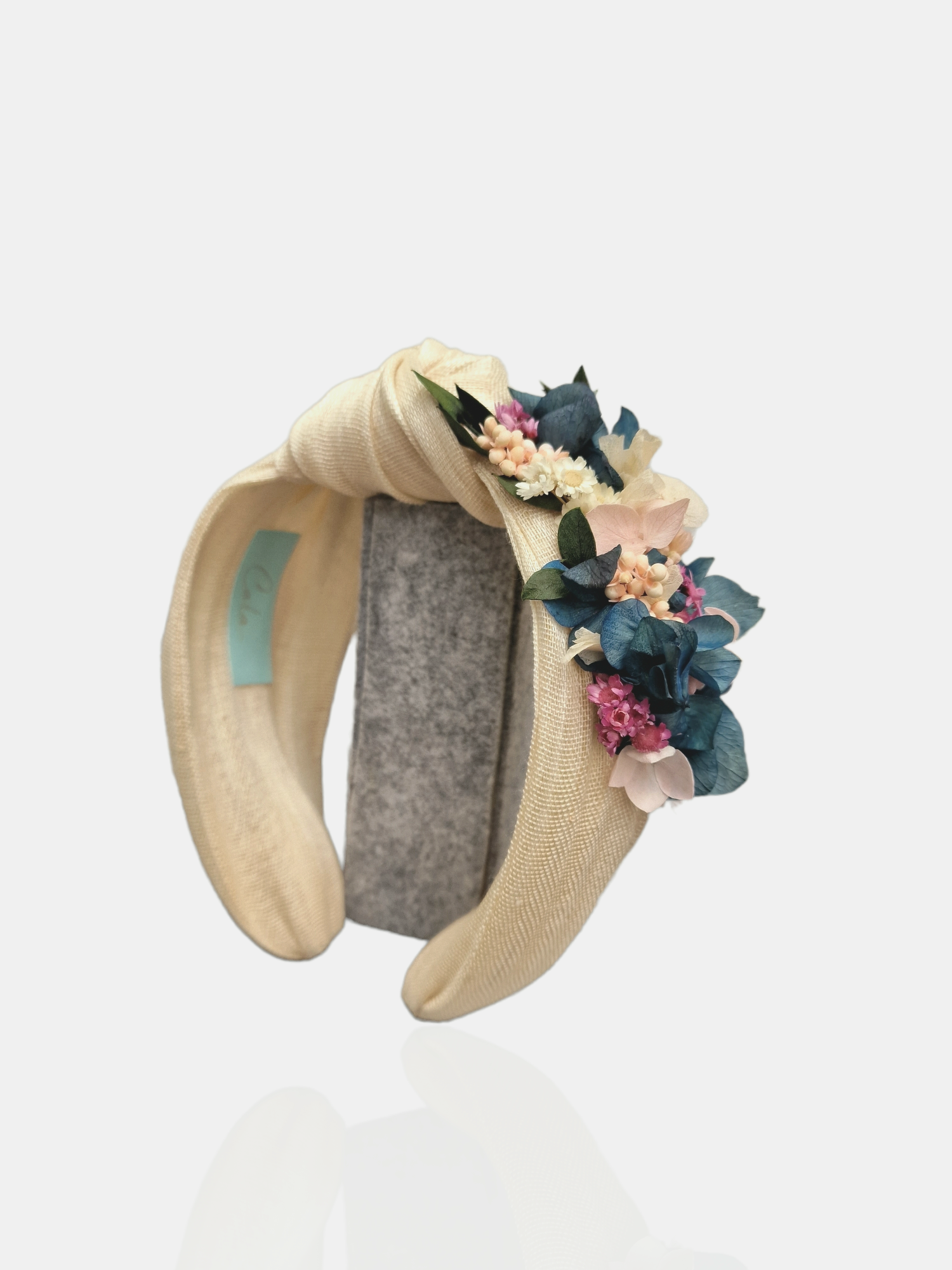 Perfect headband to complement your guest look at a wedding, baptism or other special event. This knotted headband is handmade with sinamay silk fabric in pale pink and decorated with a big variety of preserved natural flowers and leaves. You can choose the tiara with or without a short tulle veil.