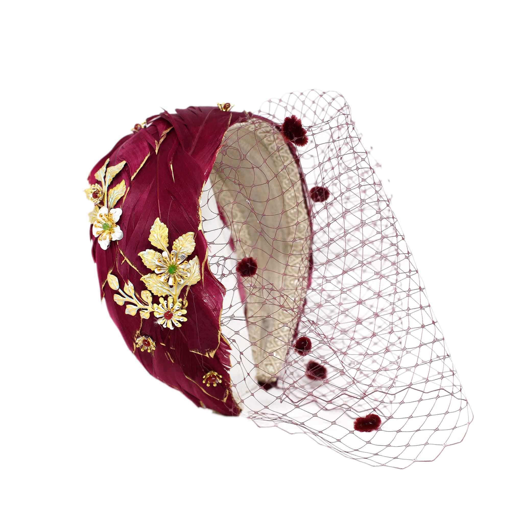 Handmade feather headband with hand-painted golden fringes, decorated with jewel pieces in gold and silver tones and semi-precious stones. You can choose the headband with or without a short tulle veil.