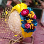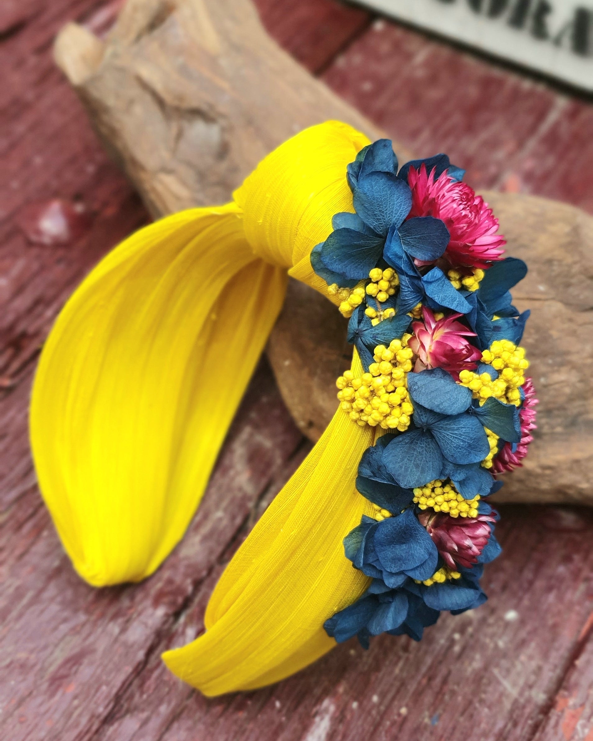 Ideal to complement your guest look at a wedding, baptism or other special event. This knotted headband is handmade with silk sinamay abaca fabric in yellow and decorated with a variety ofpreserved natural flowers in blue and pink tones. You can choose the tiara with or without a short tulle veil.
