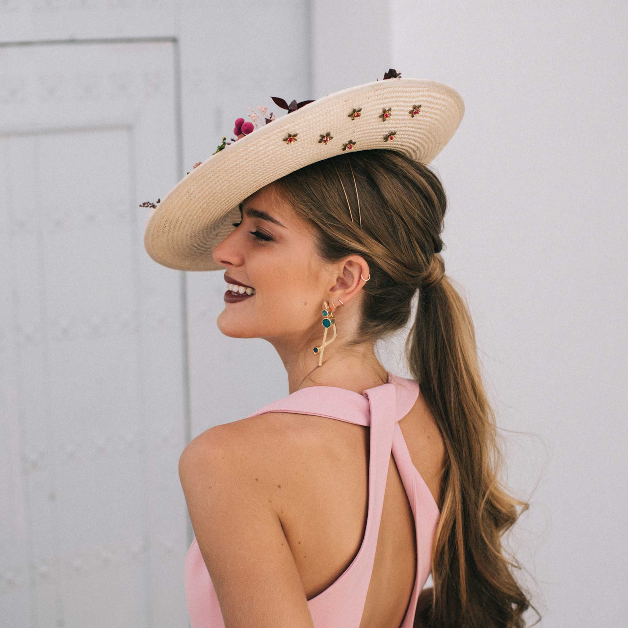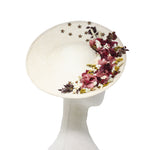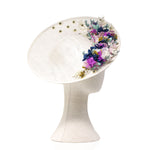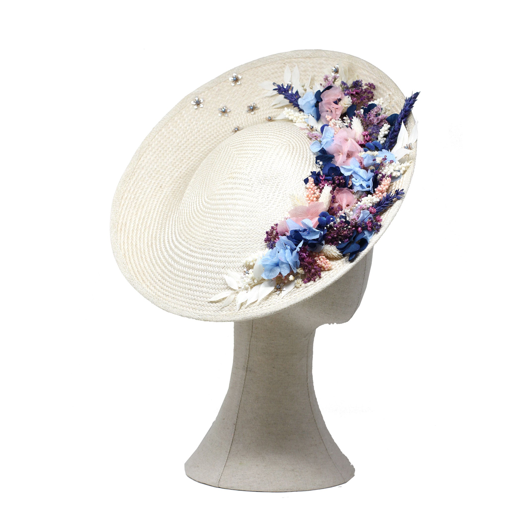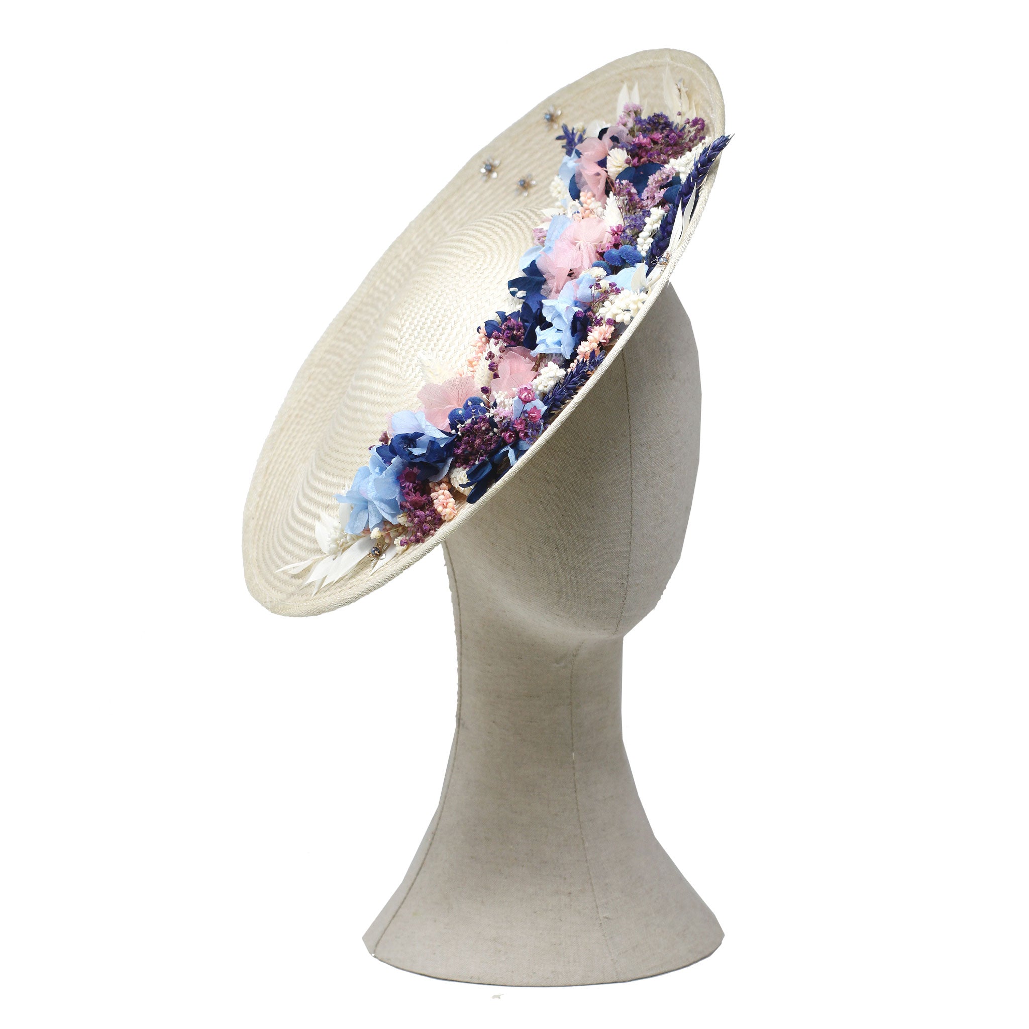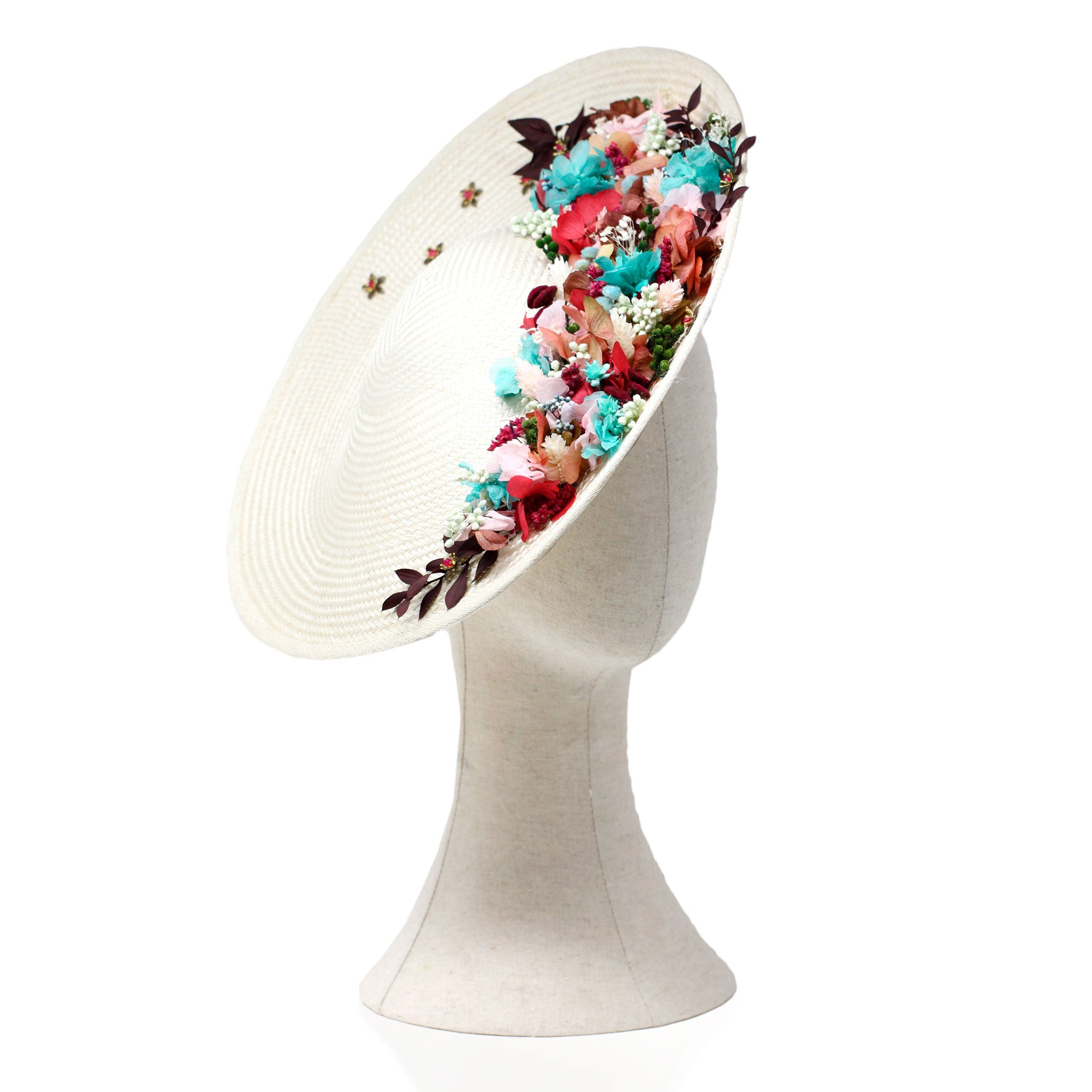 Raw base plate style hat with metallic headband. Decorated with a variety of preserved natural flowers and leaves and finished with jeweled flowers with semiprecious stone centers. This is perfect to help you dazzle at a daytime wedding where you will certainly not go unnoticed.