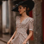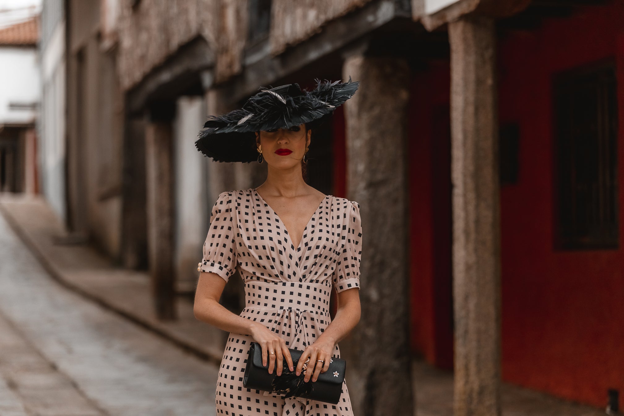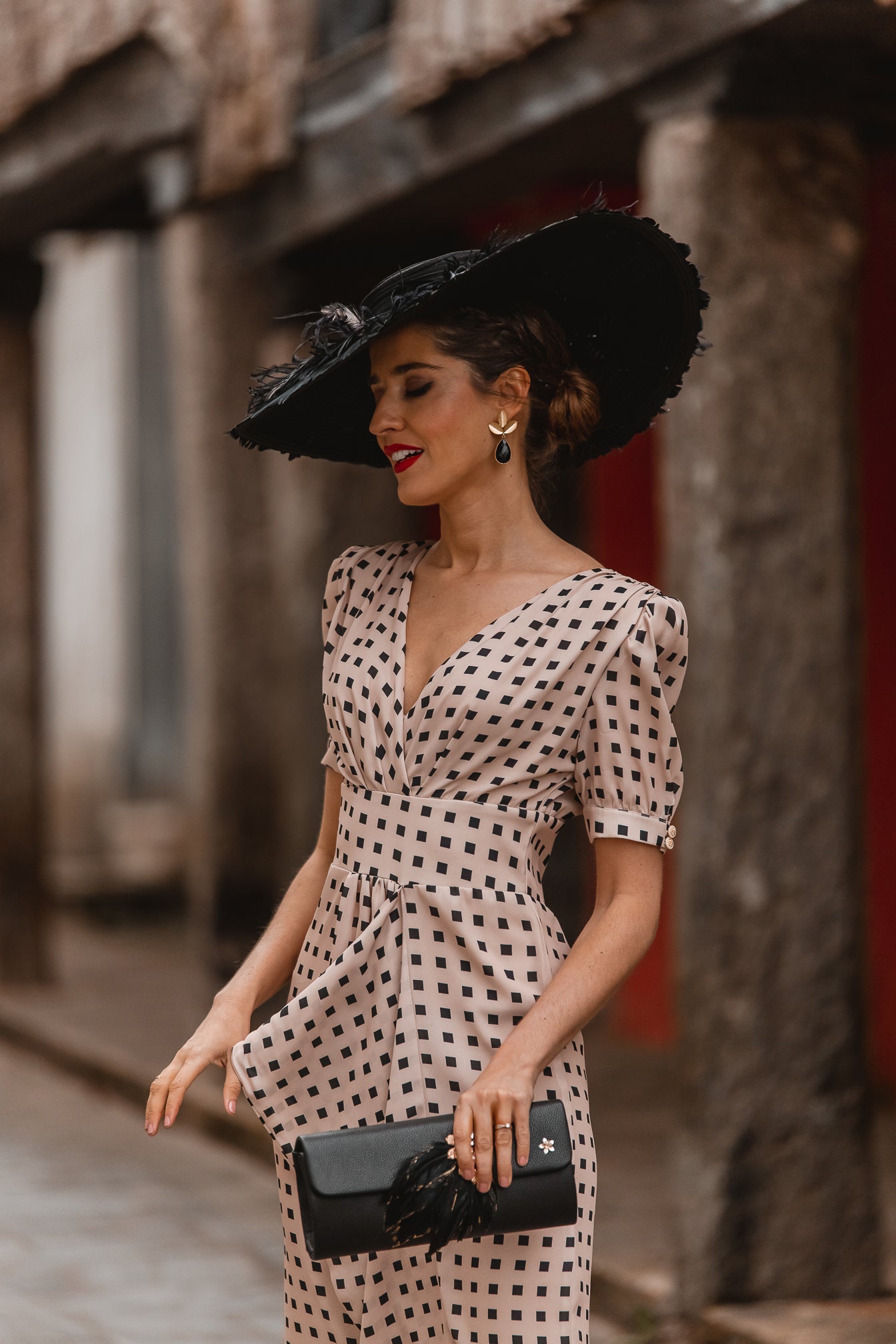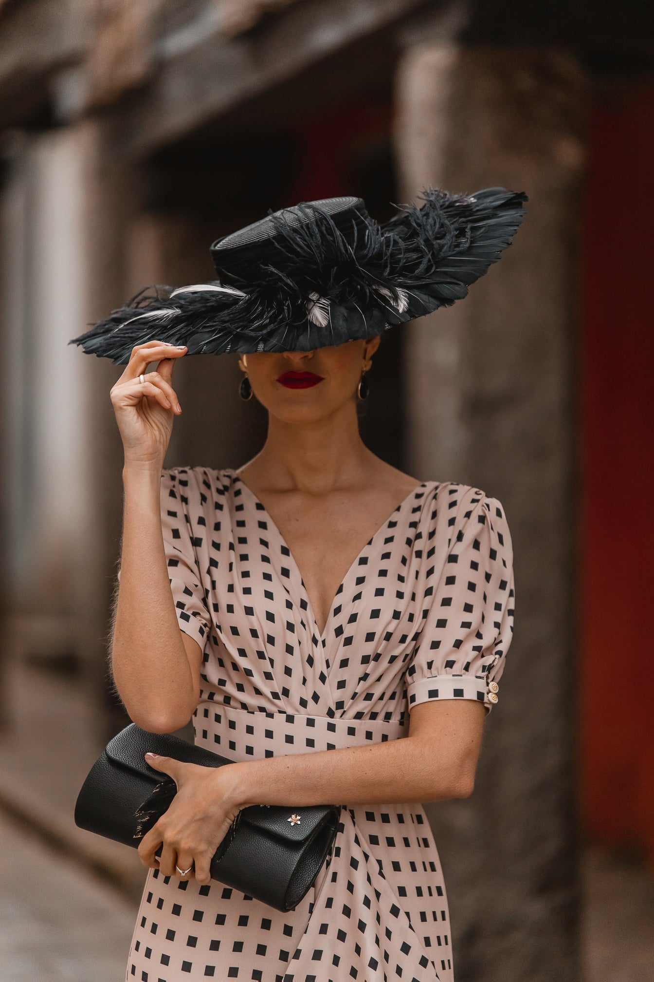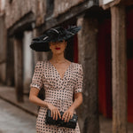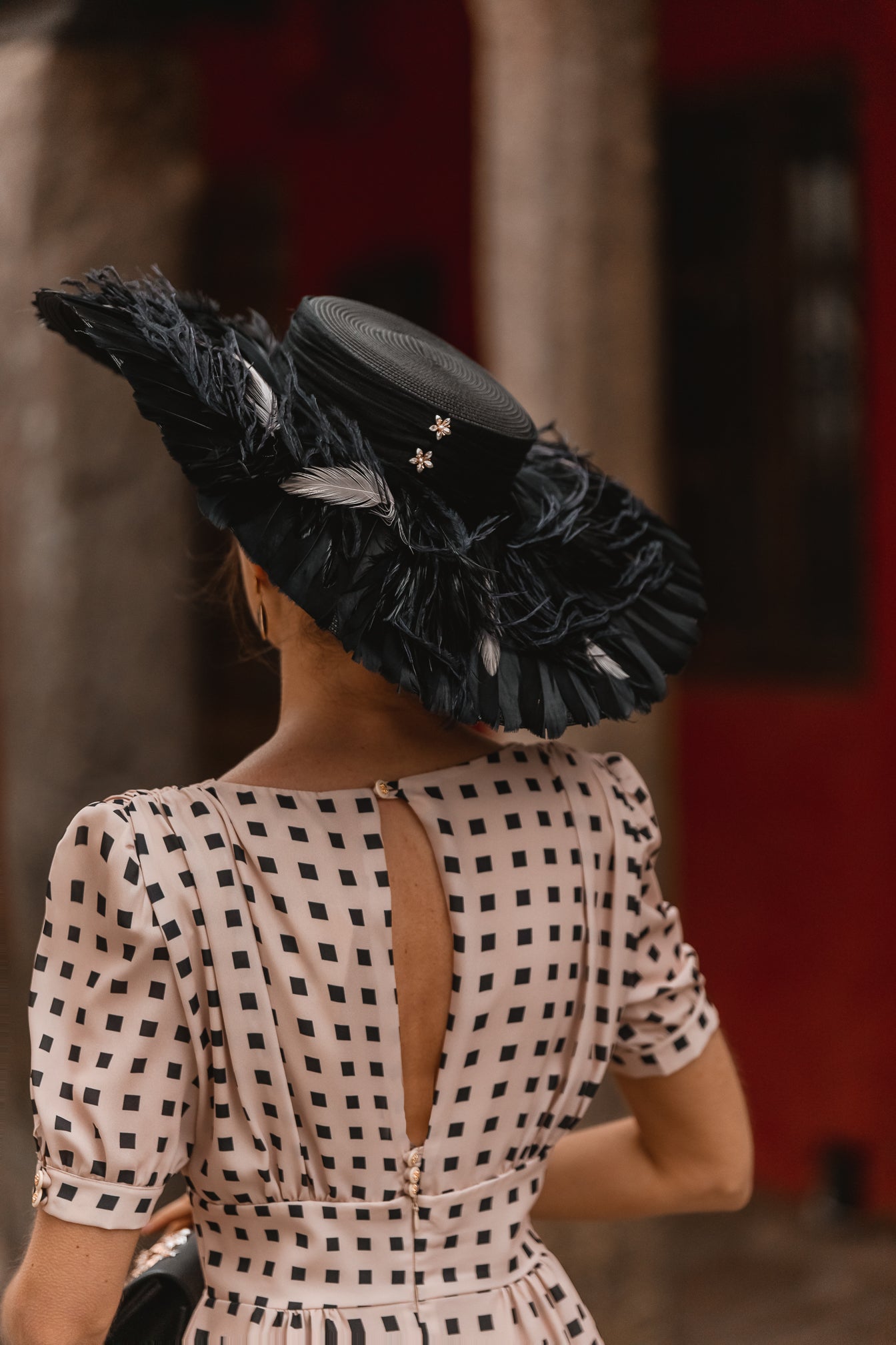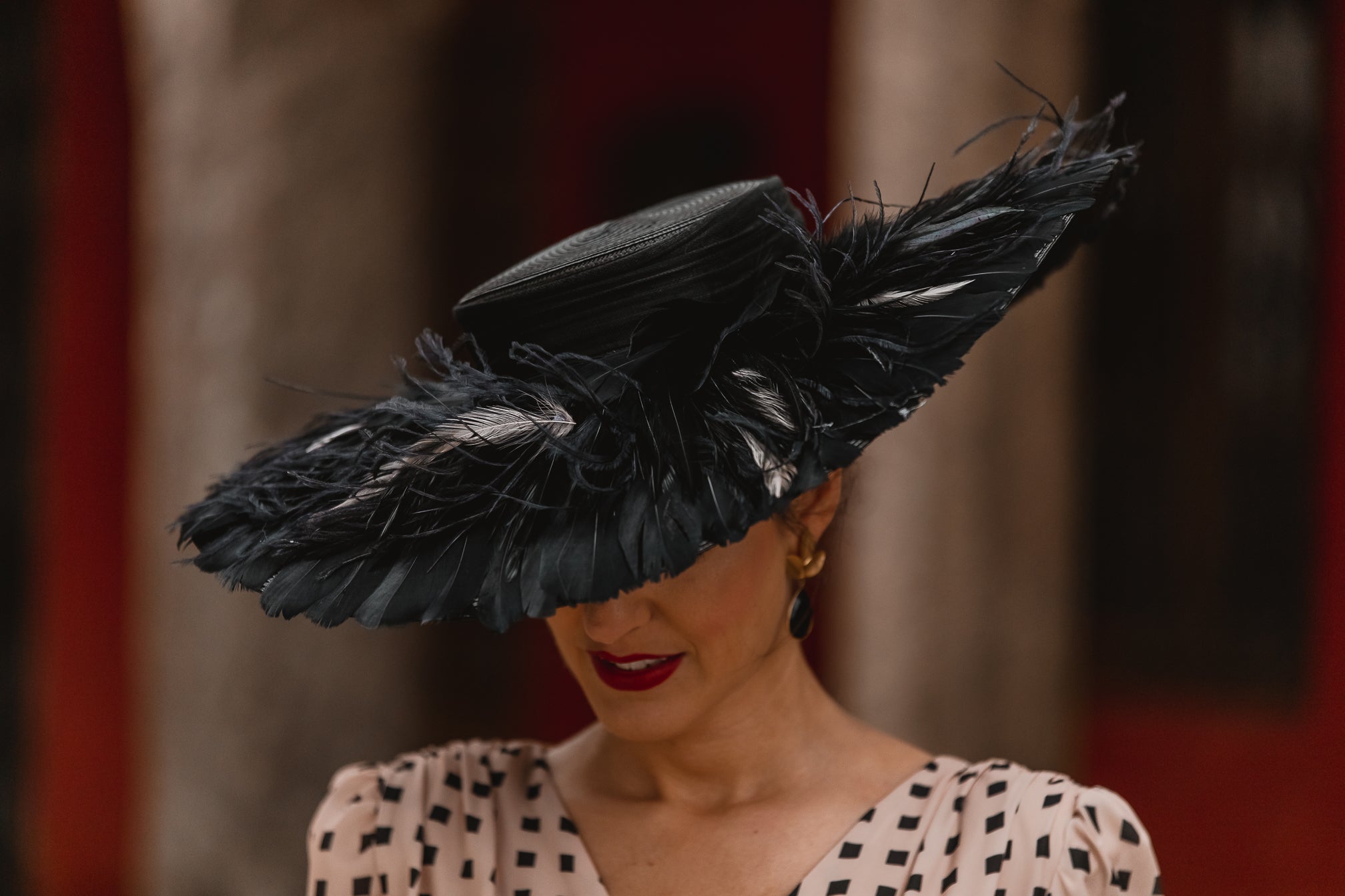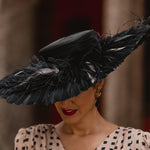 Wide wing champagne wedding hat decorated with ostrich feathers and a bond around the crown. It has 50cm in diameter, a 5cm crown, and a 16cm wing. Originally a size 58, we have added a hidden metal headband that makes it more confortable, and suitable for almost any size.