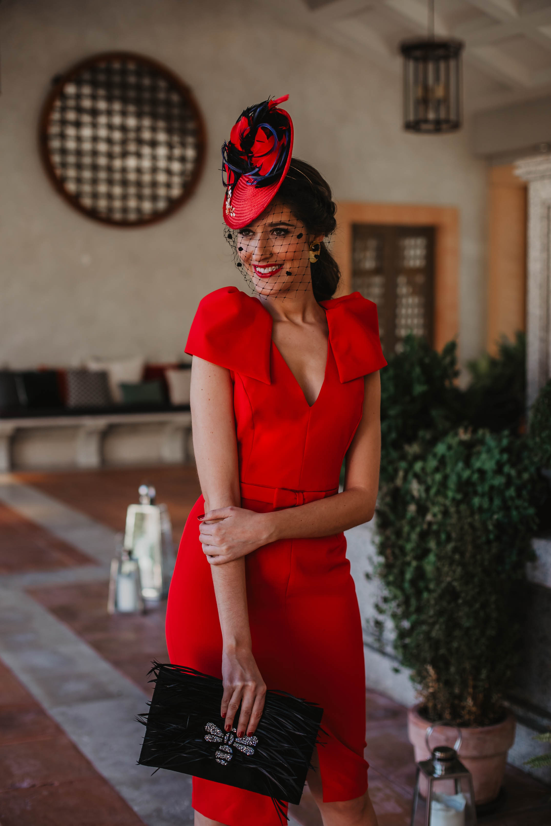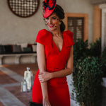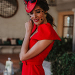 Disc style fascinator in red with metallic headband to secure. It is decorated with a variety of natural preserved flowers and leaves and finished with delicate flower je. This marvelous hat is perfect to help you shine on that special occasion, where you surely will not be overlooked.