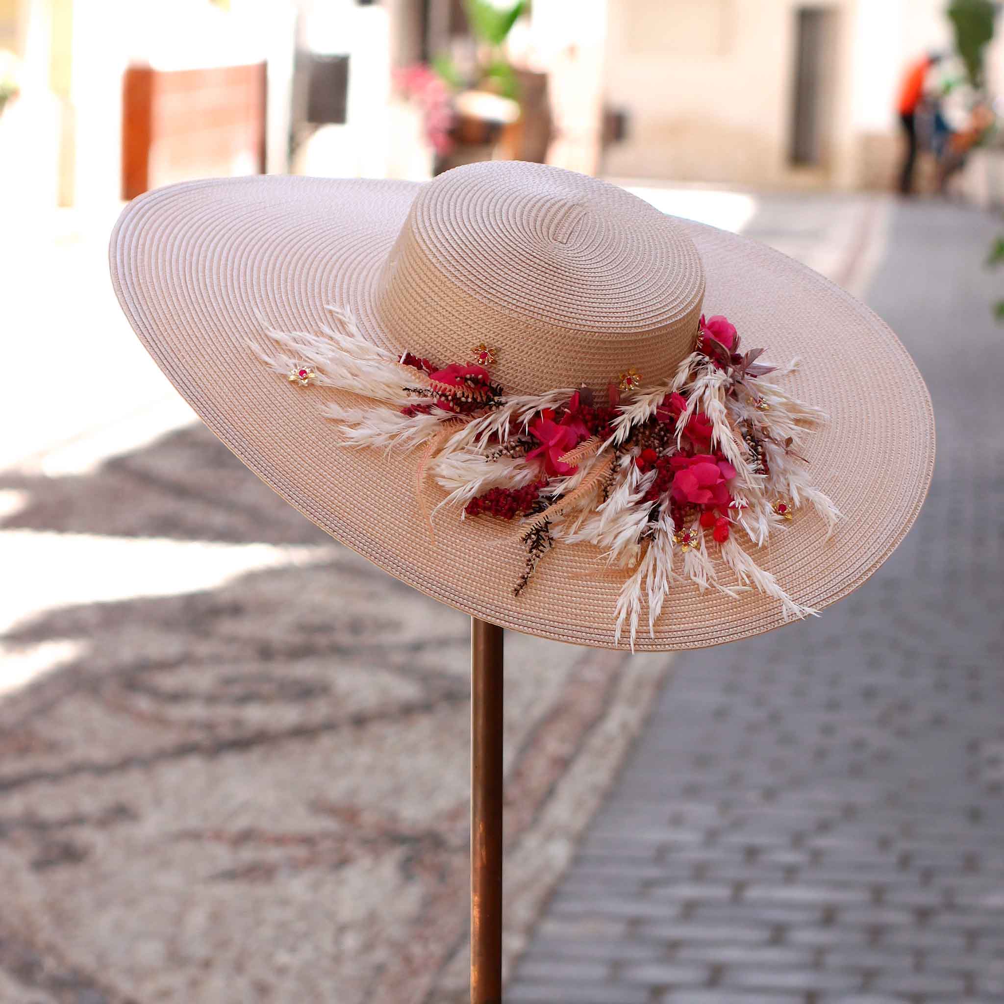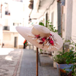 This hat is completely handmade with a beautiful beige base, decorated with jewel pieces and preserved natural flowers.