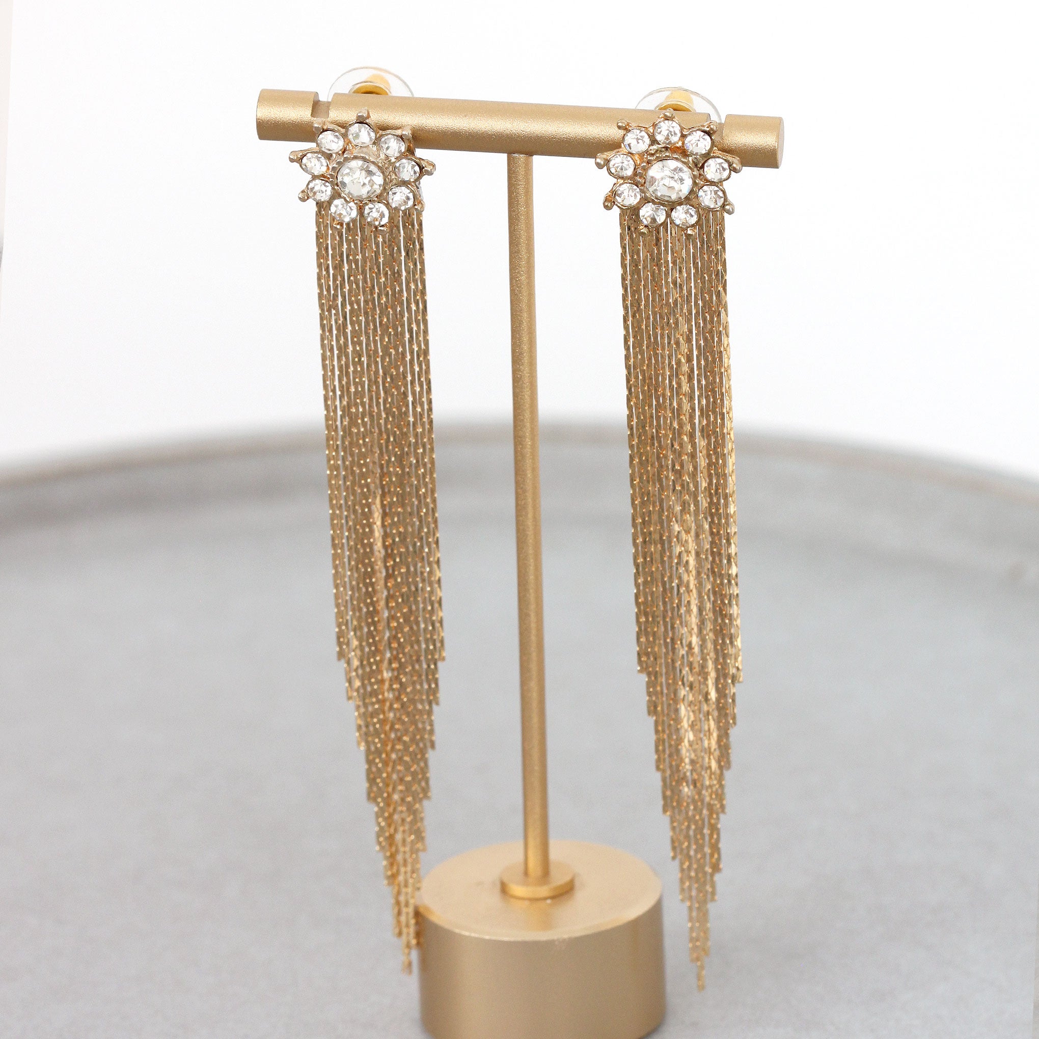Estos pendientes en dorado achampanado destacan por su brillo suave y elegante. El diseño comienza con un rosetón de cristales, del que caen varias cadenas largas que aportan movimiento sin recargar.
