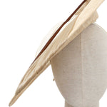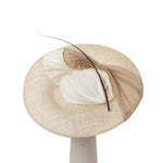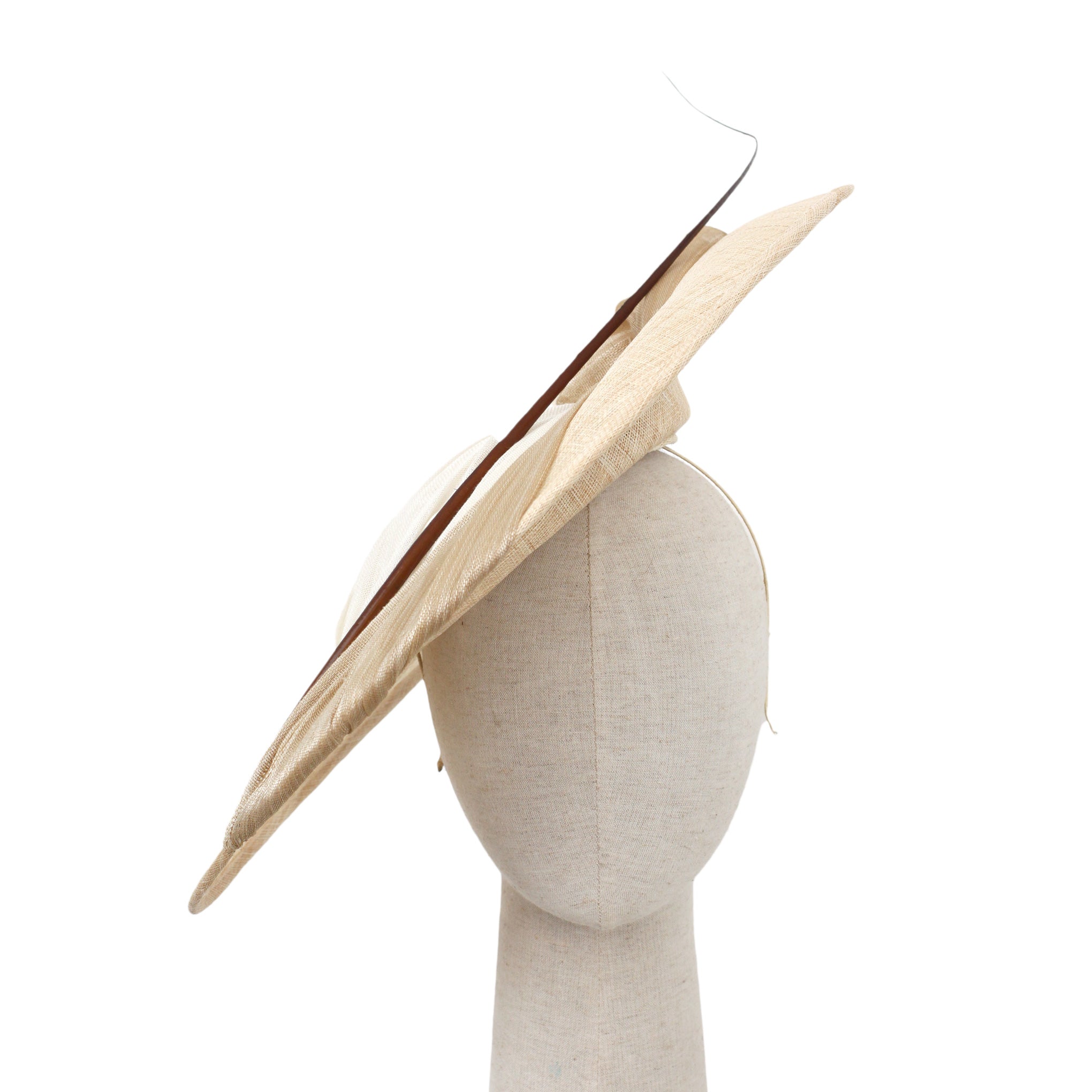 Esta pamela de aproximadamente 50 cm combina la suavidad del beige con un tono marrón claro muy favorecedor. La pieza destaca por su decoración frontal realizada en Sinamay Seda, un tejido fino, elegante y muy utilizado en tocados de alta calidad por su caída y textura.
