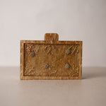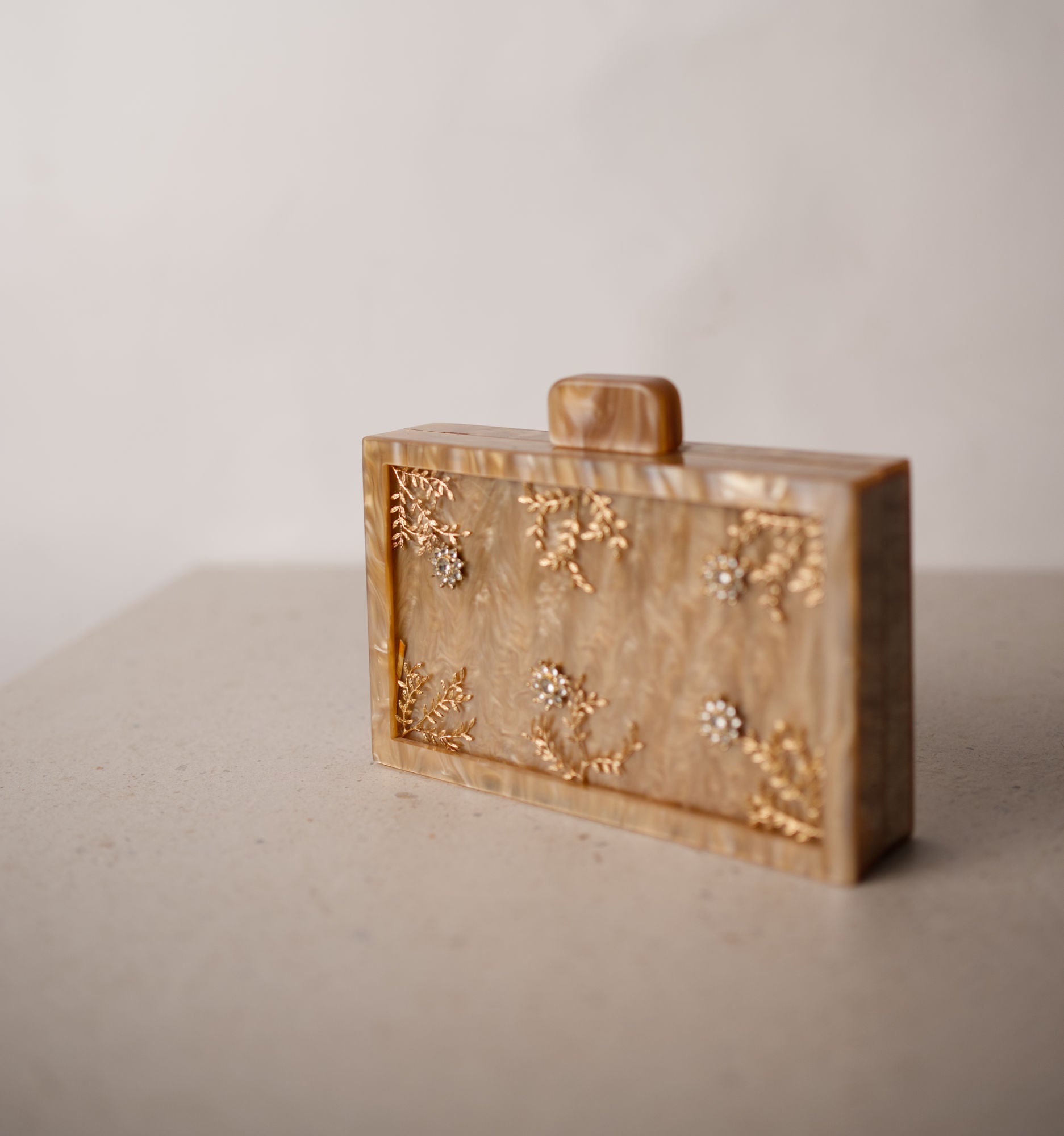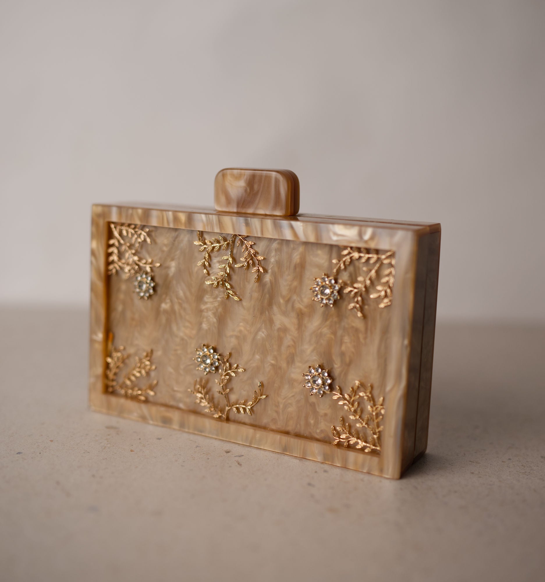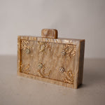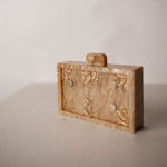 Está realizado a mano con materiales nobles. El material base se adorna con motivos florales y vegetales, creando un conjunto ligero, refinado y lleno de detalle. Un bolso que aporta un toque joya al conjunto sin restar protagonismo.