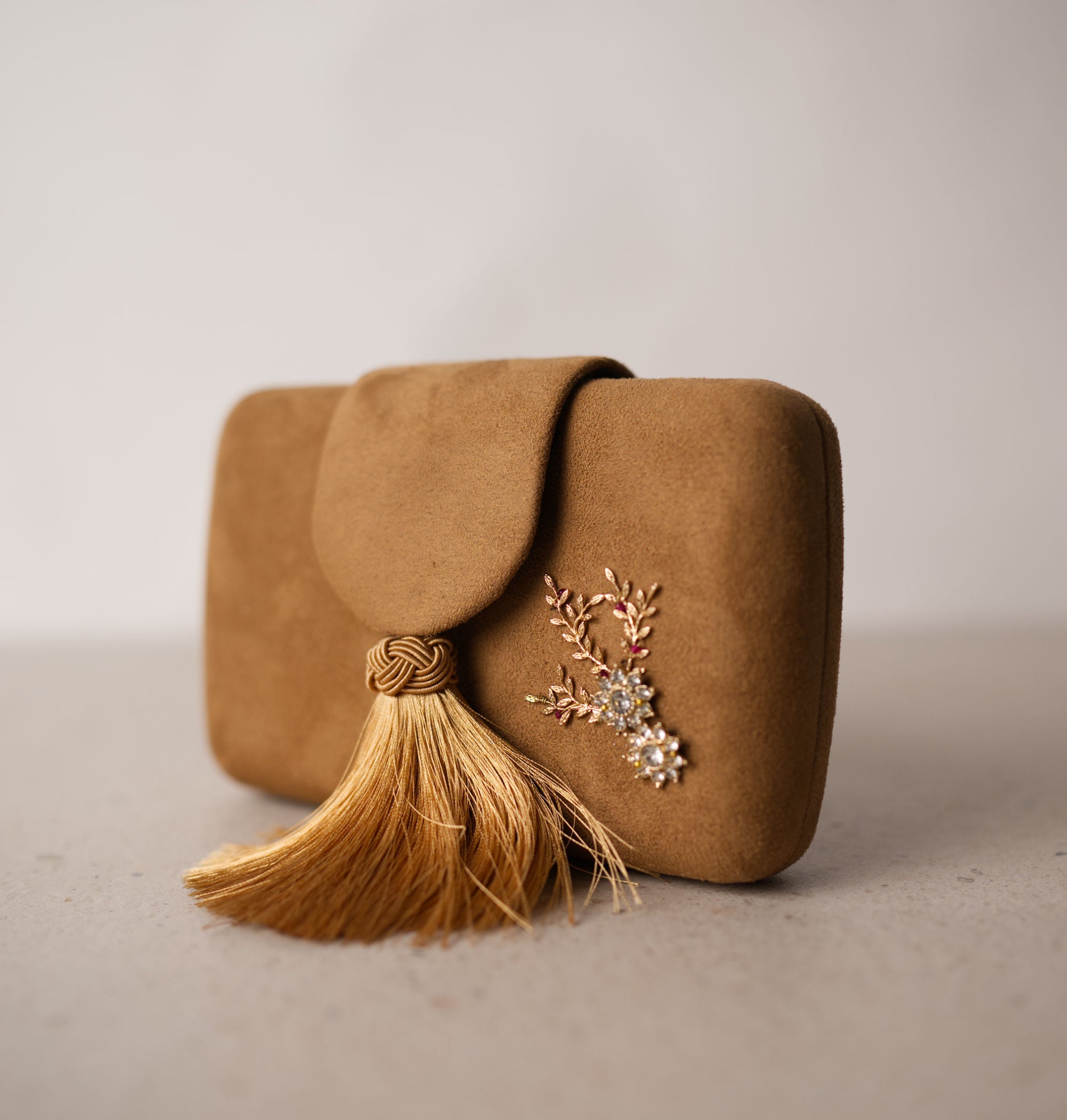 Está realizado a mano con materiales nobles. Su broche decorativo y los flecos en tonos suaves aportan movimiento y textura, creando un conjunto equilibrado y lleno de encanto. Un bolso que suma personalidad al conjunto sin restar protagonismo.