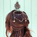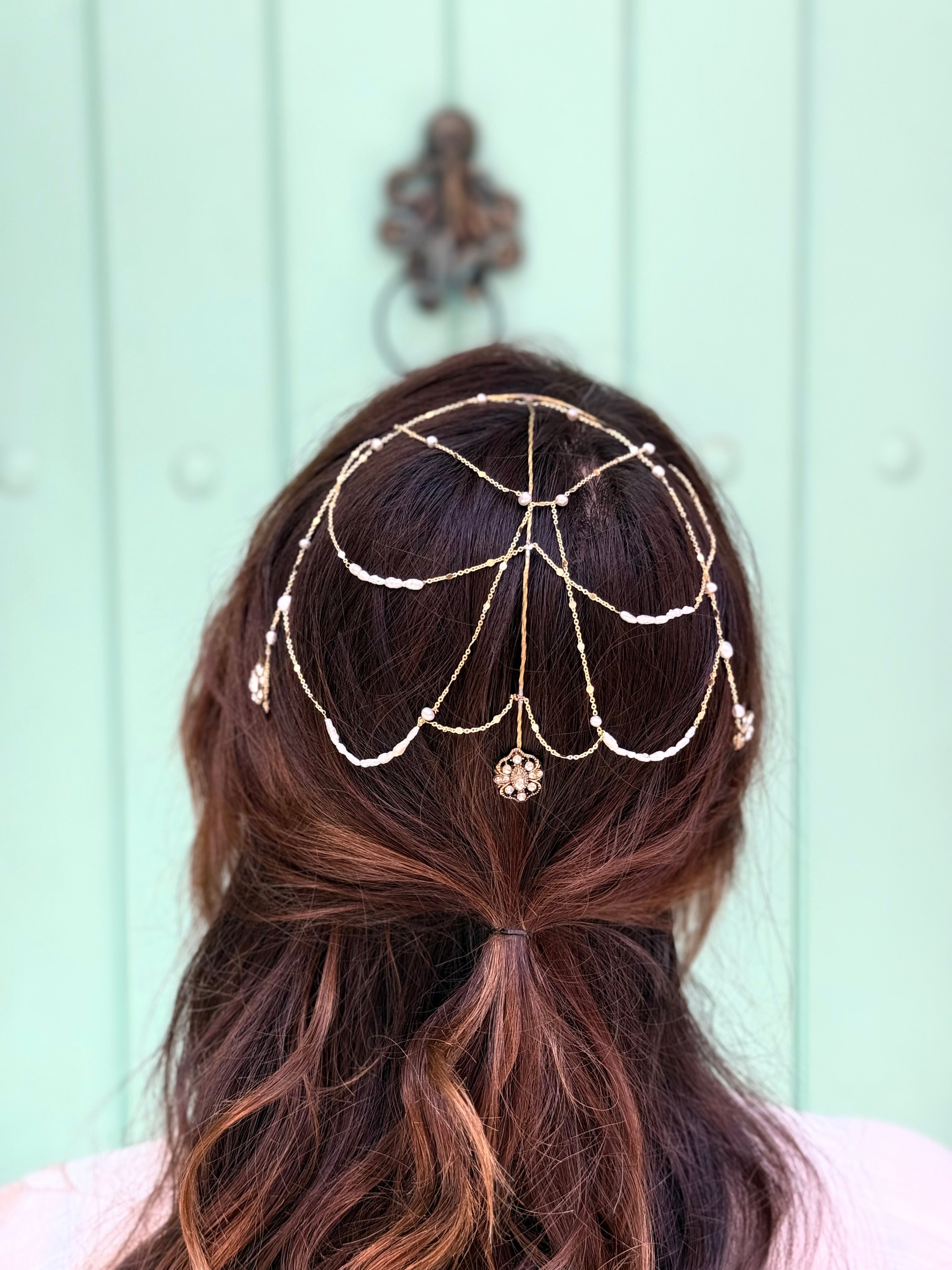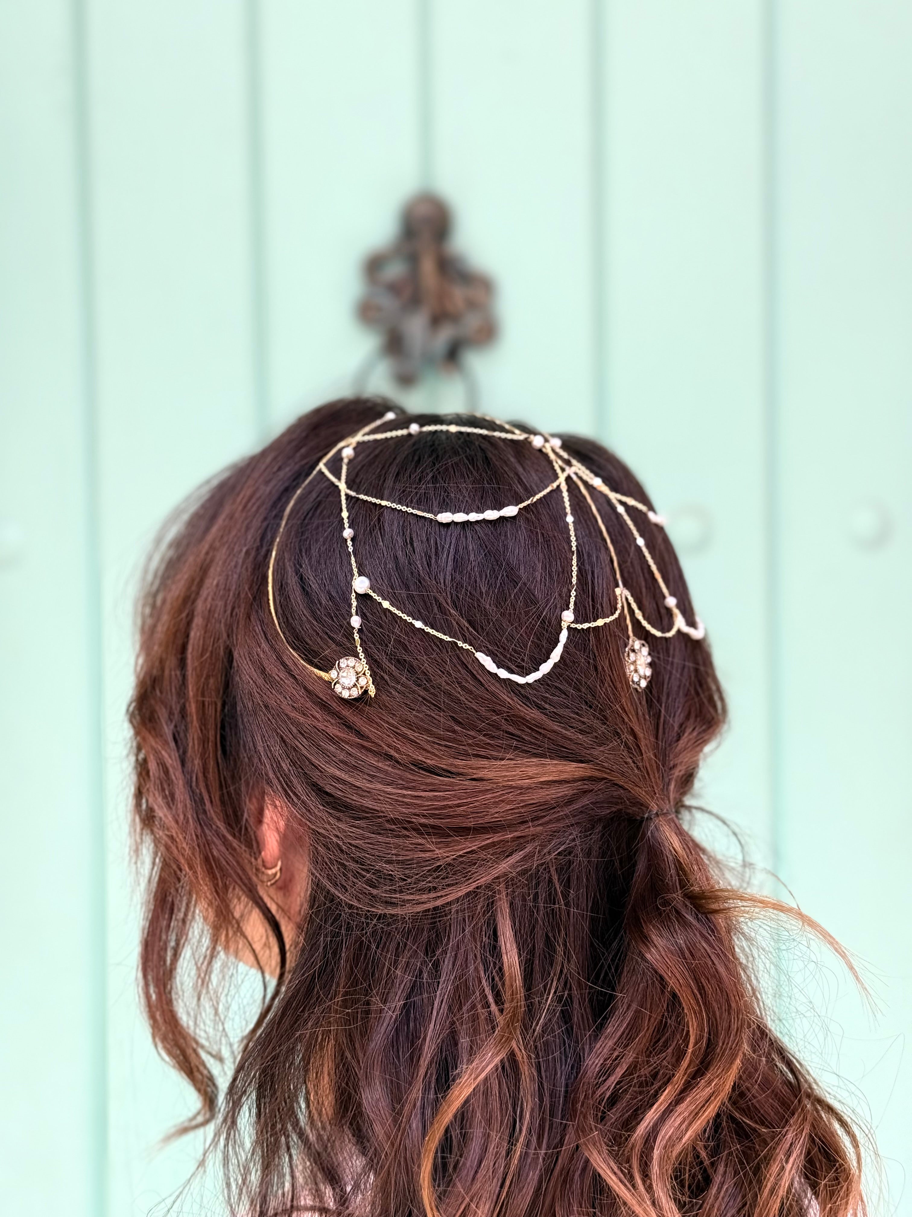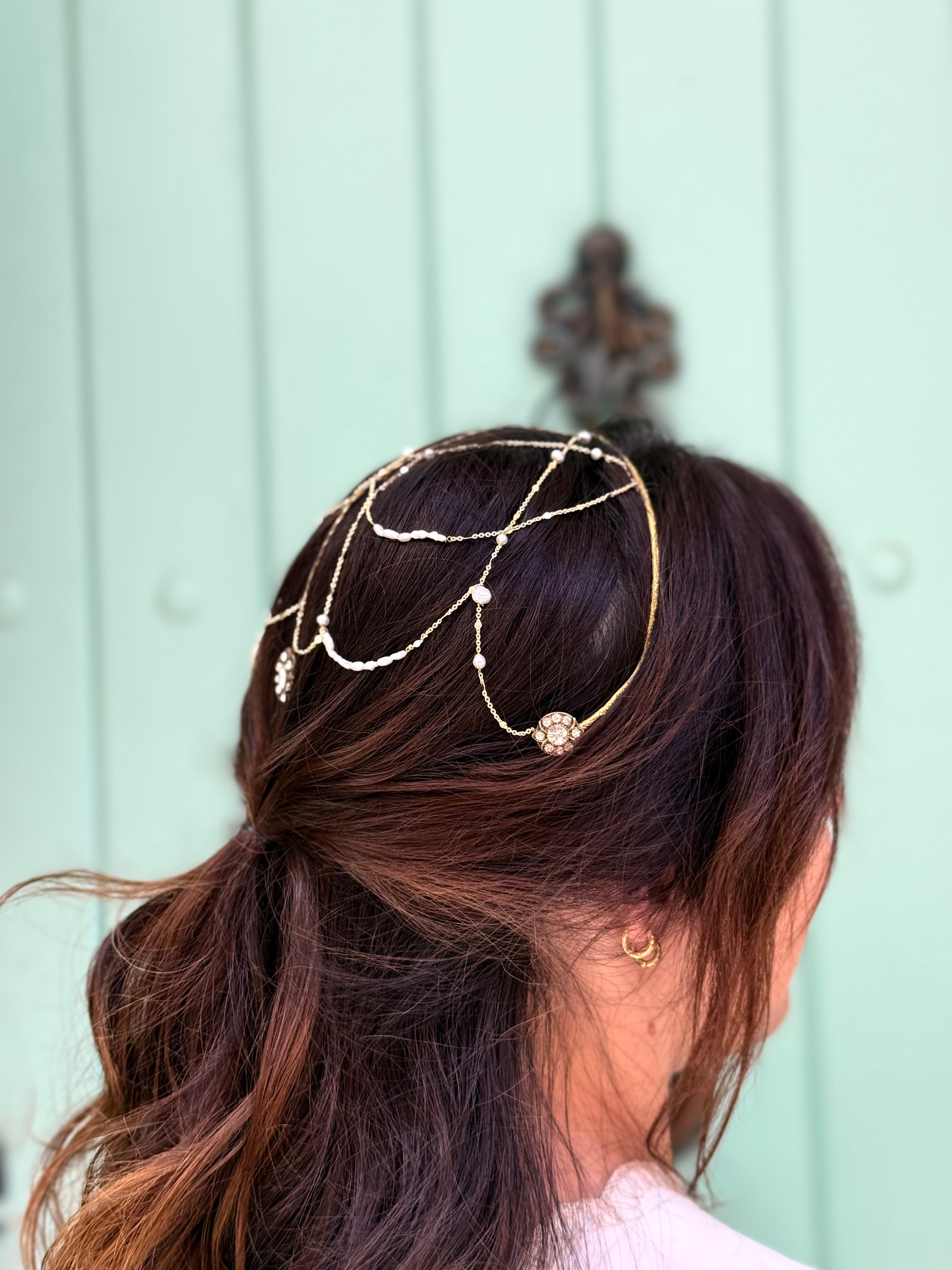 Un casquete joya hecho a mano en nuestro taller, con perlas de río seleccionadas una a una y delicadas cadenas doradas que se entrelazan como si fueran parte del peinado.