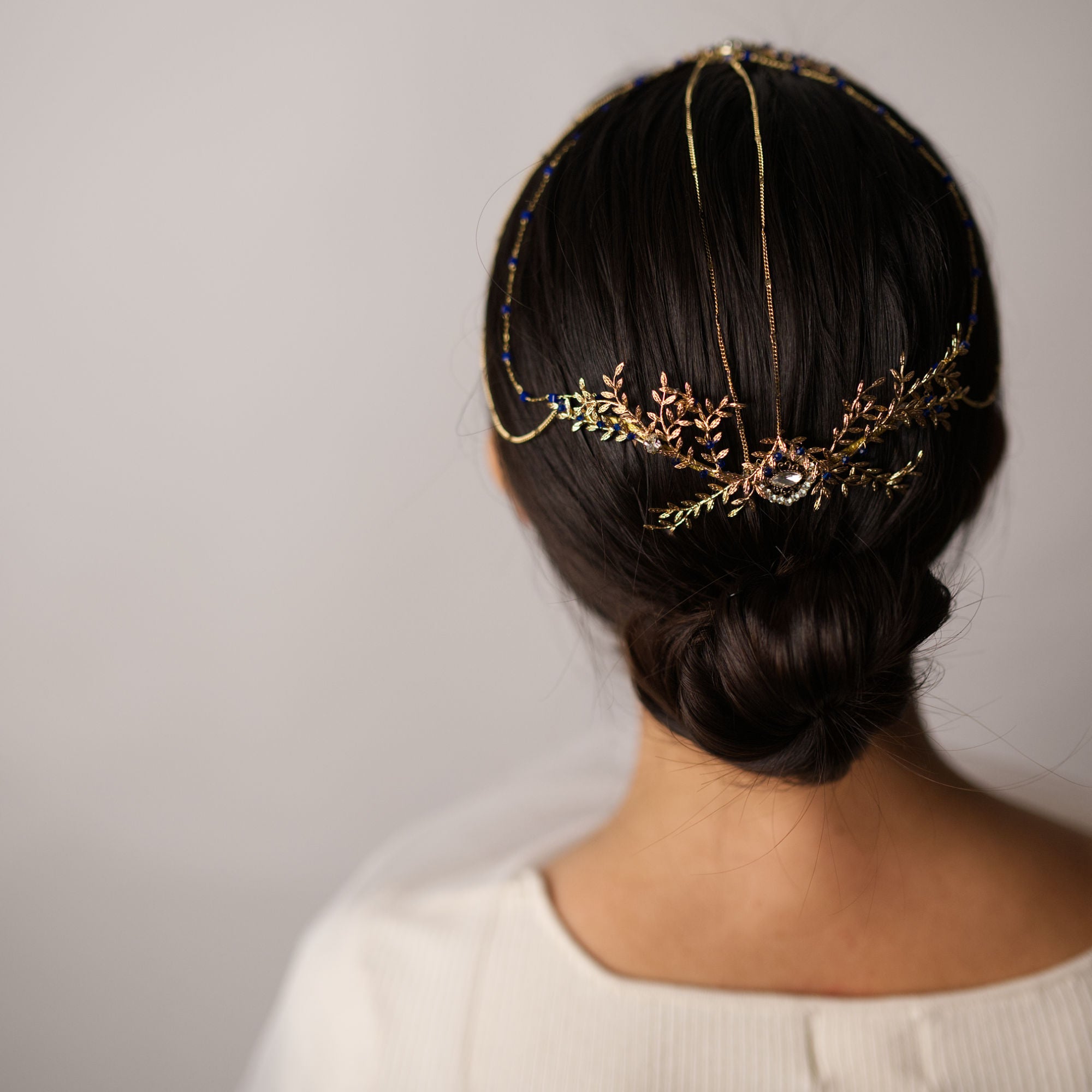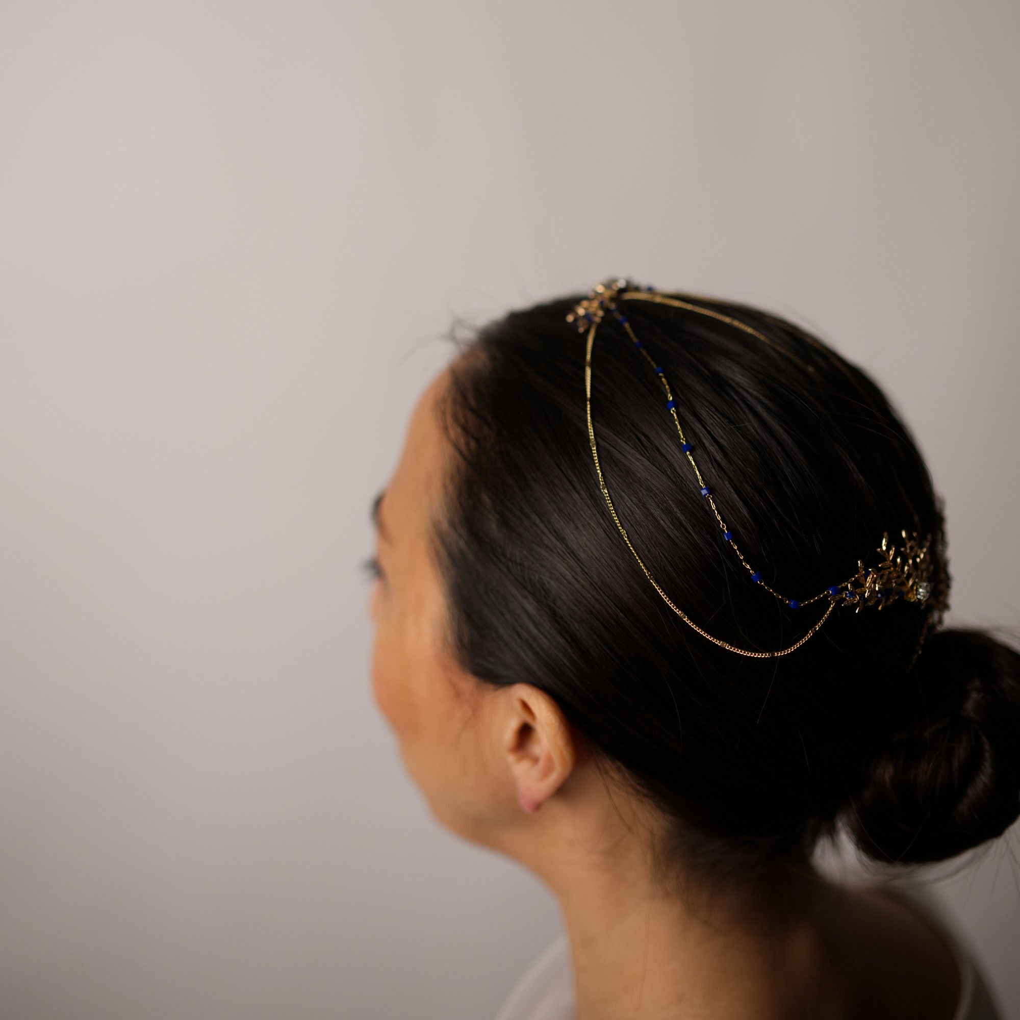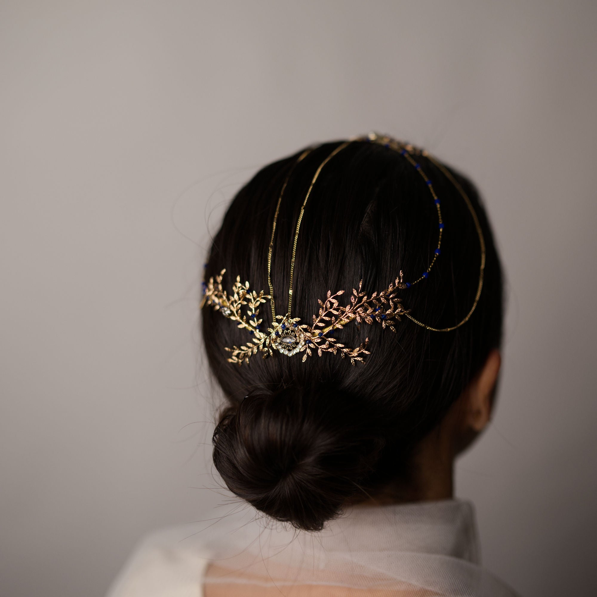 Saula es una pieza joya de diseño exclusivo, elaborada a mano con una estética orgánica y sofisticada. Su composición combina delicadas ramas y hojas joya, creando una estructura armoniosa y elegante que envuelve la cabeza con sutileza.