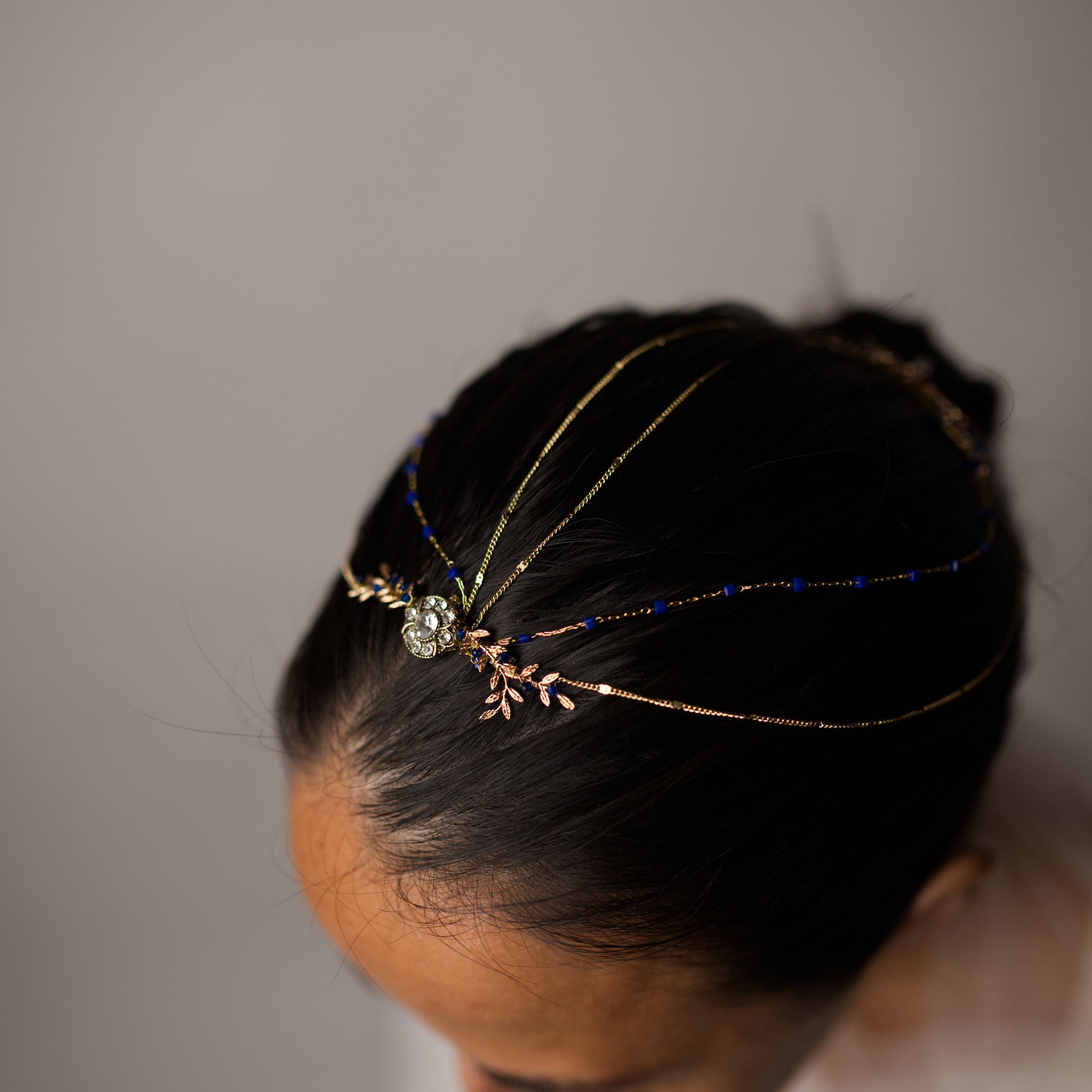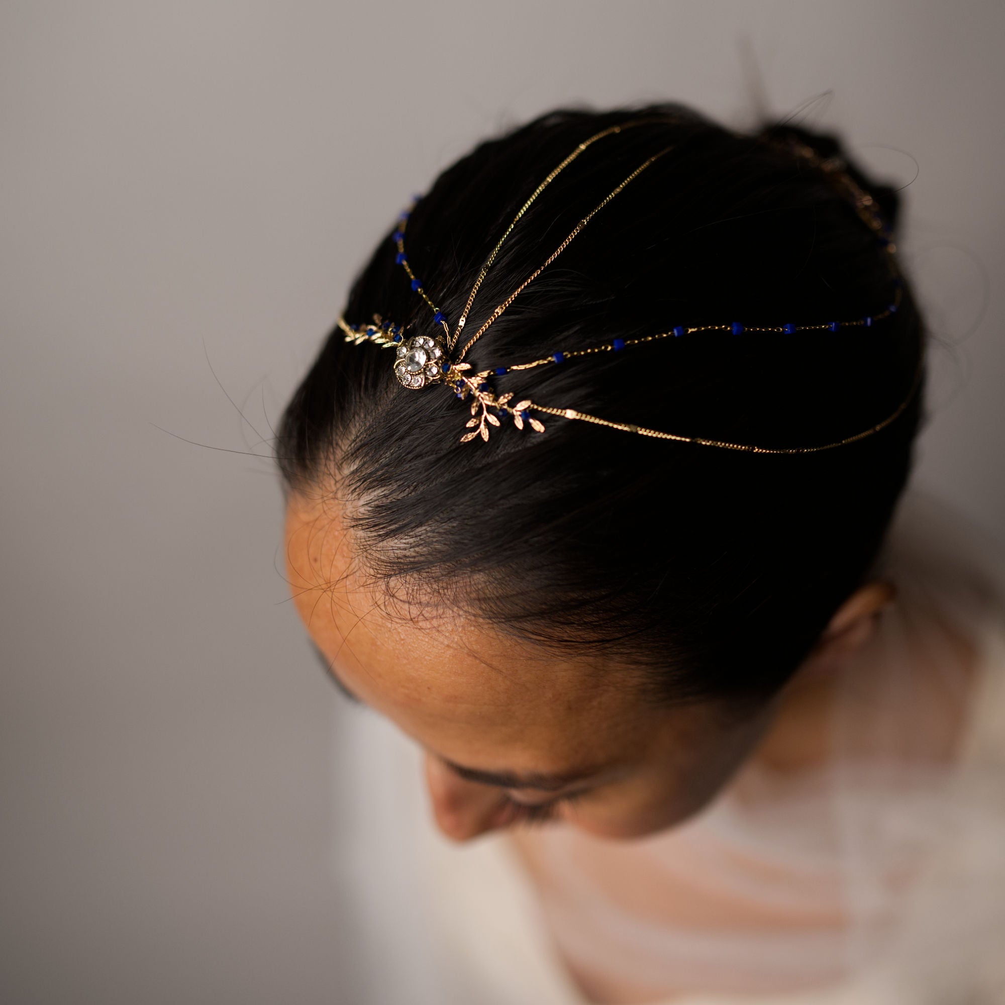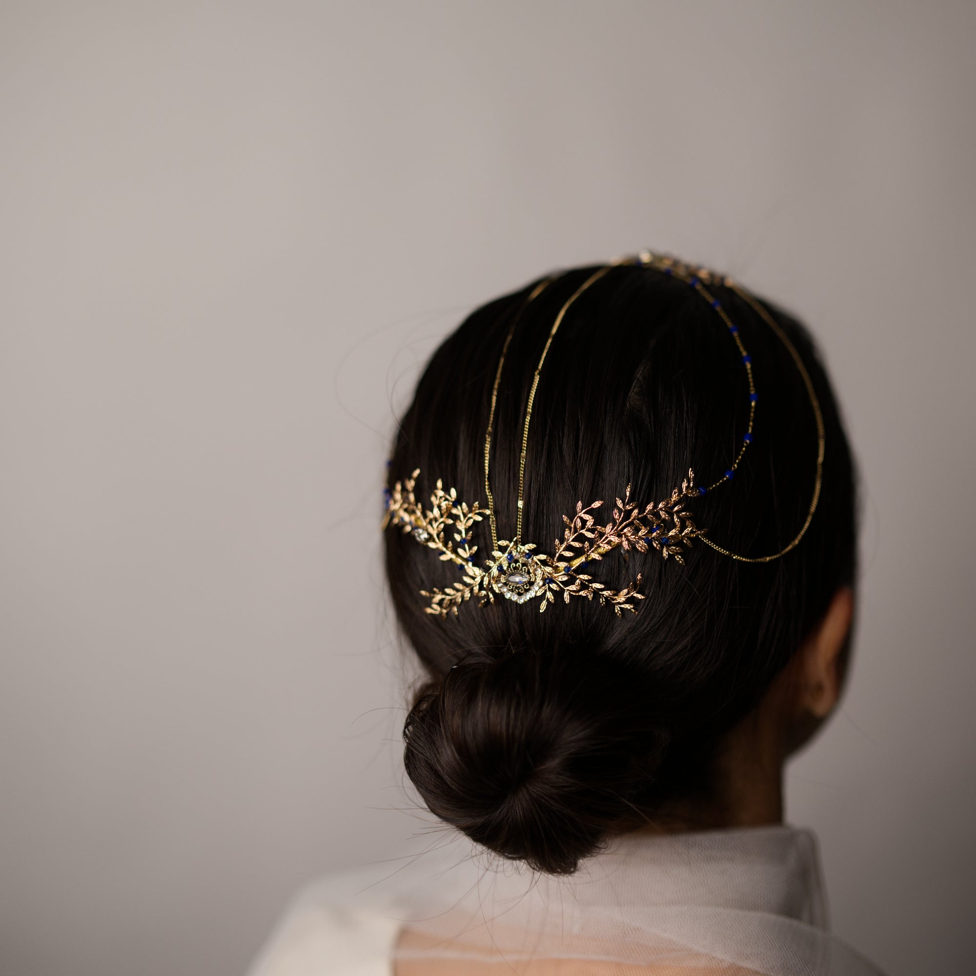 Saula es una pieza joya de diseño exclusivo, elaborada a mano con una estética orgánica y sofisticada. Su composición combina delicadas ramas y hojas joya, creando una estructura armoniosa y elegante que envuelve la cabeza con sutileza.
