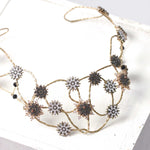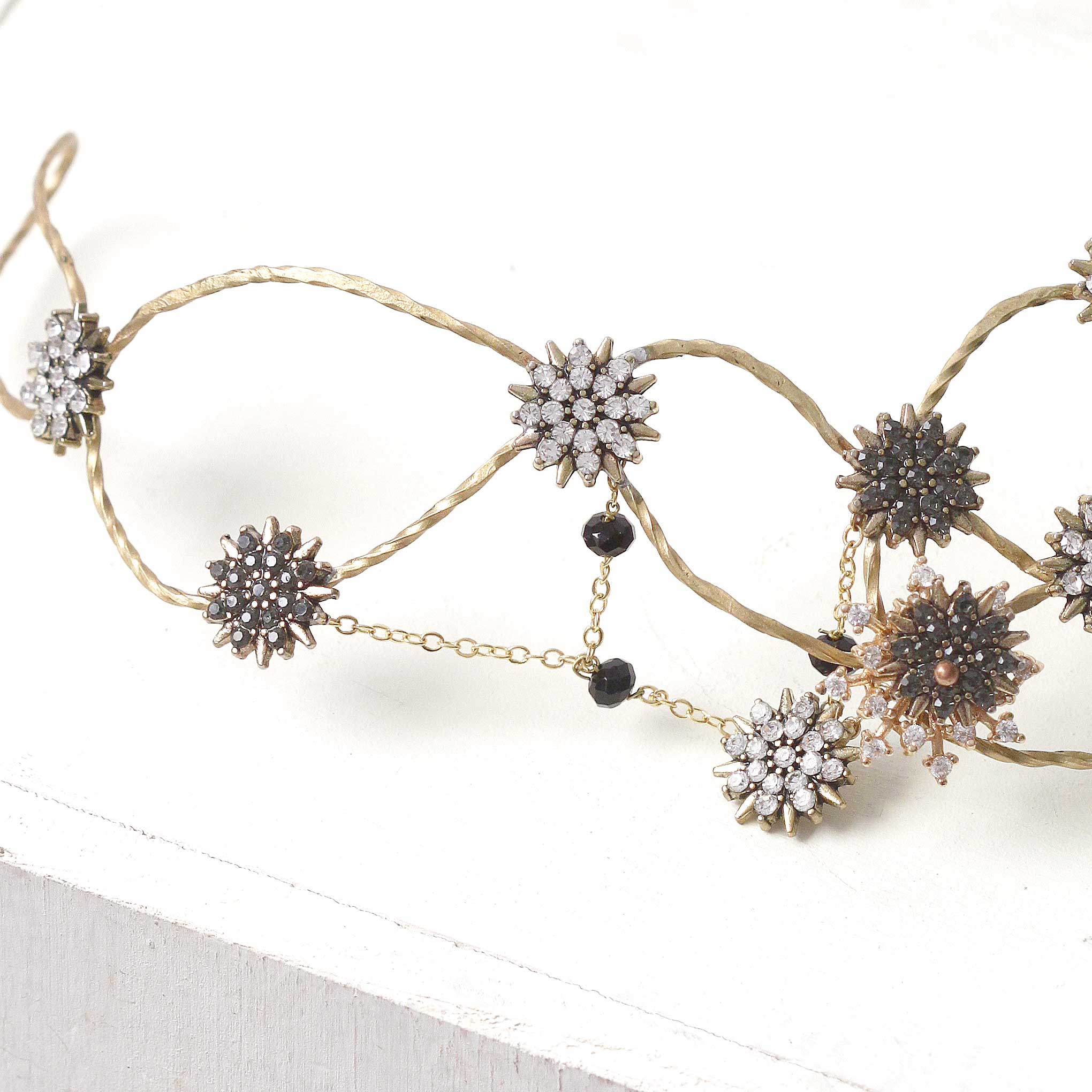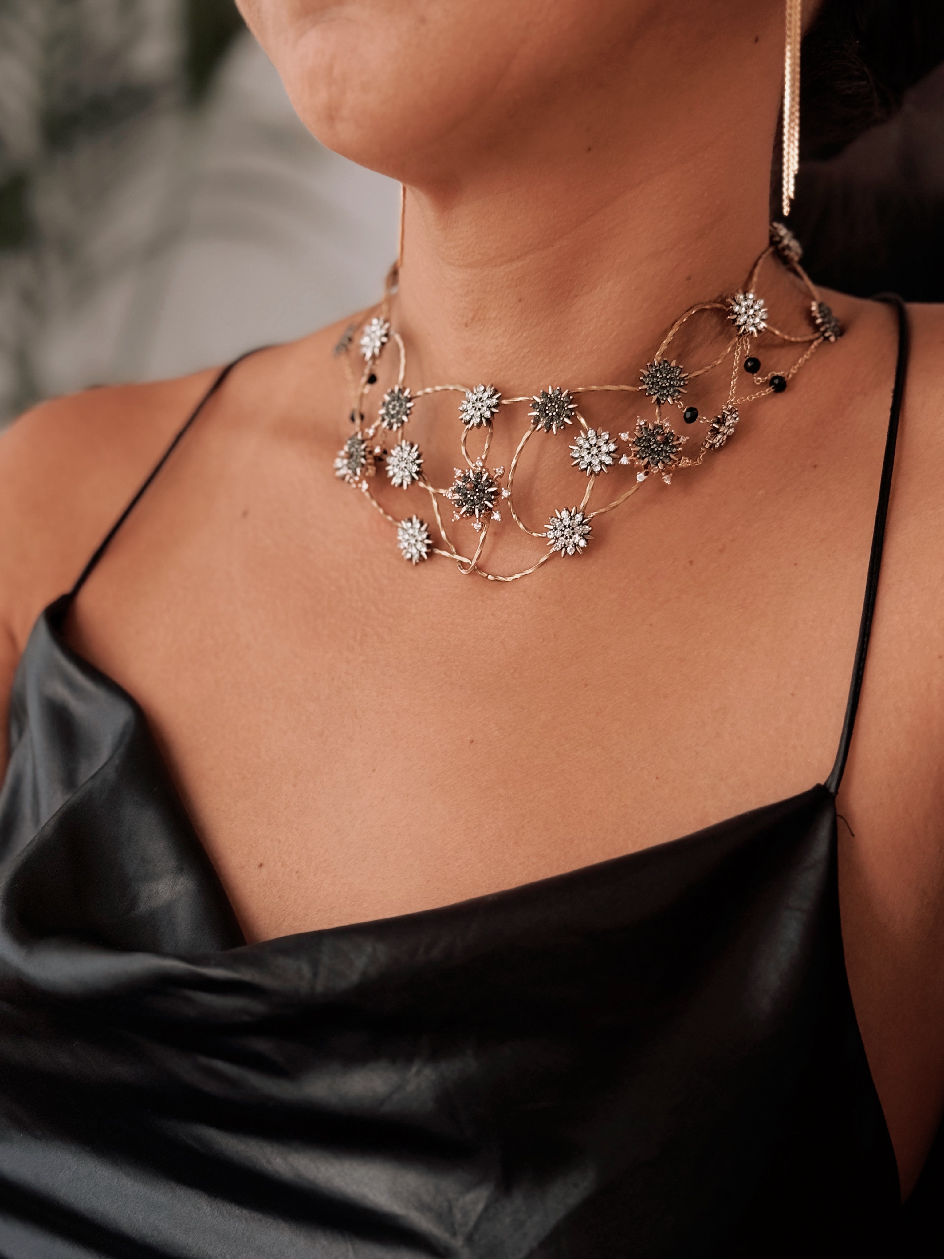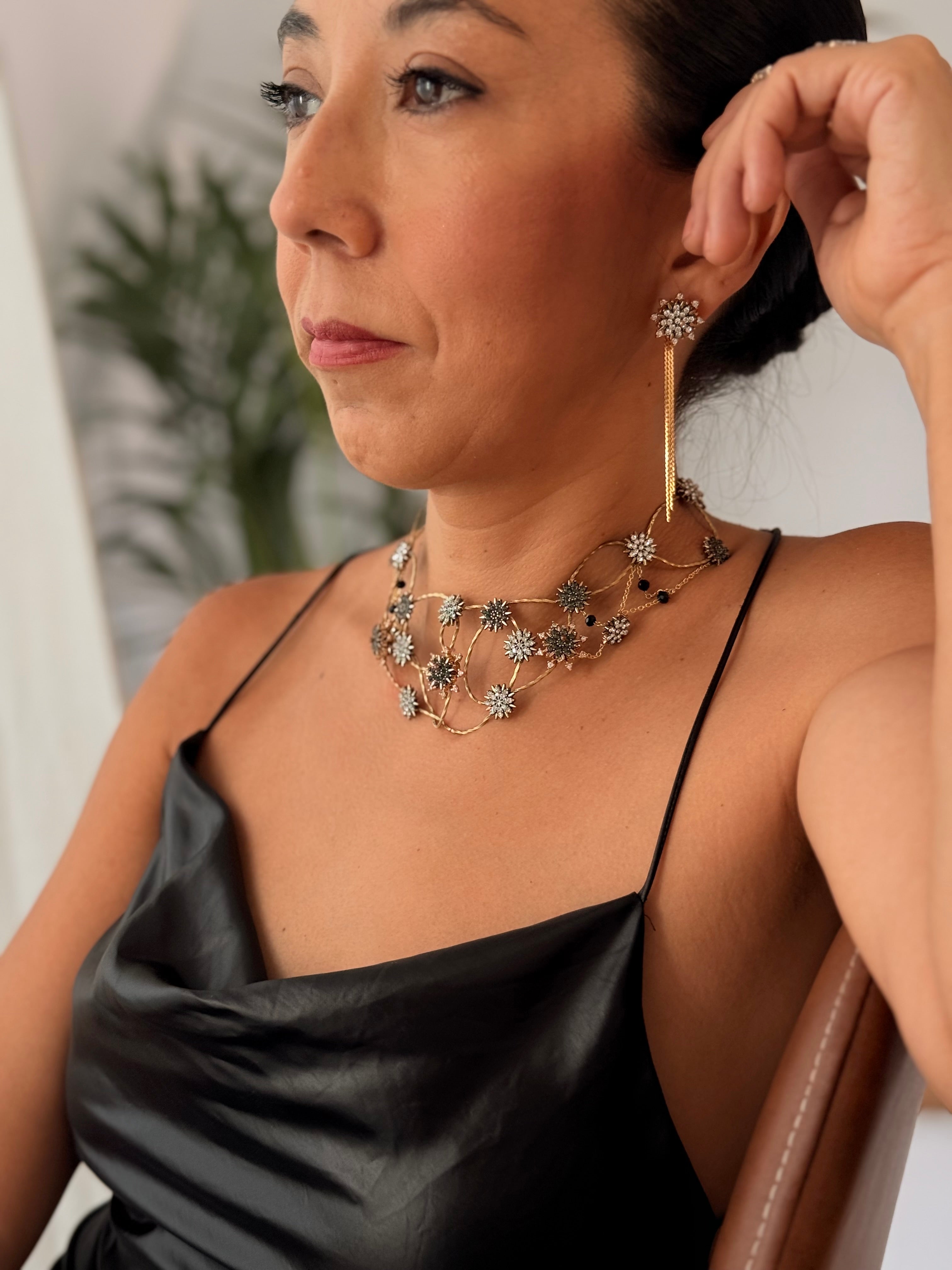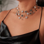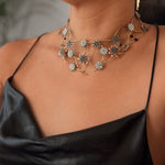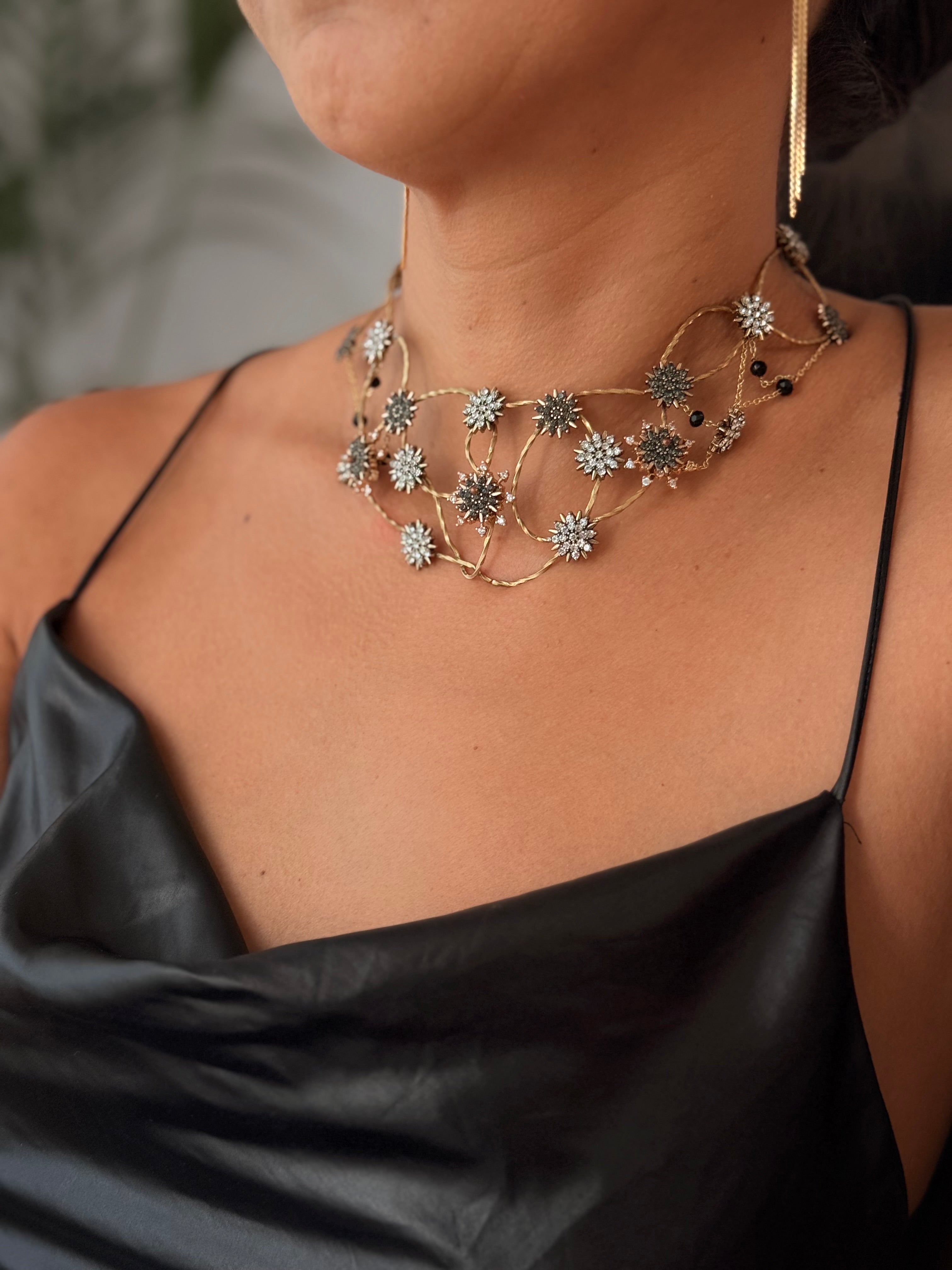 Los pequeños soles y estrellas de cristal incrustado iluminan el choker como si fueran destellos de un firmamento infinito, envolviendo el cuello con la elegancia y el misterio del cielo estrellado.