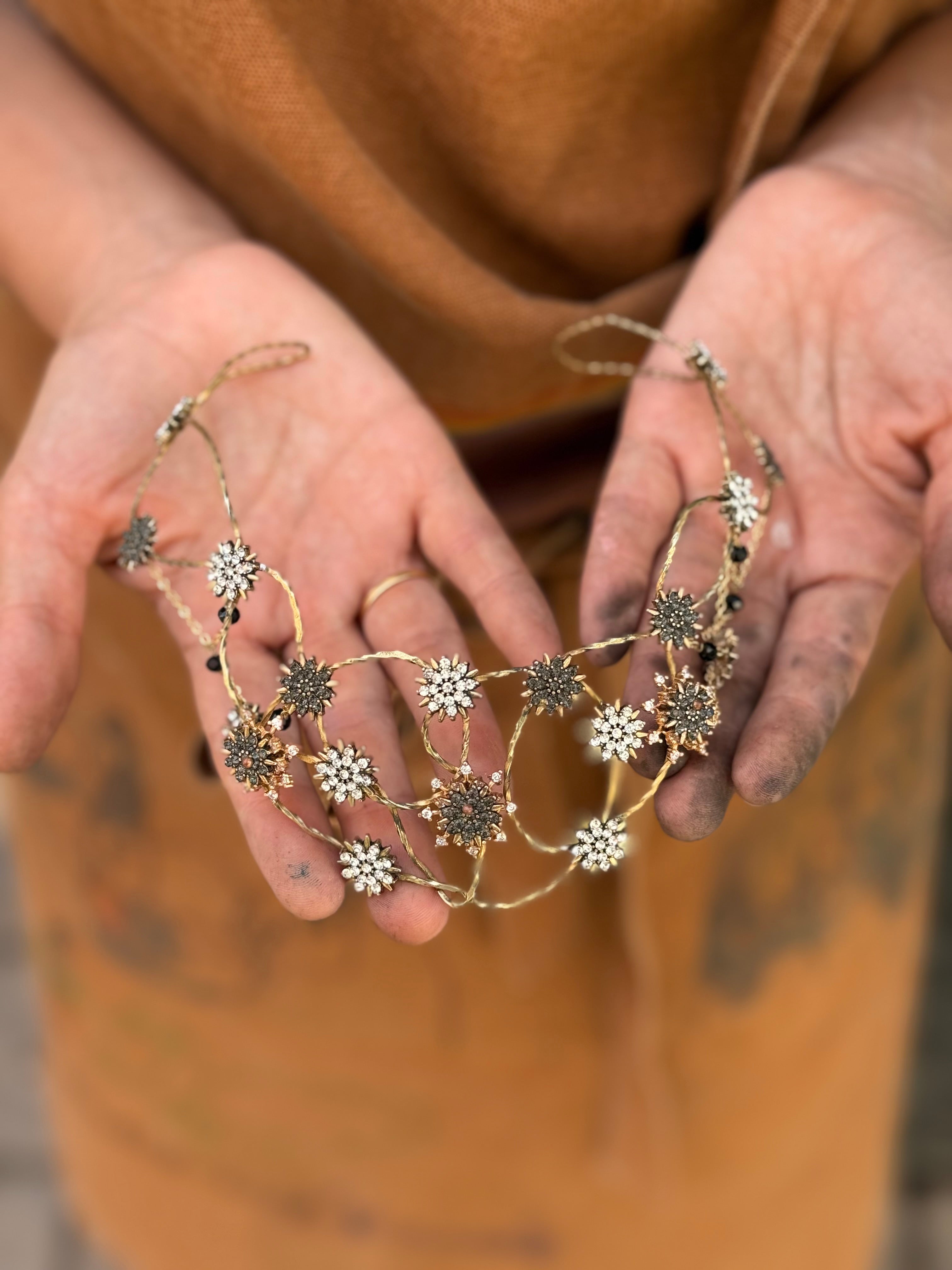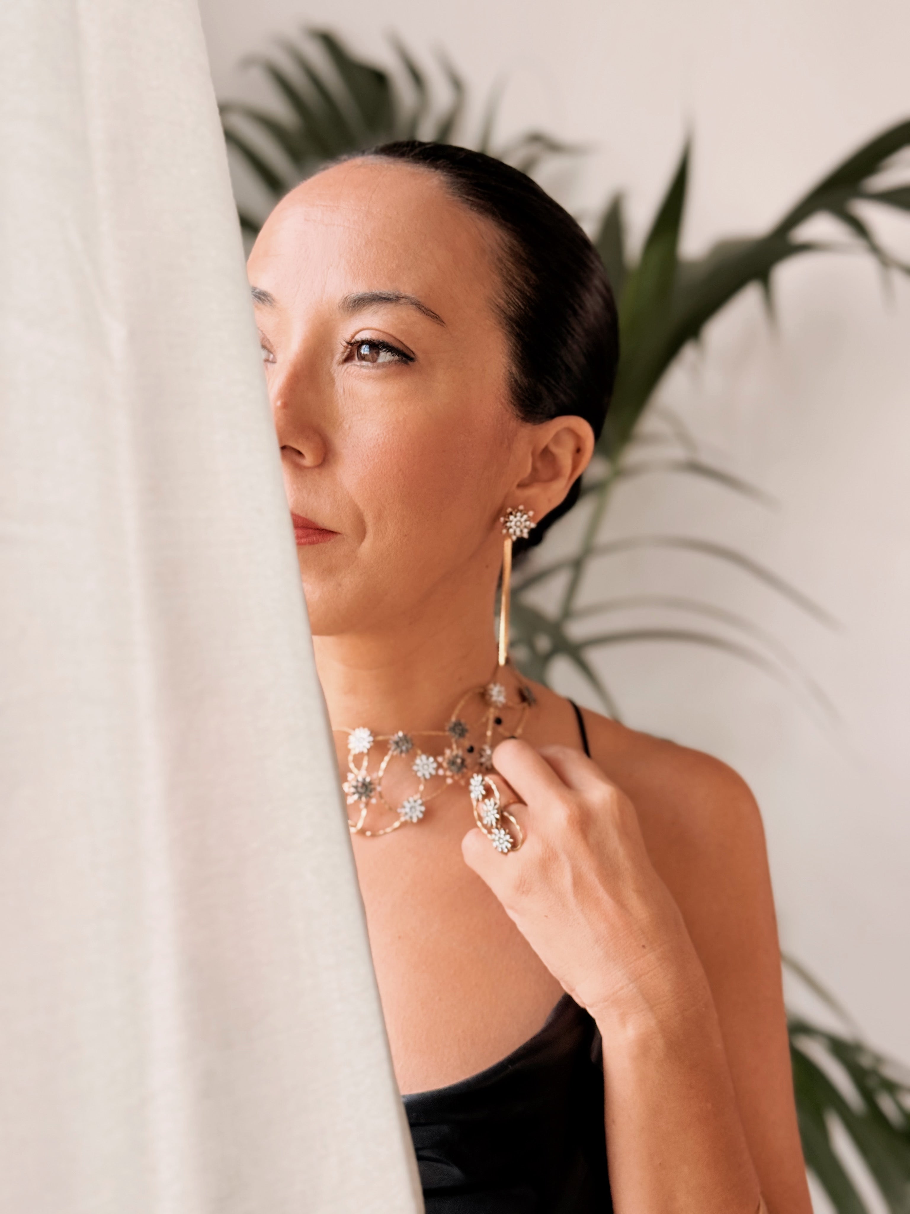 Un diseño único, hecho a mano, donde el metal entrelazado y enredado se convierte en el lienzo perfecto para capturar la magia de la noche. Cada pieza está trabajada con mimo artesanal, creando un delicado juego de volúmenes y texturas.