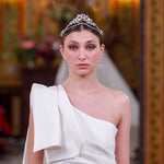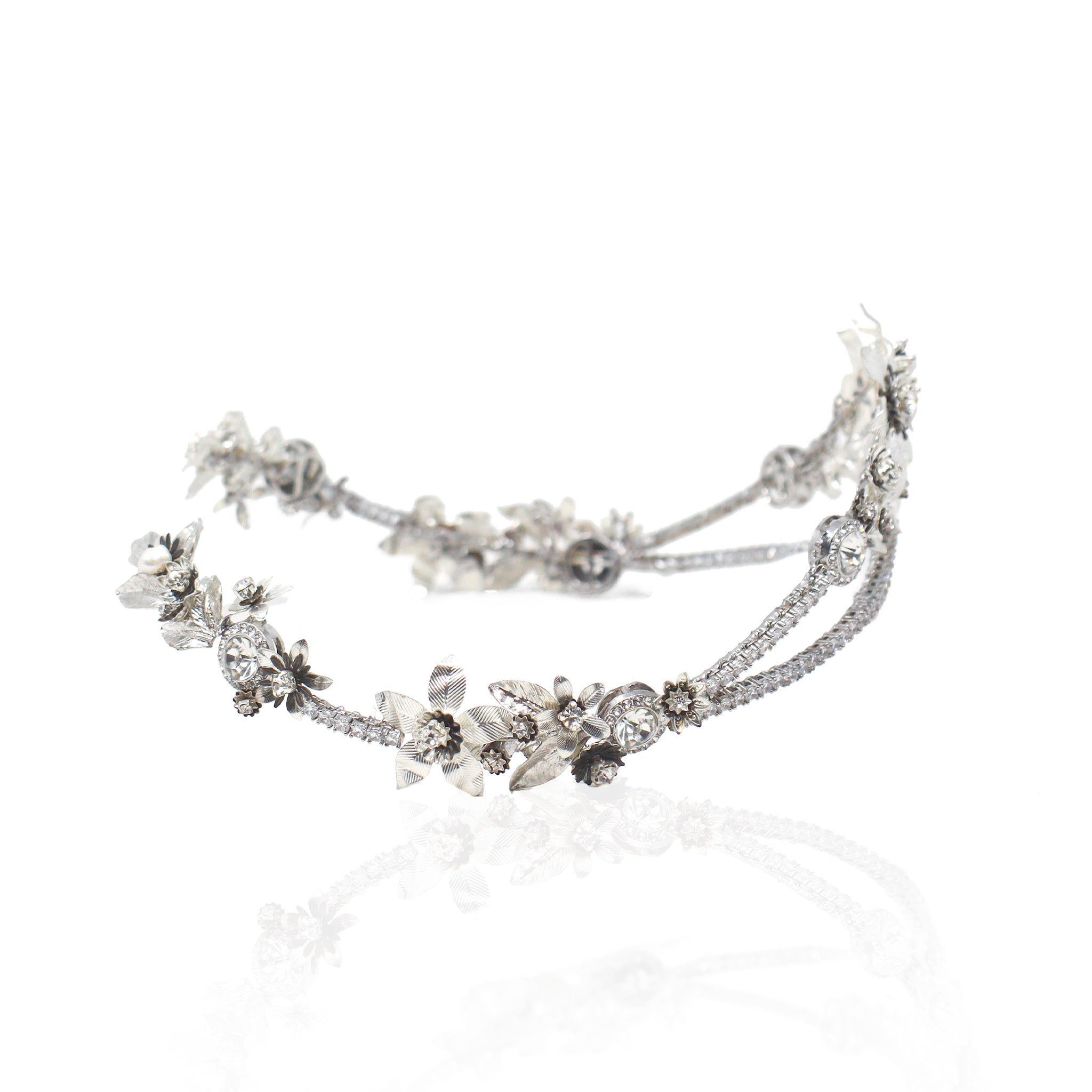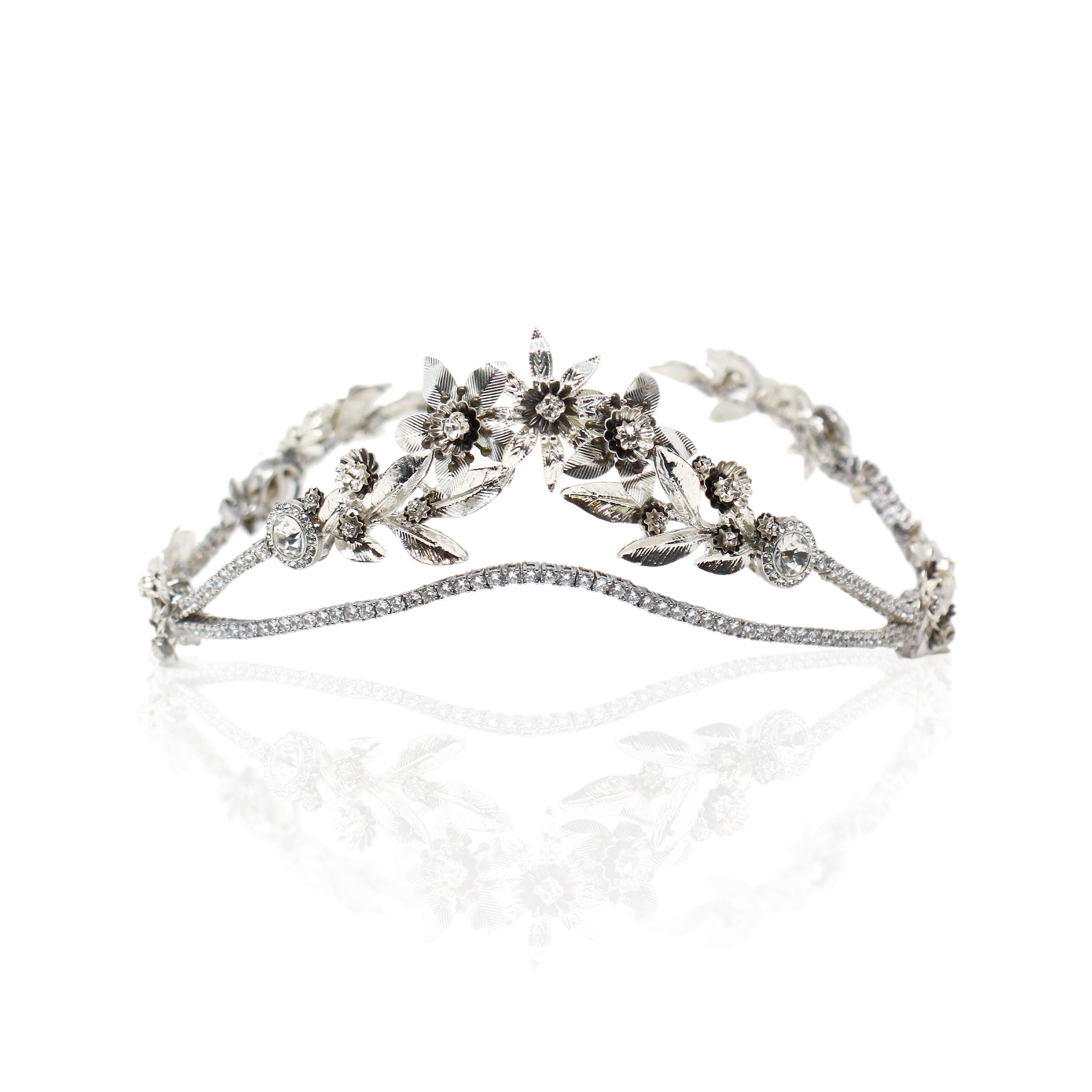 Corona joya en tonos plata con motivos florales totalmente elaborada a mano. Forma delante en forma de pico y parte trasera abierta