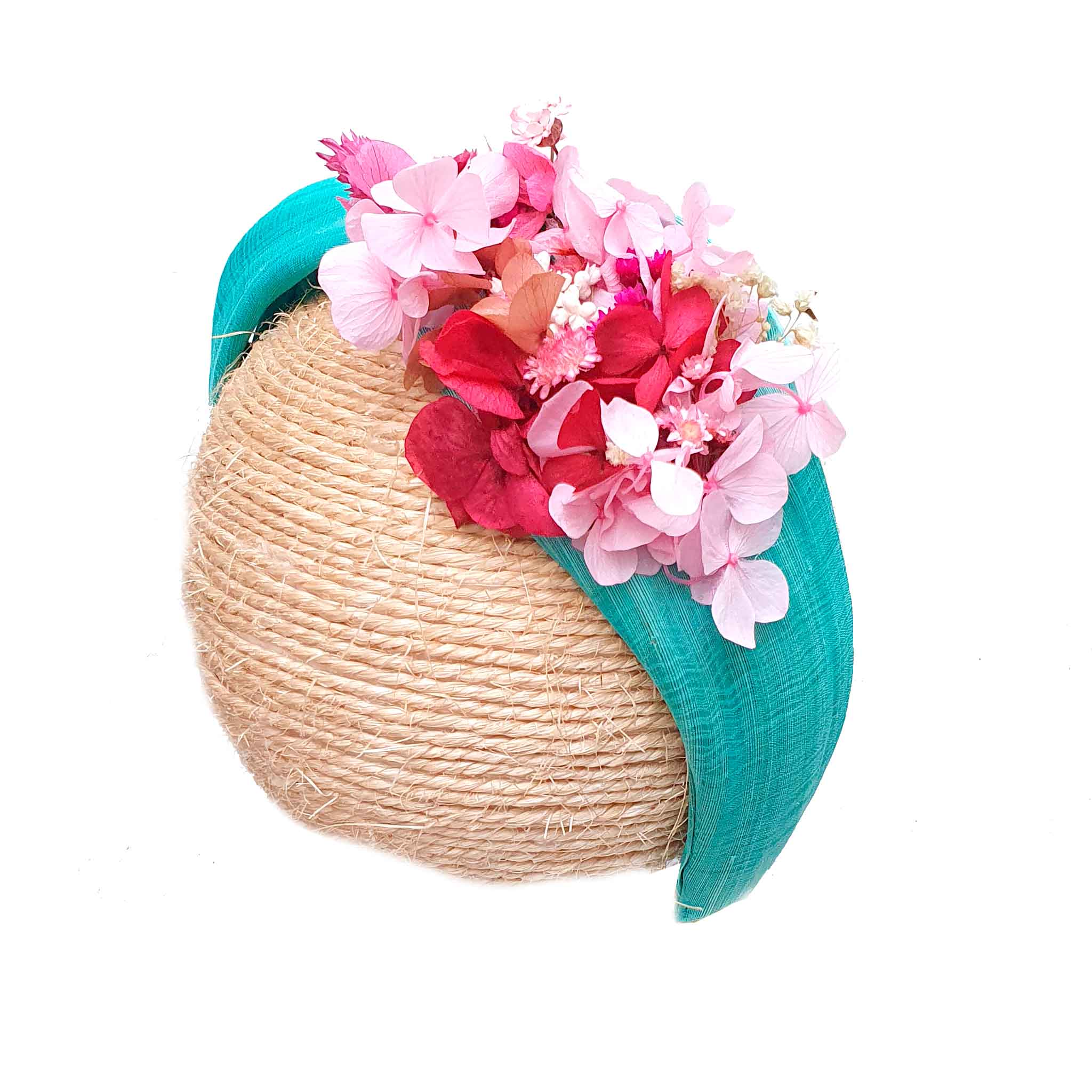 Diadema con diseño cruzado elaborada totalmente a mano son sinamay de color turquesa u oro. Decoración de flores preservadas en uno de sus laterales.