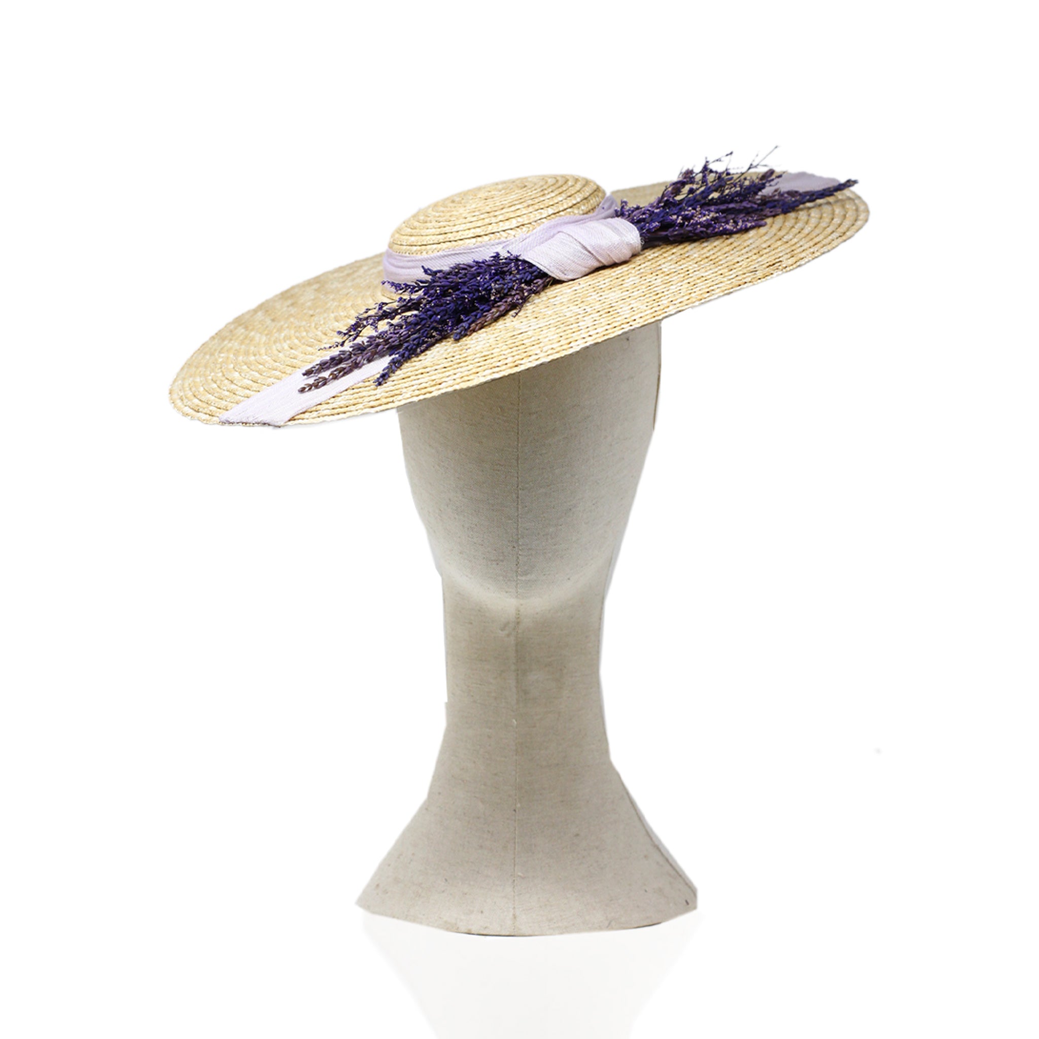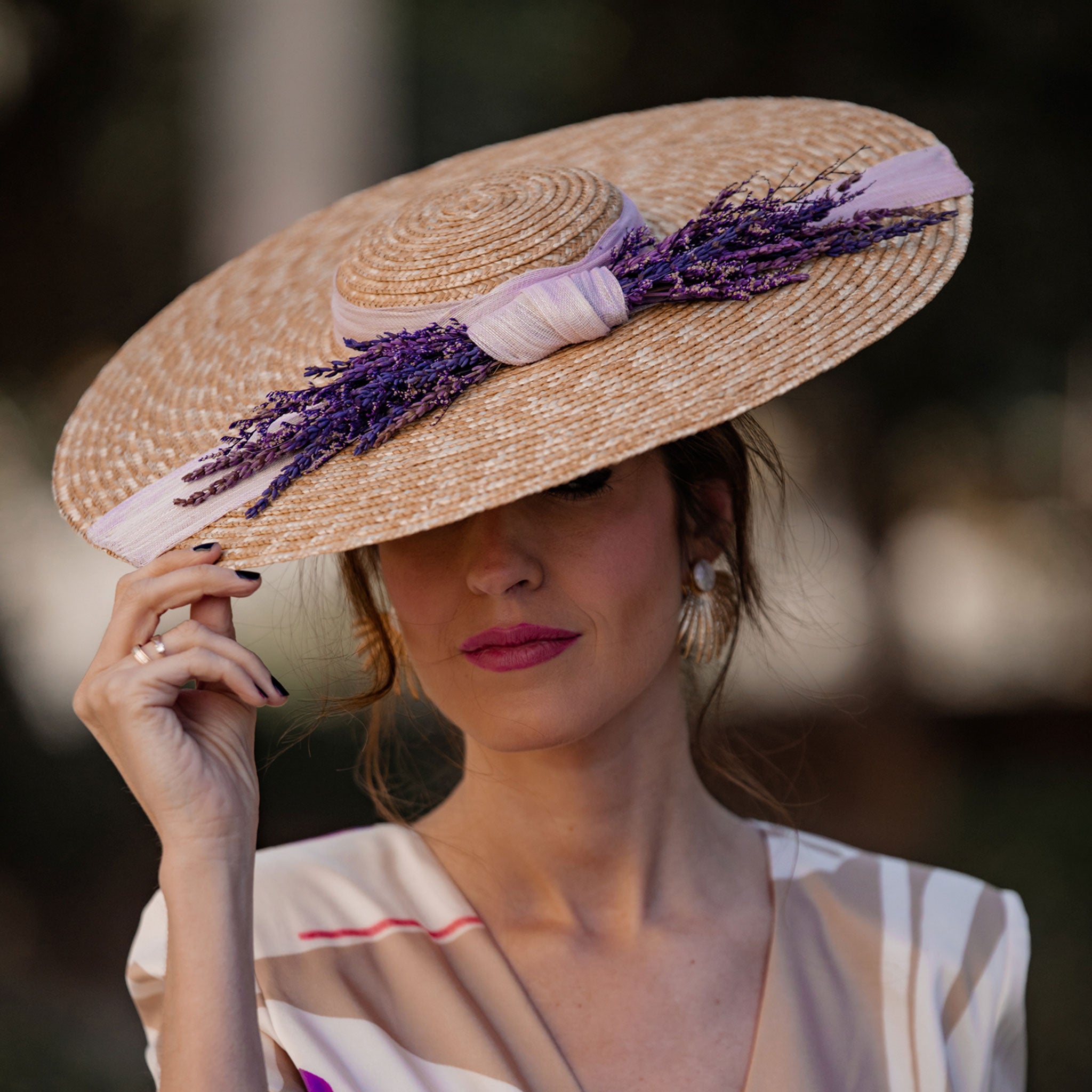 Pamela de paja de tamaño mediano, decorada con tela de sinamay en color lila y terminado con un ramo de lavanda preservada, dándole un toque de color.