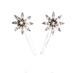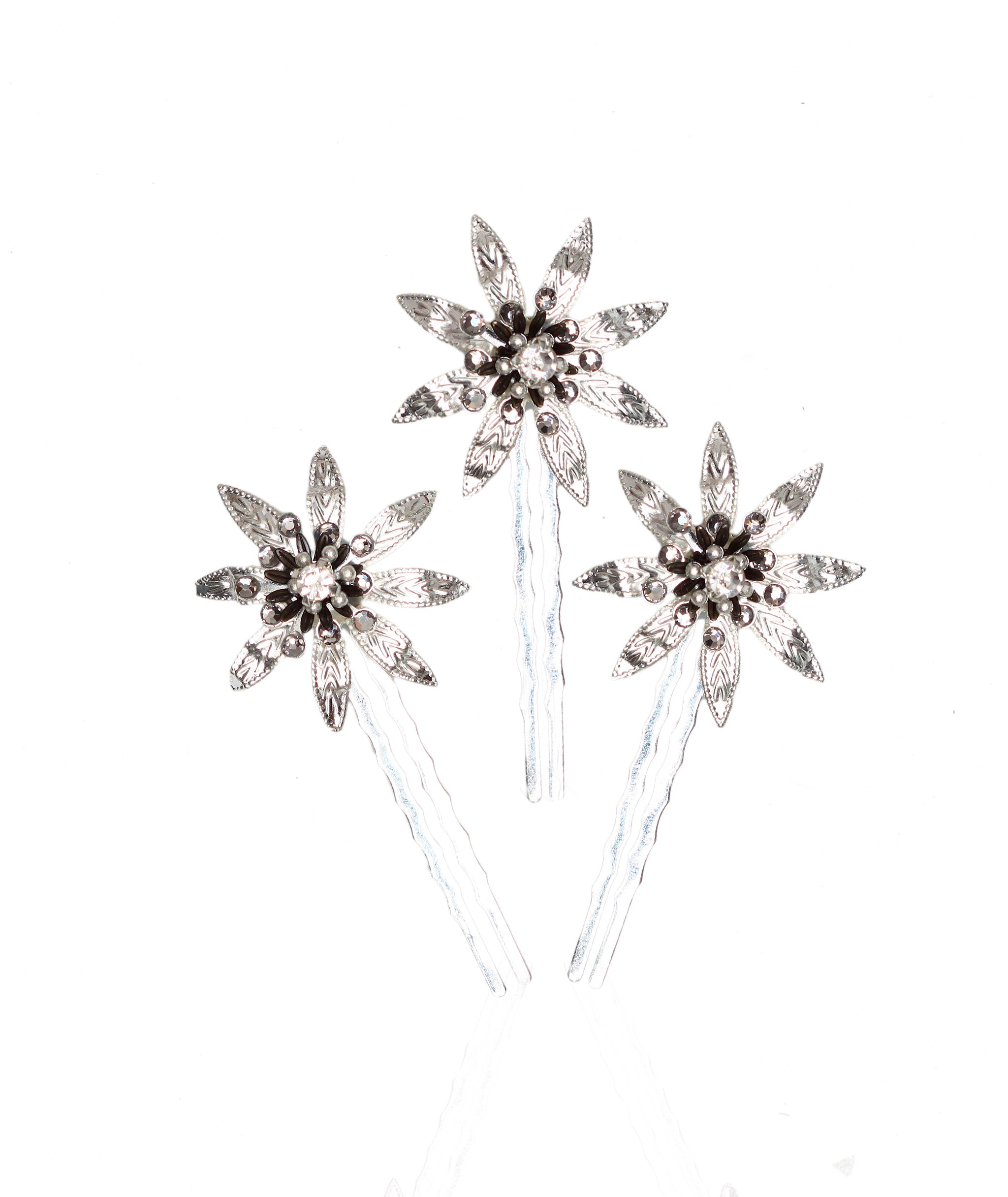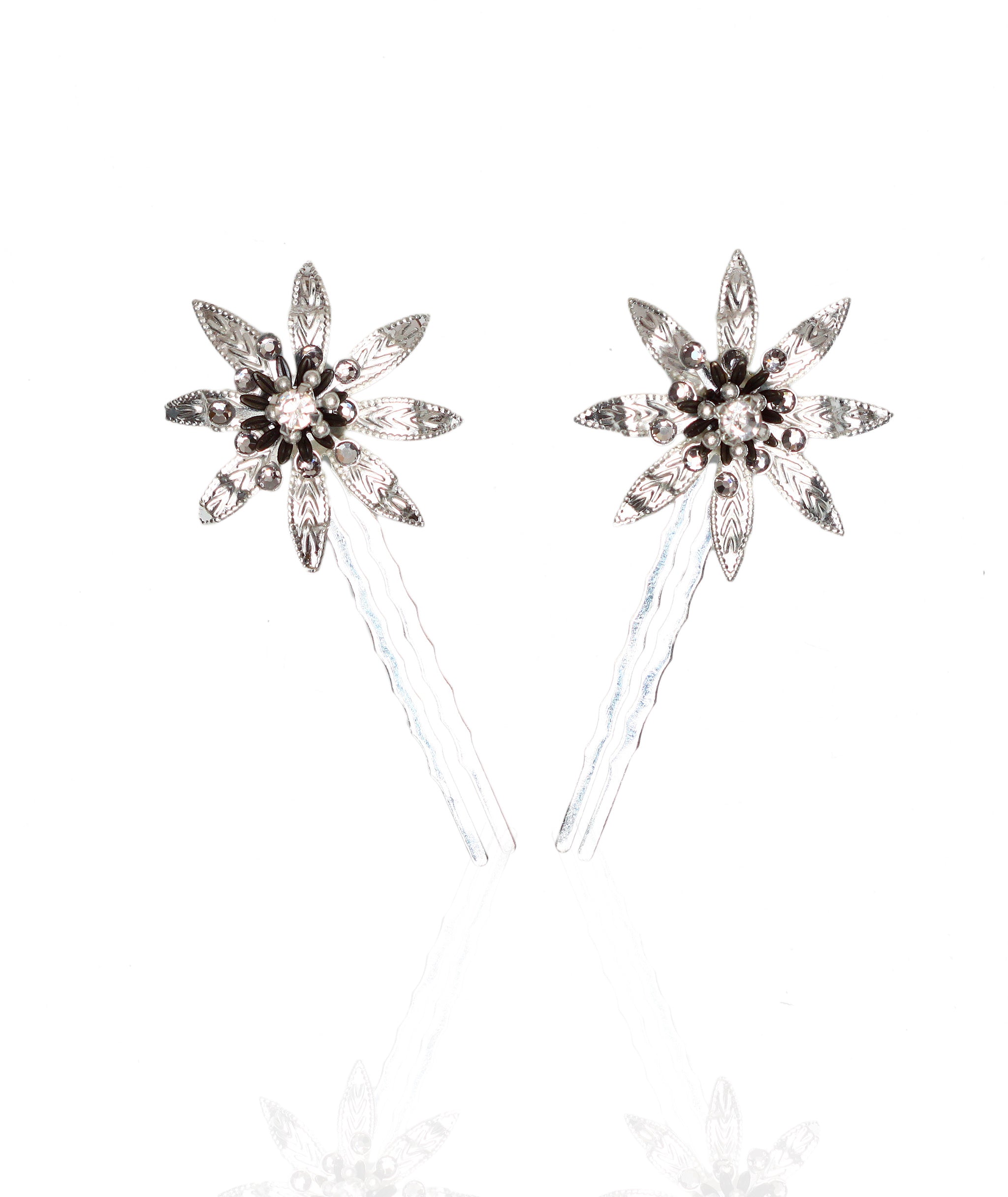 Peinas totalmente elaboradas a mano en tonos platas y con piedrecitas en negro con motivos florales.
