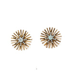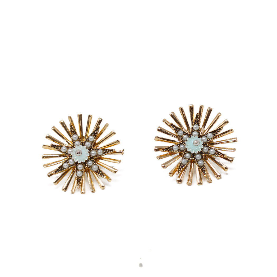 Pendientes joya elaborados a mano con piezas doradas esmaltadas y brillantitos en celeste en su centro y alrededor.