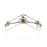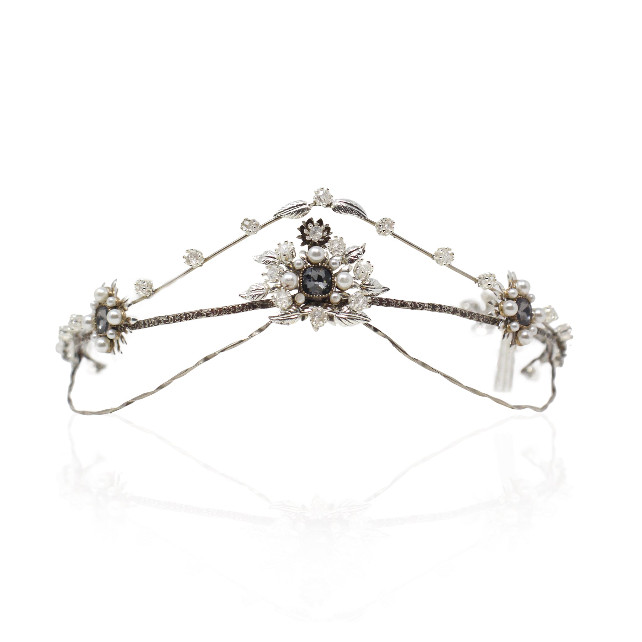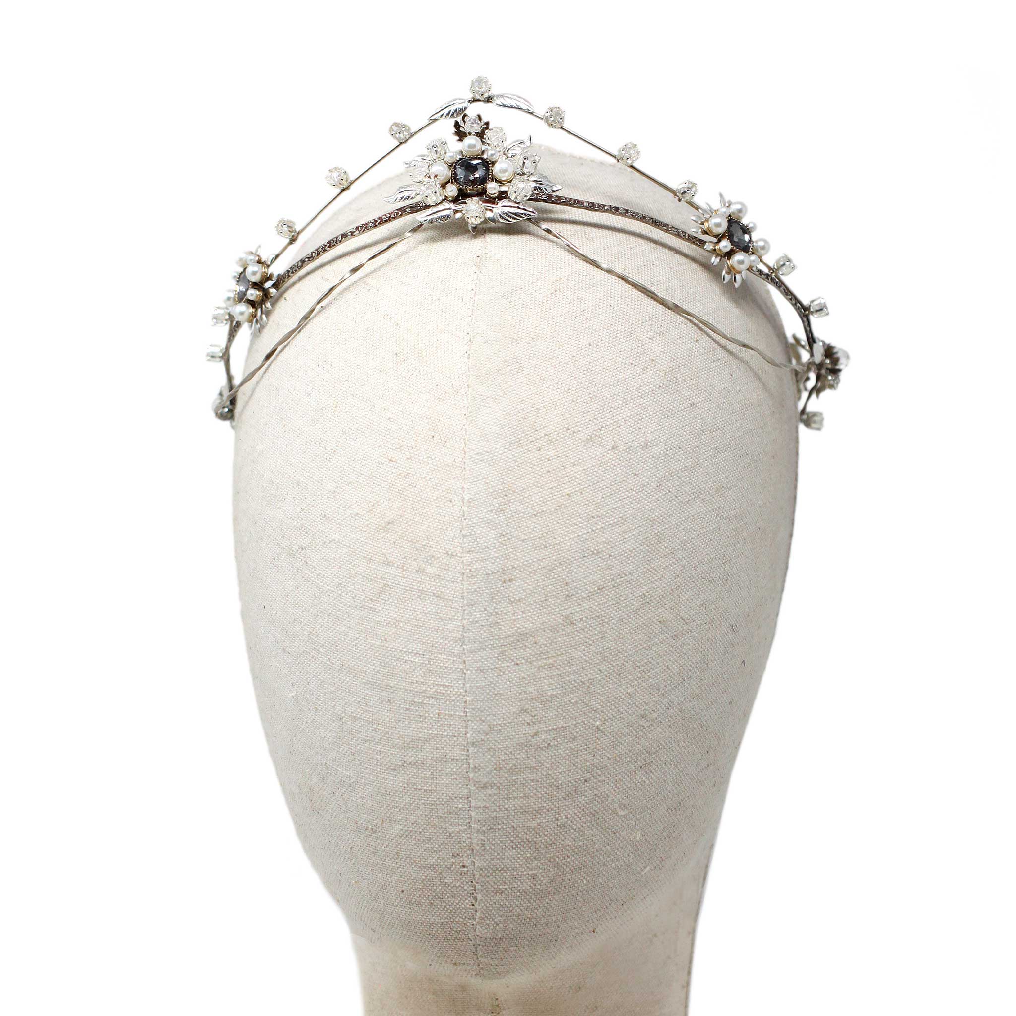 Corona en tonos plata totalmente elaborada a mano. Diseño en forma de pico en su parte frontal y abierta por la trasera.