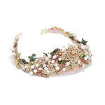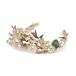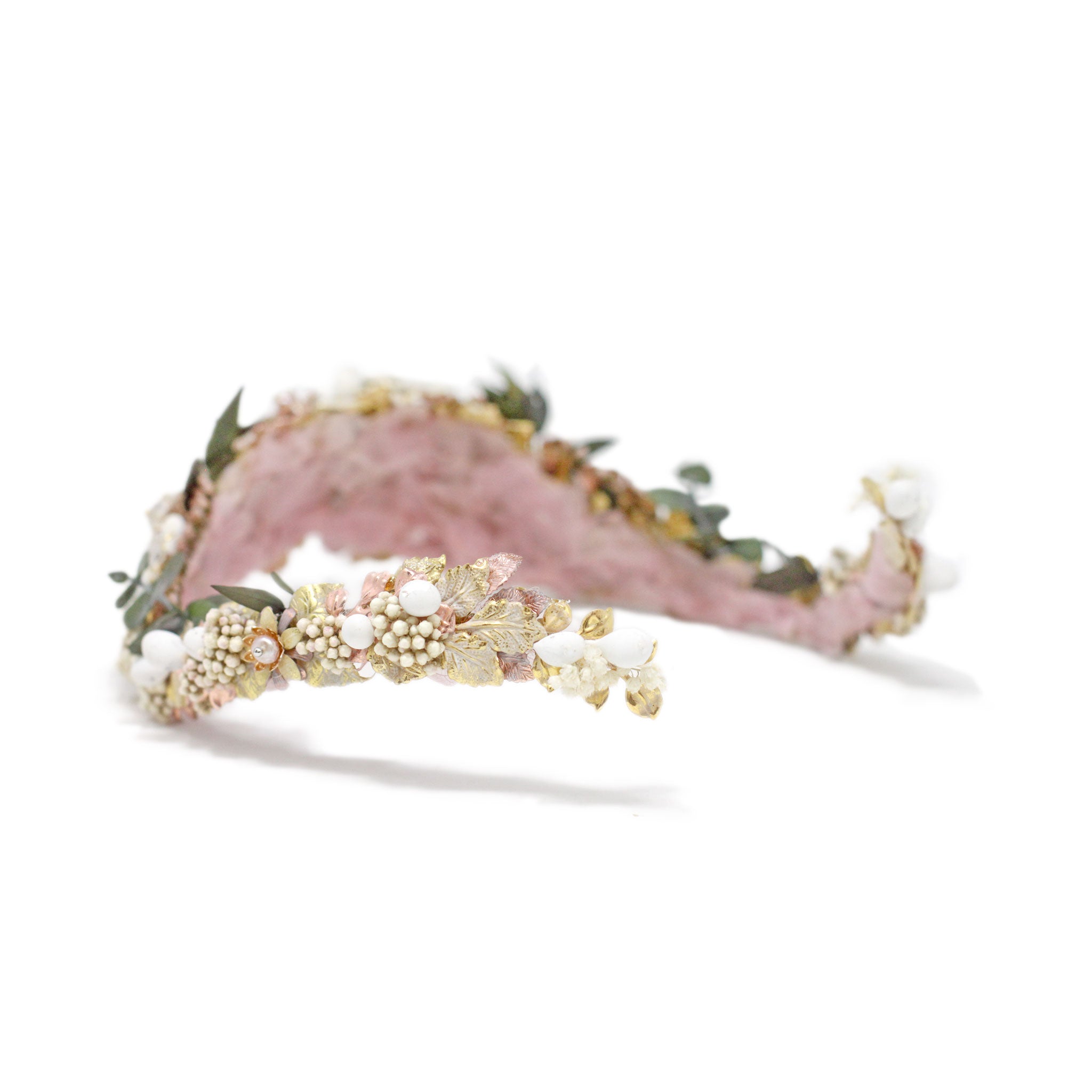 Corona totalmente elaborada a mano a base de pistilos y flores preservadas en tonos pastel con una pieza joya en forma de flor en la parte central. Su acabado en forma de pico aportarán altura a tu look y por lo tanto lo estilizarán.
