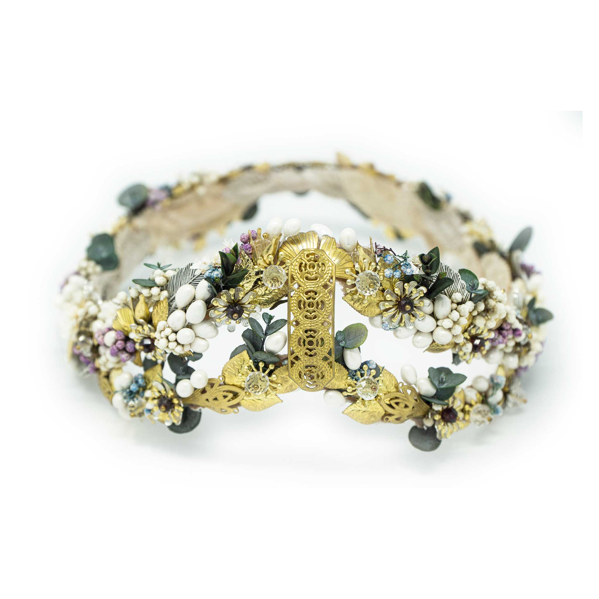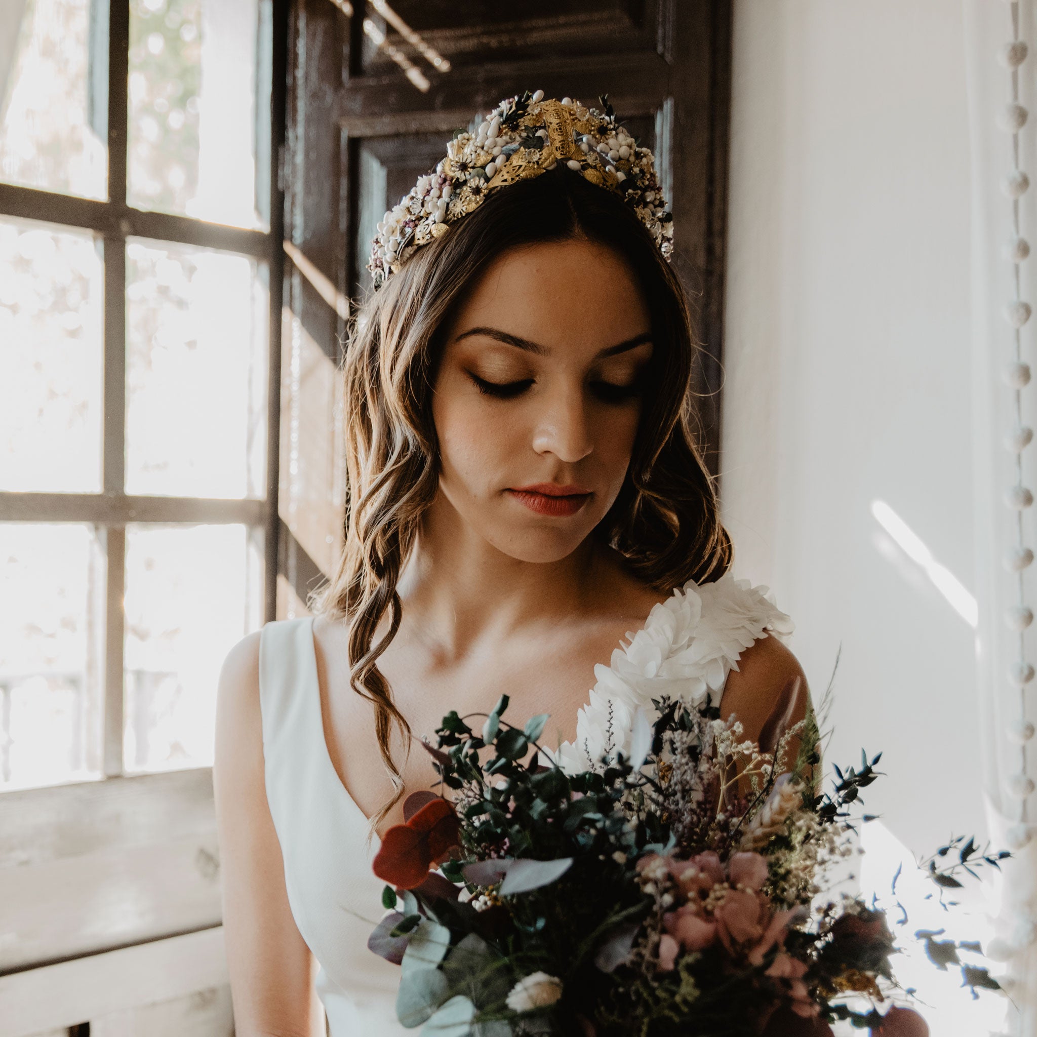 Corona totalmente elaborada a mano a base de pistilos, piezas joya en dorado y flores preservadas. Su forma acabada en pico en la parte central hacen que aporte altura y por lo tanto estilice tu look de novia.
