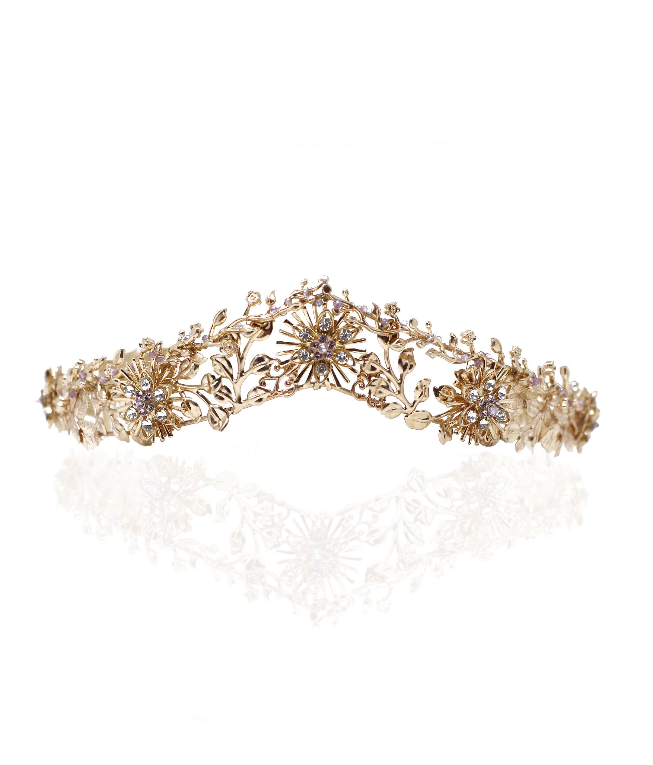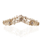 Corona tipo joya en tonos dorados y oro rosa combinada con piedras semipreciosas y cristales Swarovski totalmente elaborada a mano. Forma de pico en la parte delantera y abierta por la de atrás.