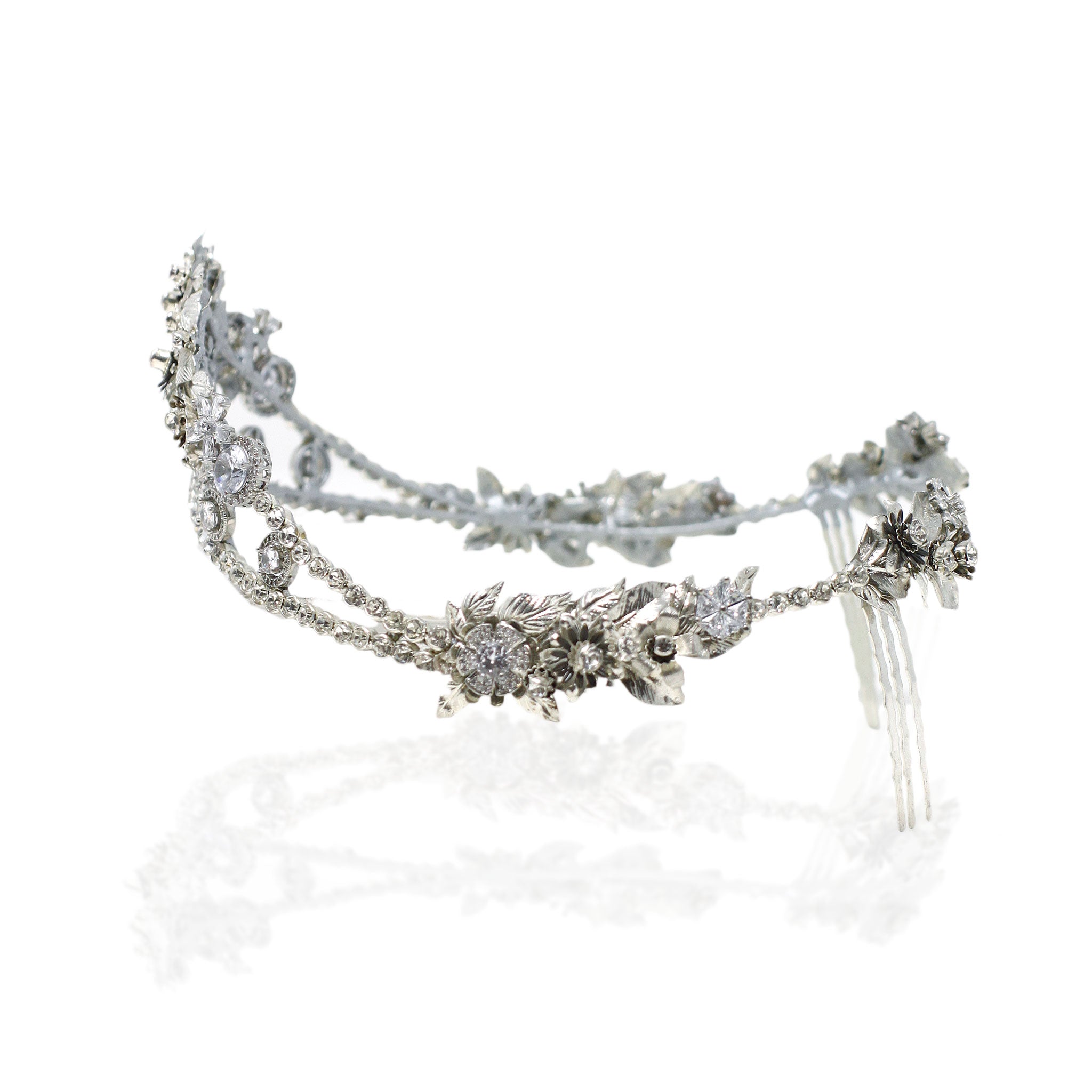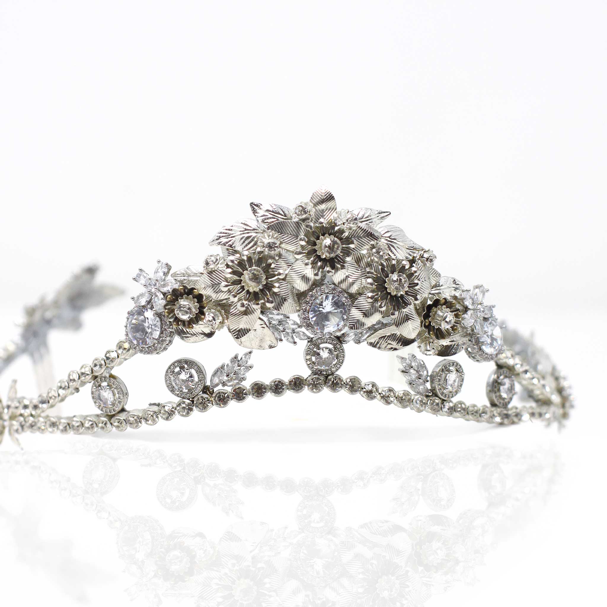 Corona joya en tonos plata con motivos florales totalmente elaborada a mano. Forma delante en forma de pico y parte trasera abierta