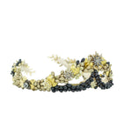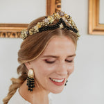 Corona elaborada a mano con pistilos negros y dorados, piezas joya doradas y bronceadas, piedras semipreciosas transparentes y paniculata preservada.