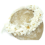 Corona de flores naturales preservadas totalmente personalizable. Elaborada a mano con hortensias en tono marfil, paniculata, mini margaritas blancas y pistilos de porcelana perlados. Terminada con un lazo de terciopelo.