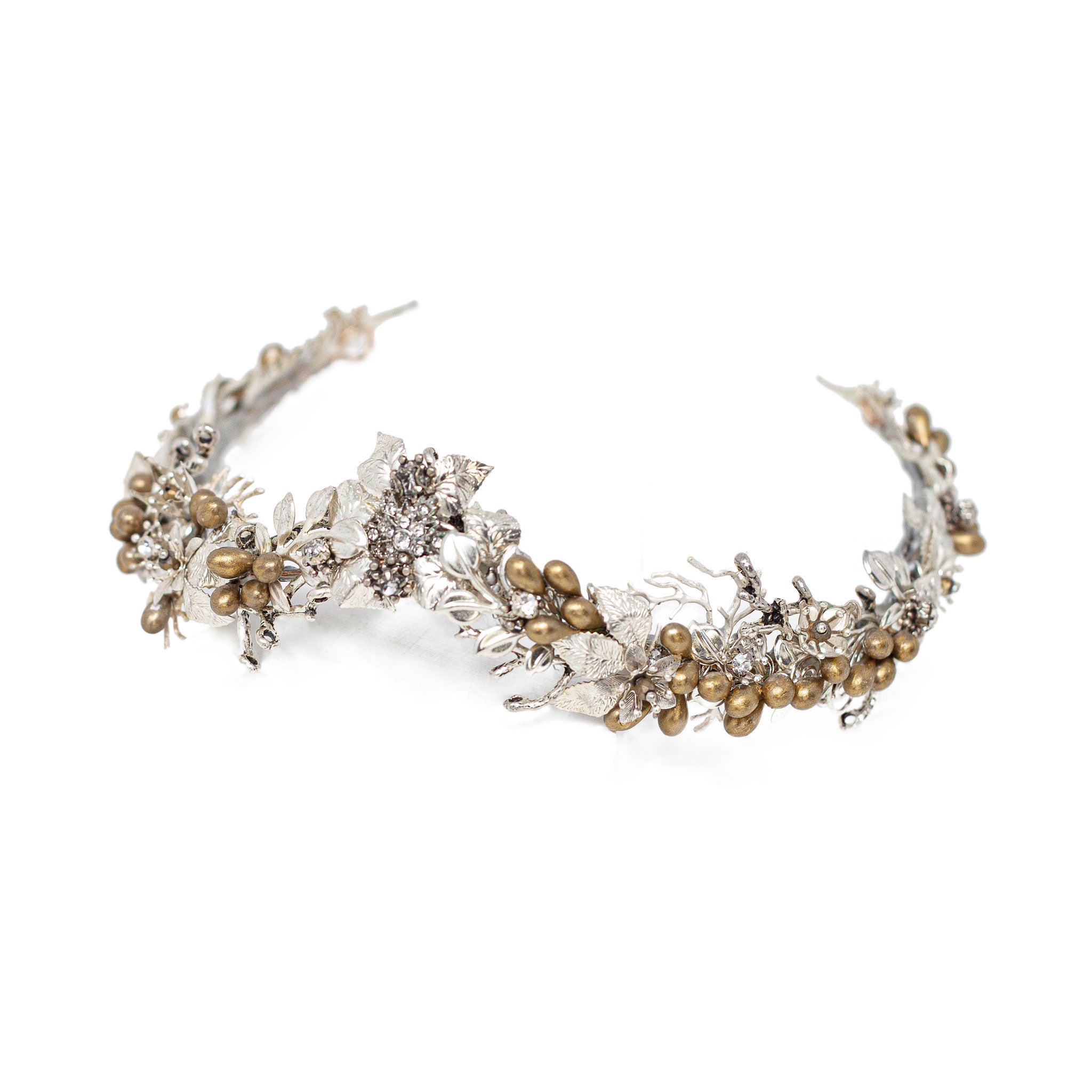 Corona tipo joya totalmente elaborada a mano en tonos plata y con detalles de pistilos dorados finita en tonos plateados con detalles de pistilos dorados. Parte delantera en forma de pico y abierta por la zona de atrás