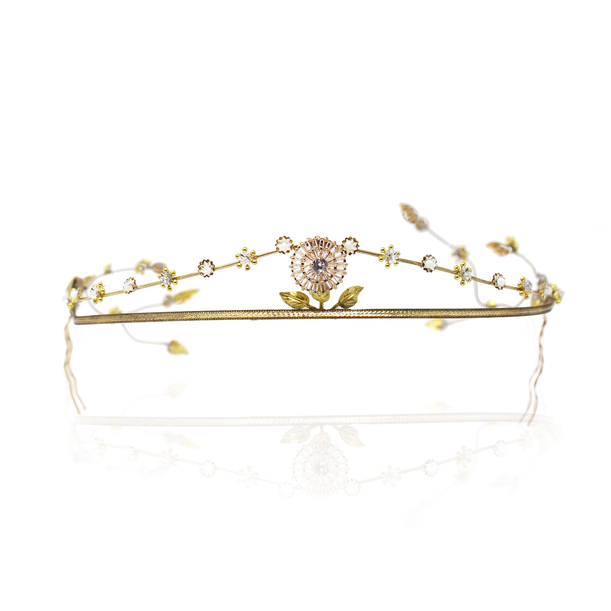 Corona en tonos dorados totalmente elaborada a mano. Diseño en forma de pico en su parte frontal y abierta por la trasera.