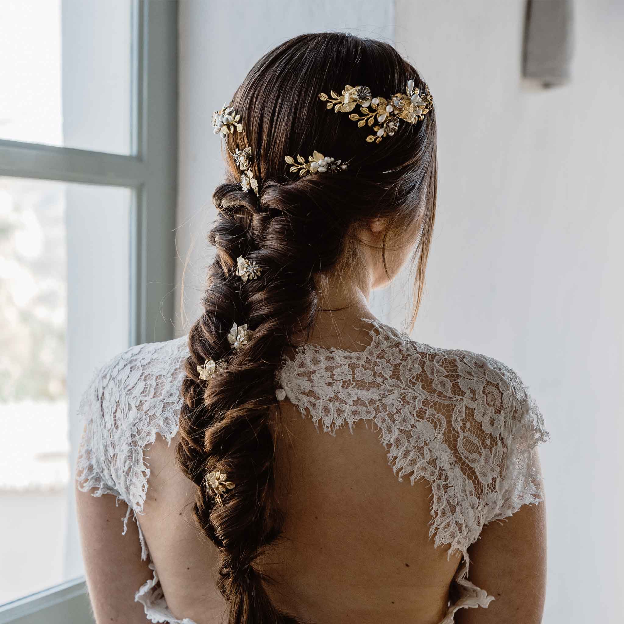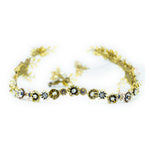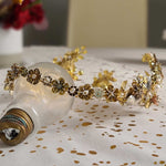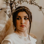 Corona joya finita en tonos plateados, dorados y bronce con detalles de pistilos perlados en la parte trasera y piedrecitas semipreciosas. Forma de pico en su parte delante, que aportará altura y estilizará tu look de novia.