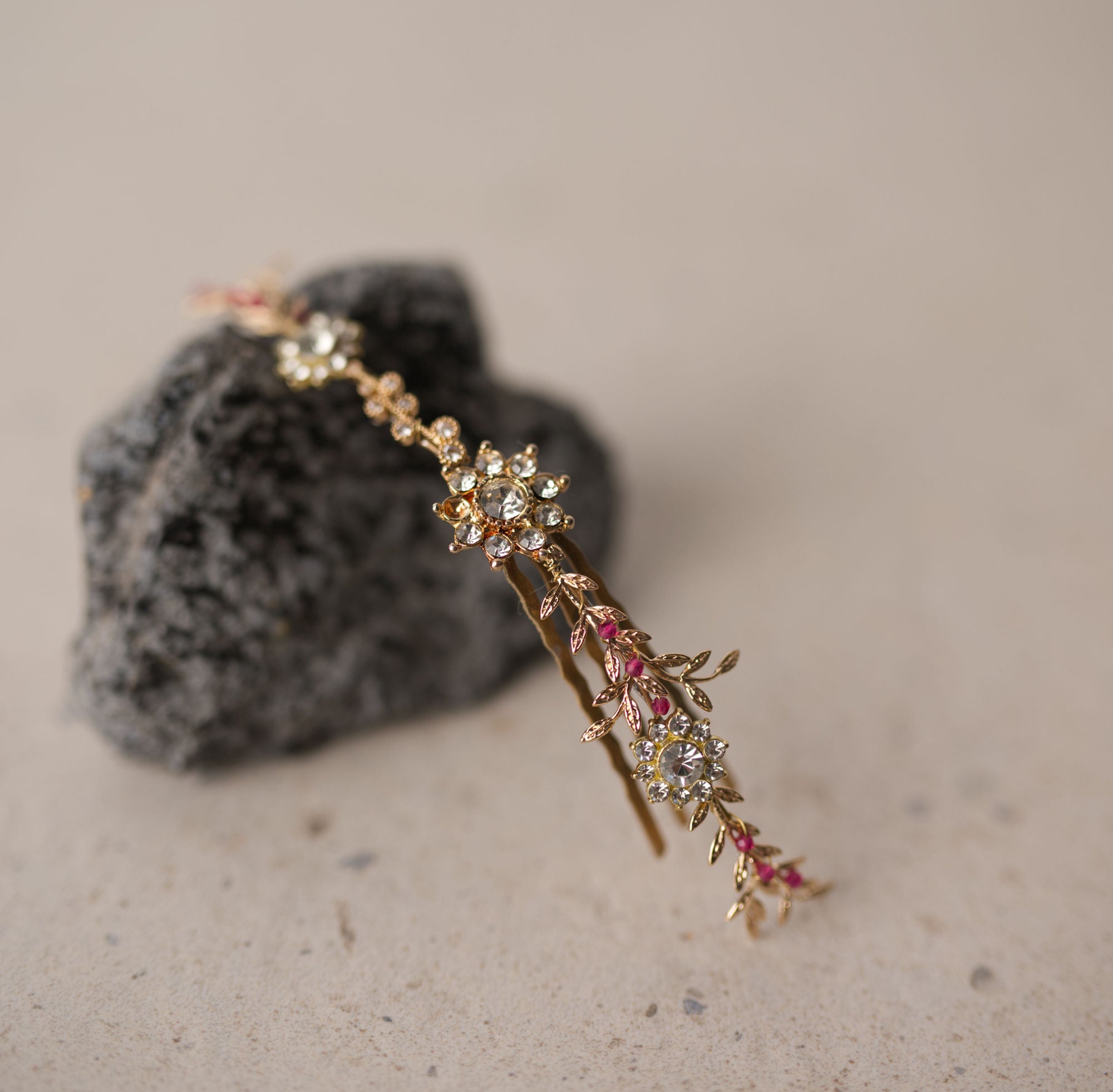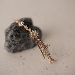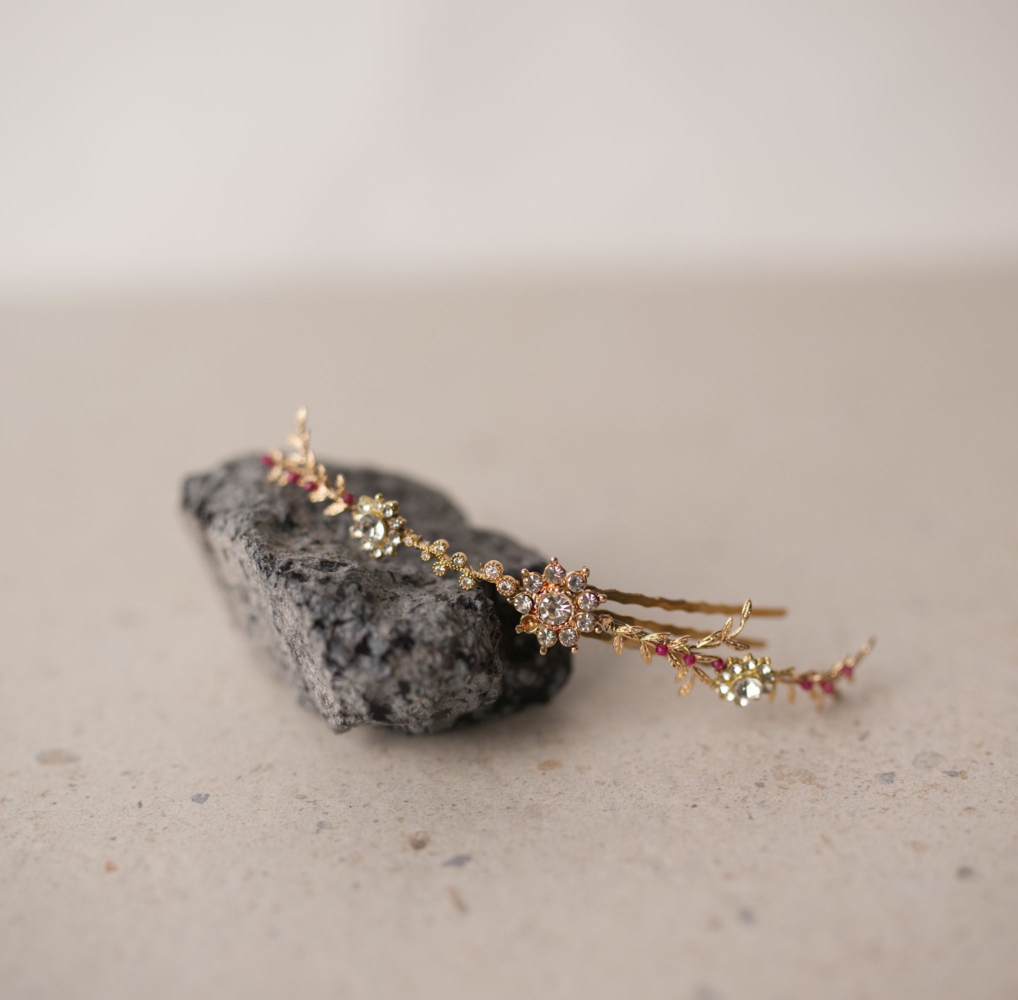 Está realizado a mano con materiales nobles. Su diseño vegetal dorado se combina con pequeños cristales y detalles florales que aportan brillo y movimiento, creando una pieza ligera, refinada y muy favorecedora.