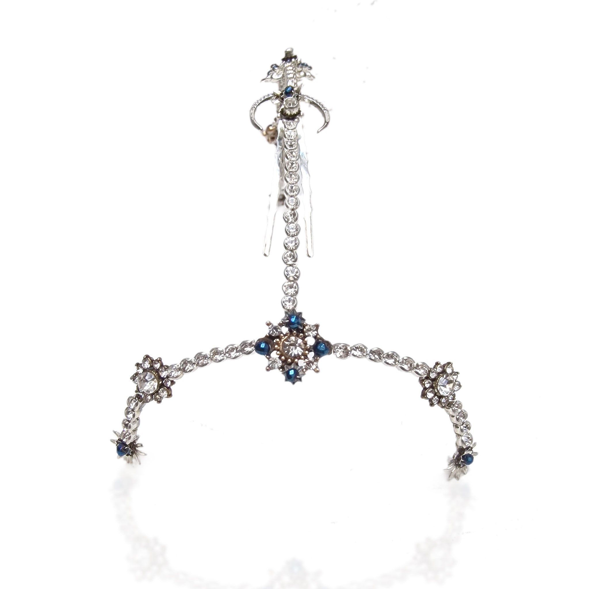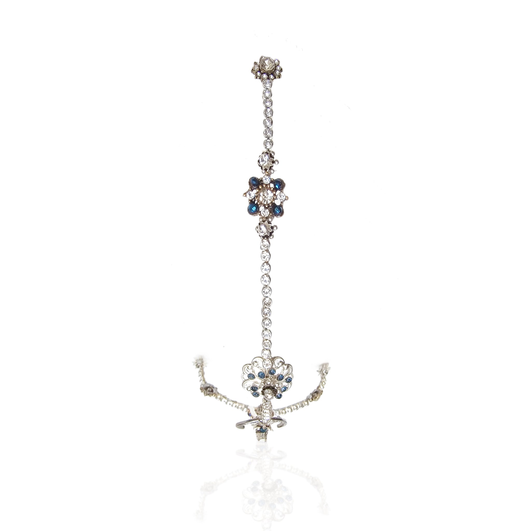 Esta pieza esta realizada en plateada y brillantes coronando una pieza con cristales azules.