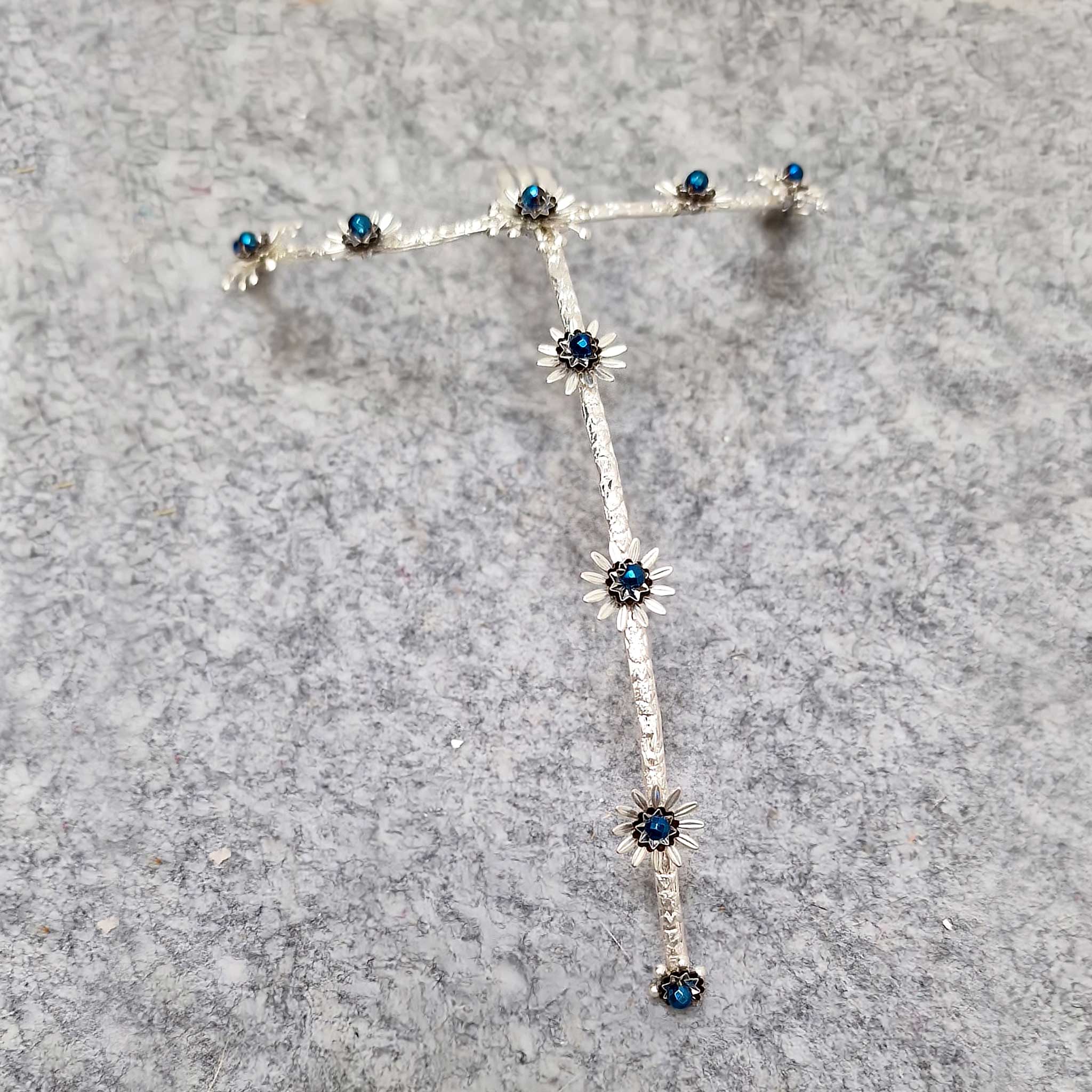 Esta pieza está realizada totalmente de manera artesanal, soldando las pequeñas joyas y piedrecitas una a una hasta conseguir la composición completa.
