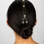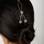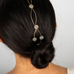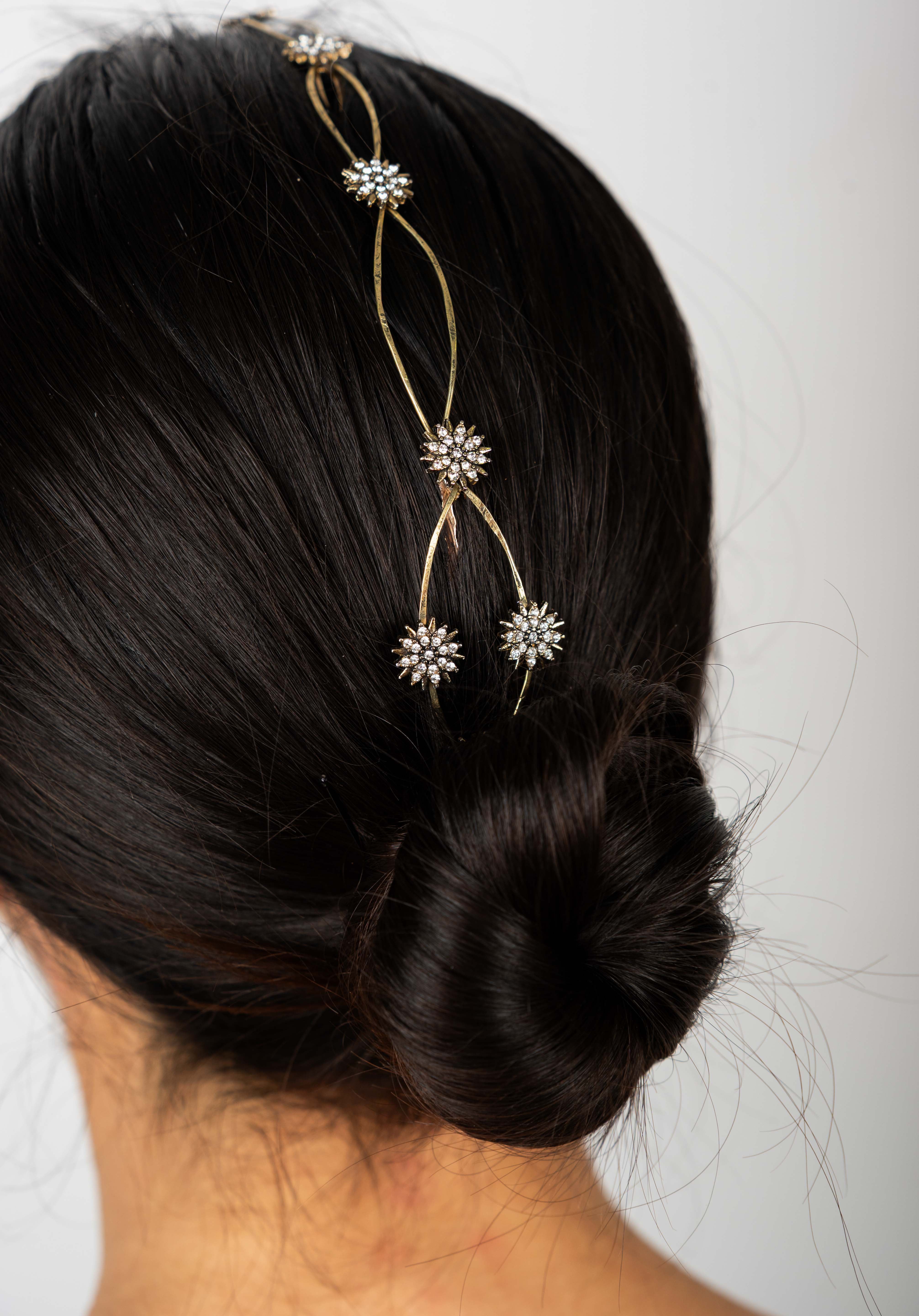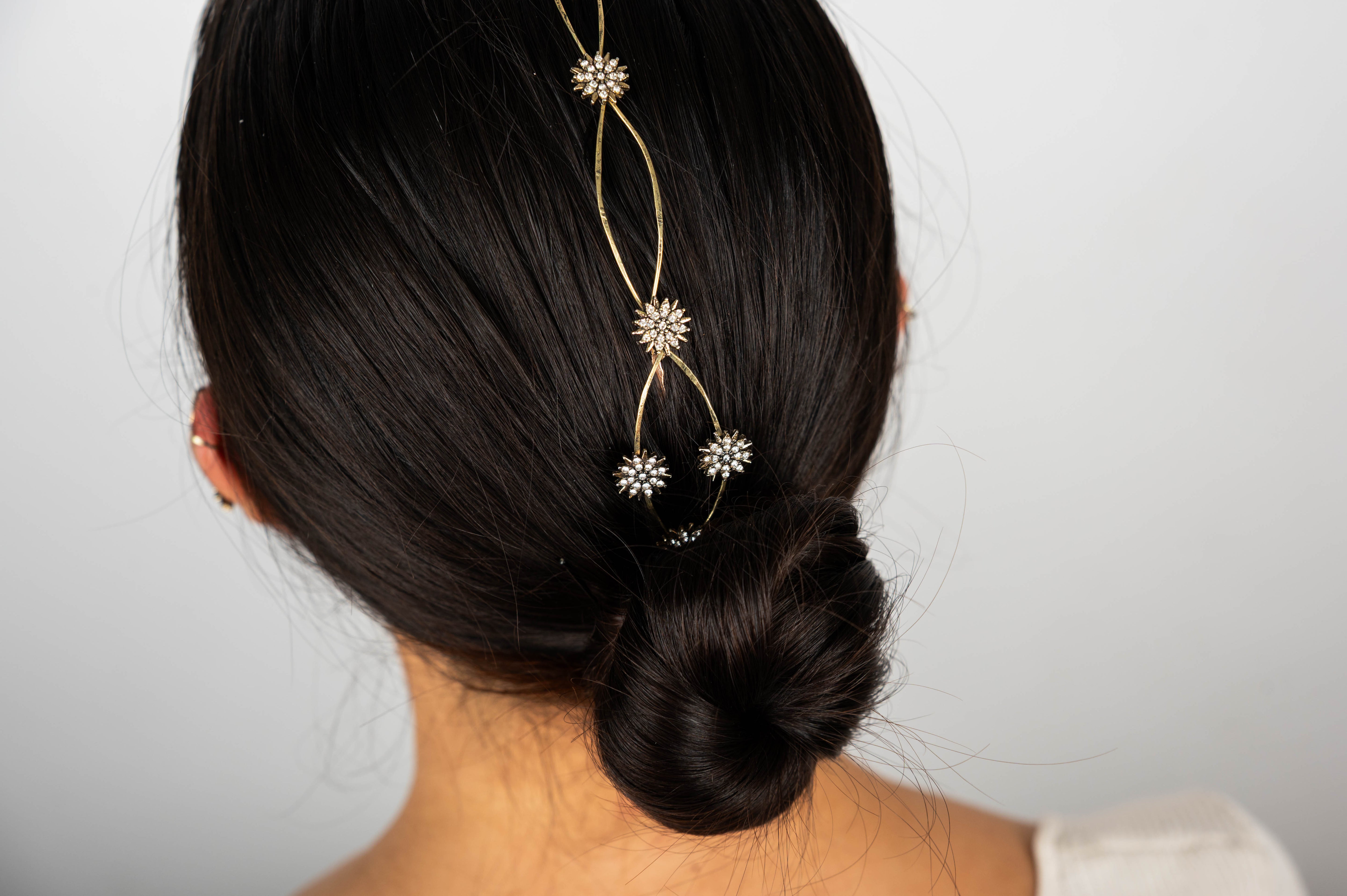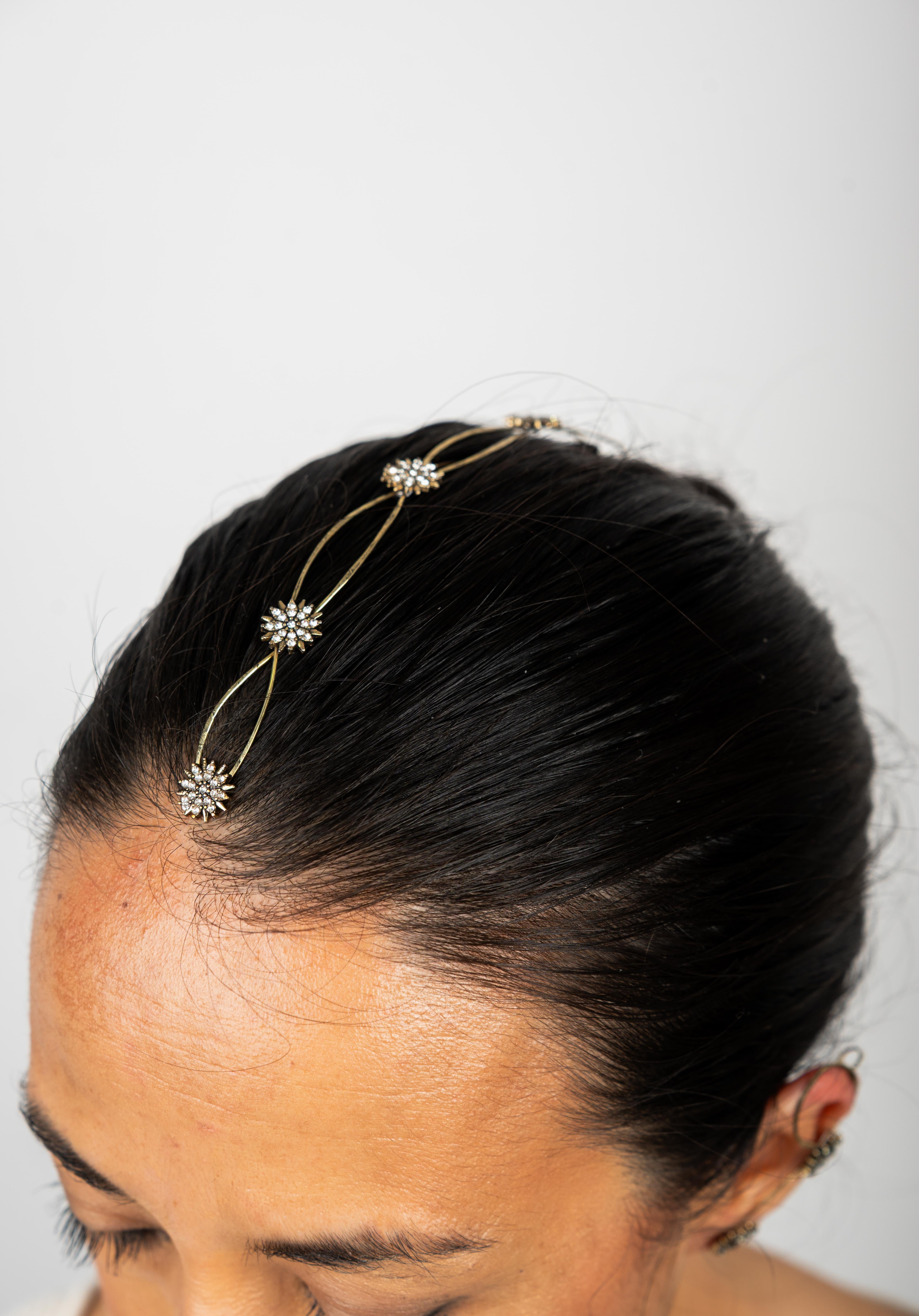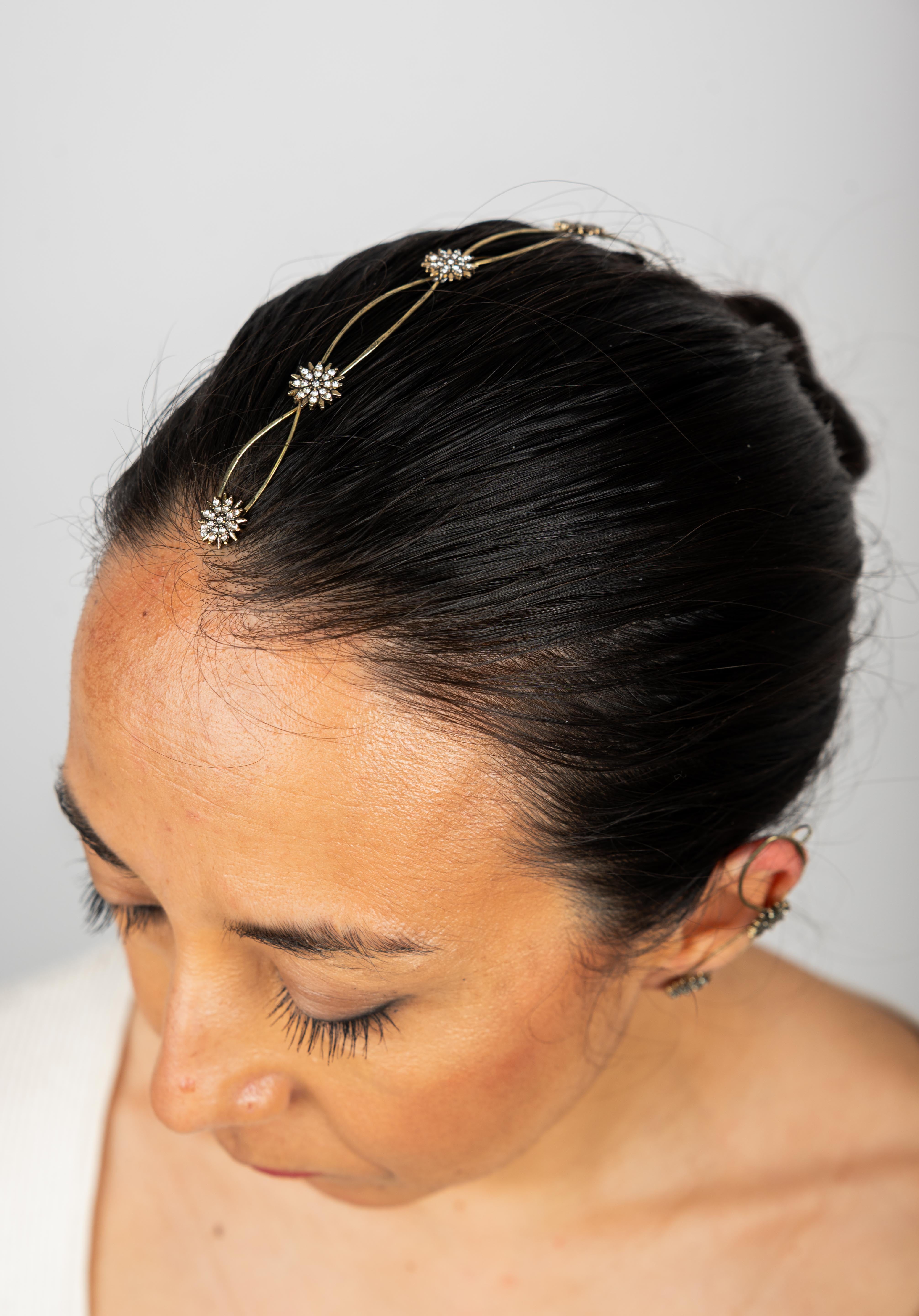 Cada detalle ha sido cuidadosamente elaborado, destacando pequeños soles decorativos que capturan la luz gracias a delicados cristales engarzados. Estos destellos aportan un toque celestial y sofisticado que transforma cualquier peinado en una verdadera obra de arte.