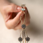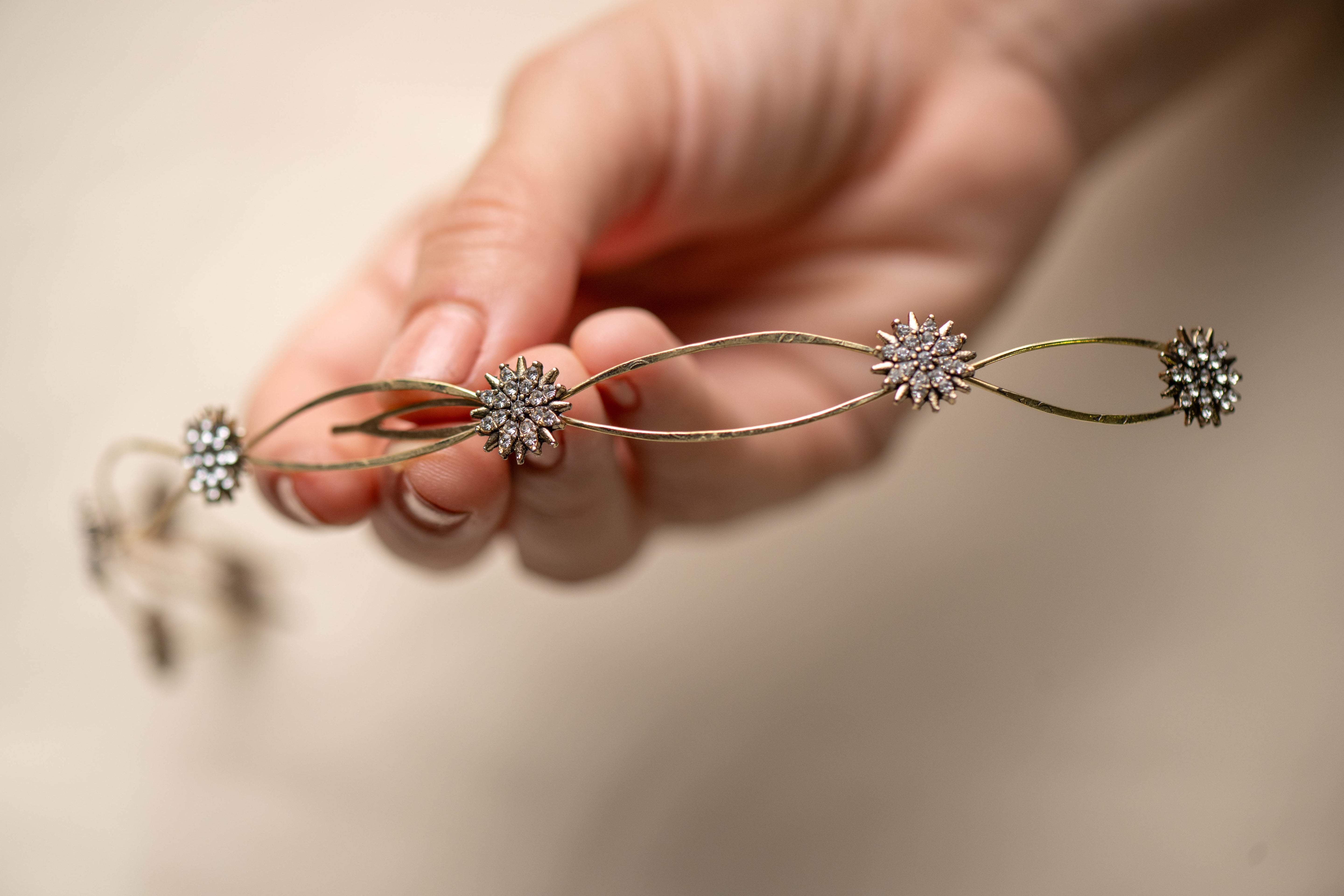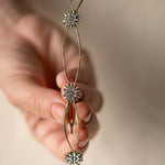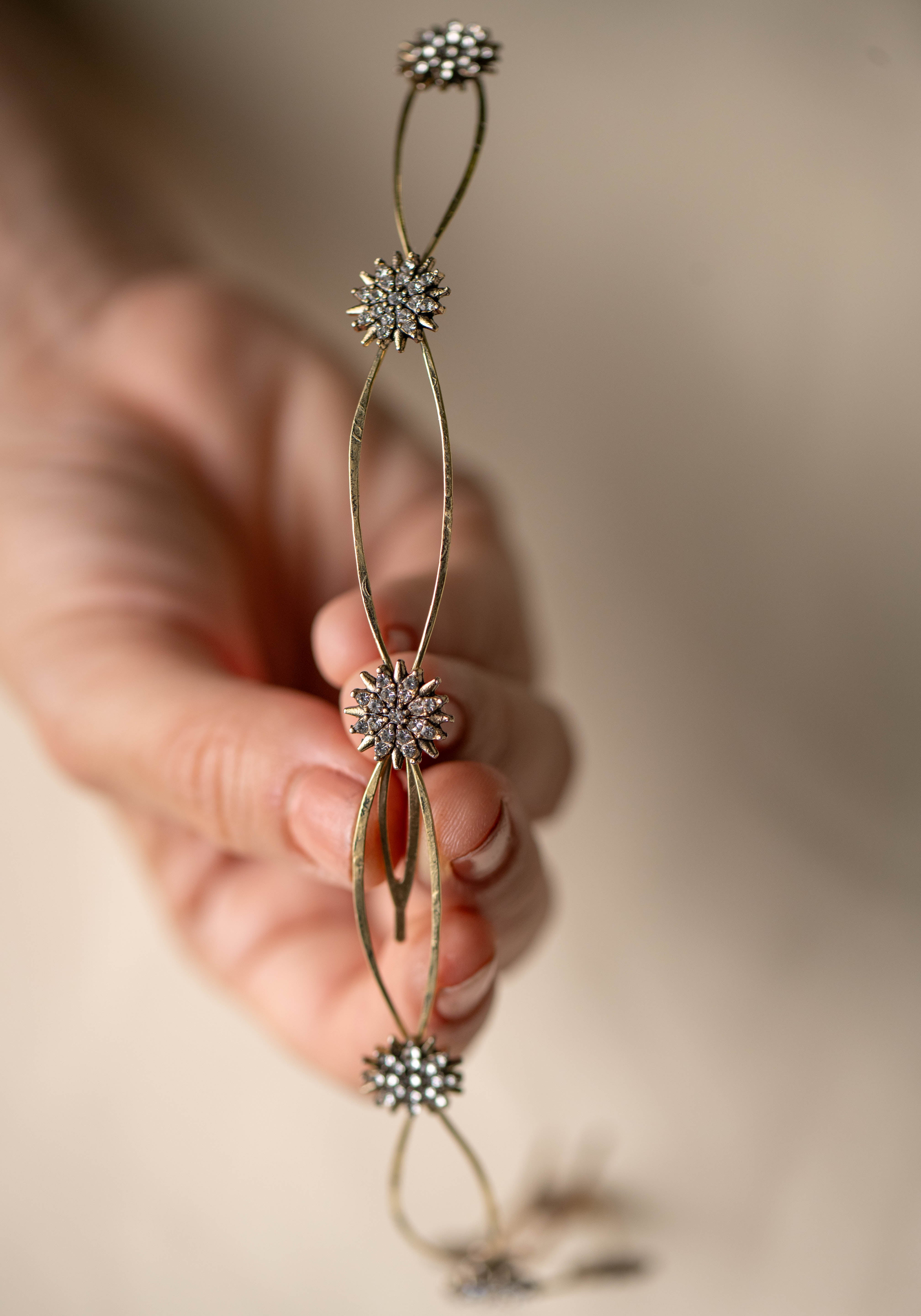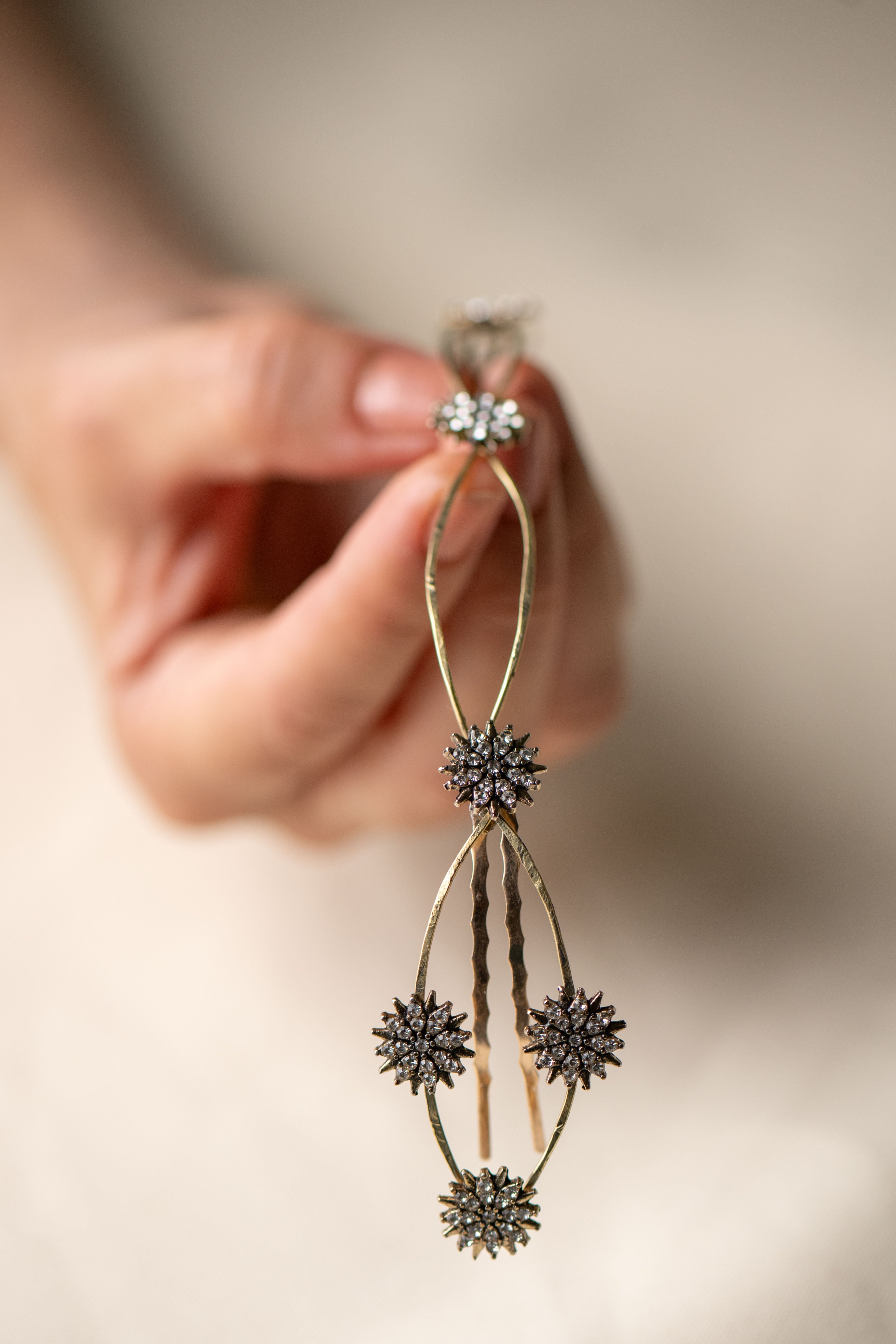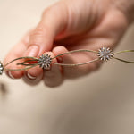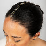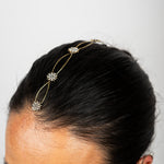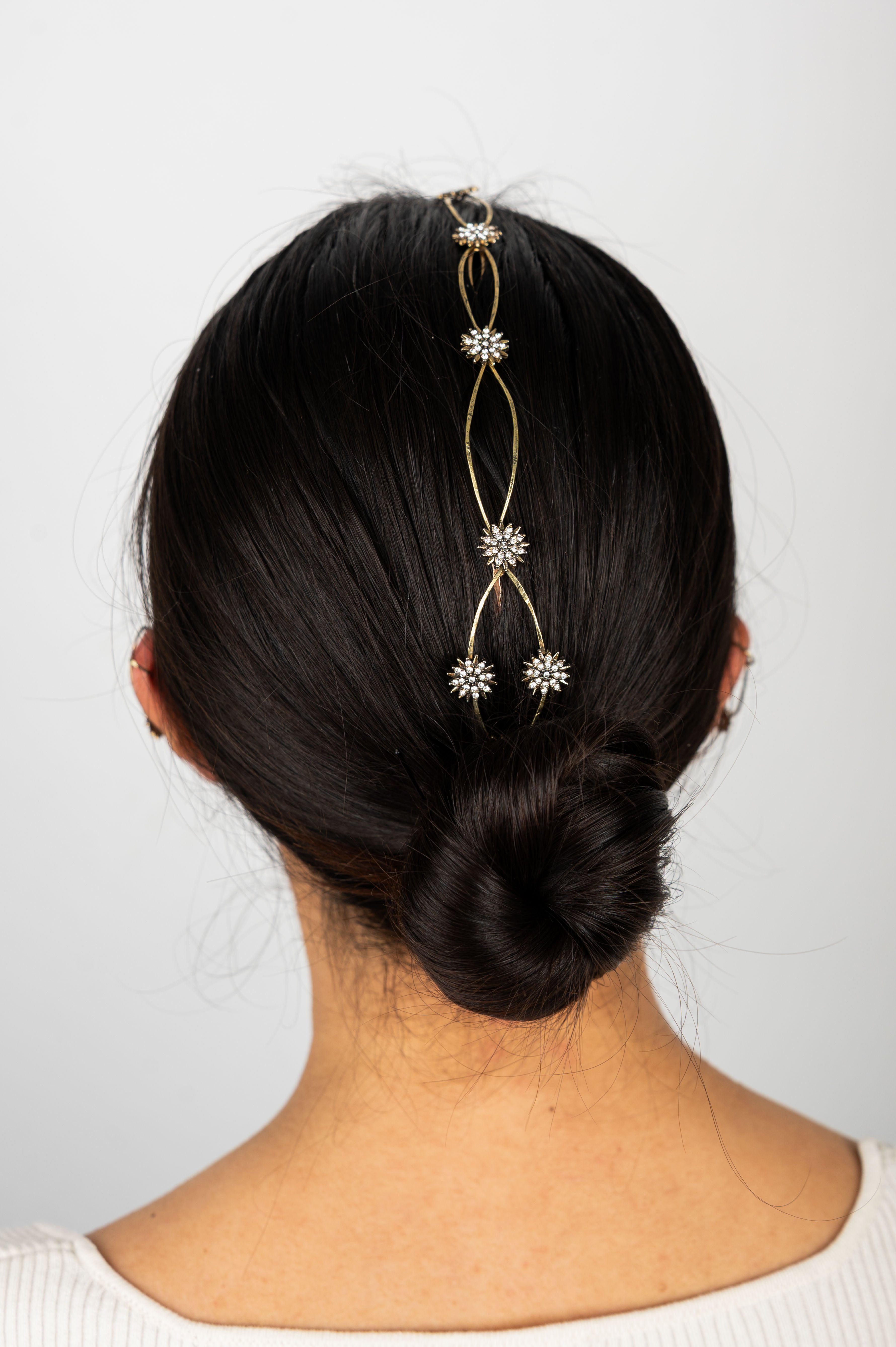 Cada detalle ha sido cuidadosamente elaborado, destacando pequeños soles decorativos que capturan la luz gracias a delicados cristales engarzados. Estos destellos aportan un toque celestial y sofisticado que transforma cualquier peinado en una verdadera obra de arte.