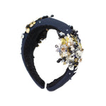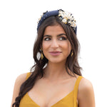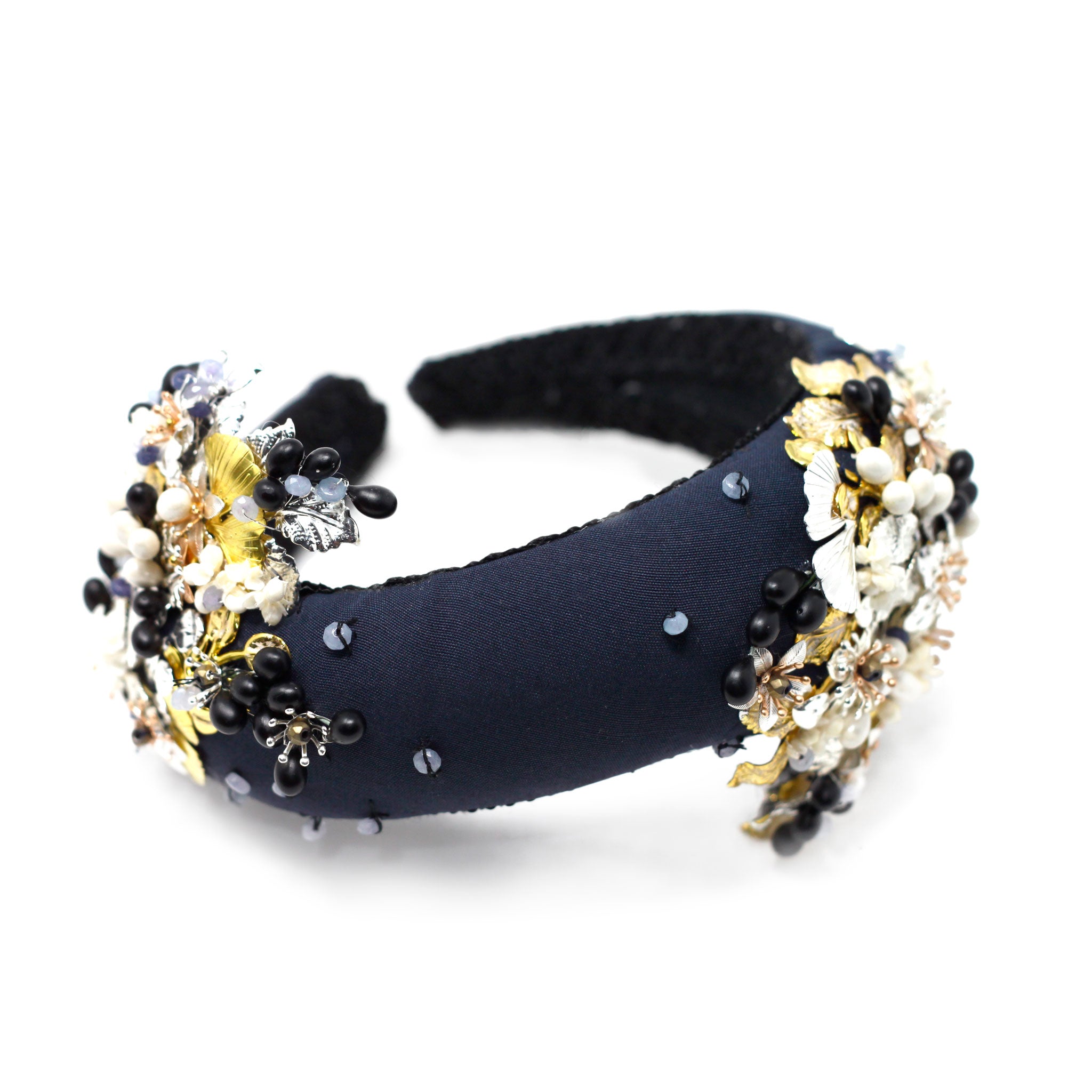 Diadema acolchada en tono azul marino decorada con una variedad de piezas joya en tonos plata y dorado. En su decoración se incluyen también pistilos de porcelana negros y piedrecitas semipreciosas.