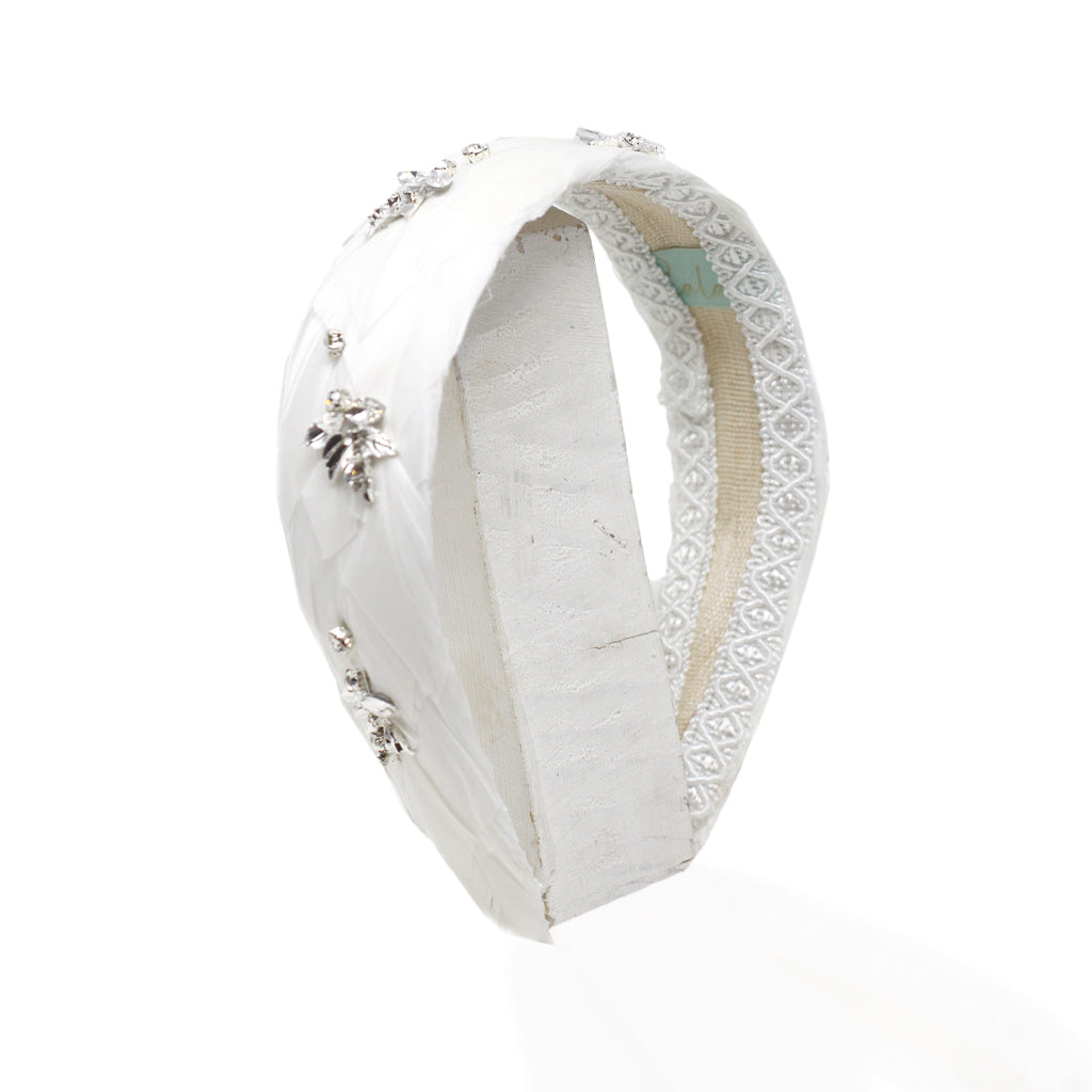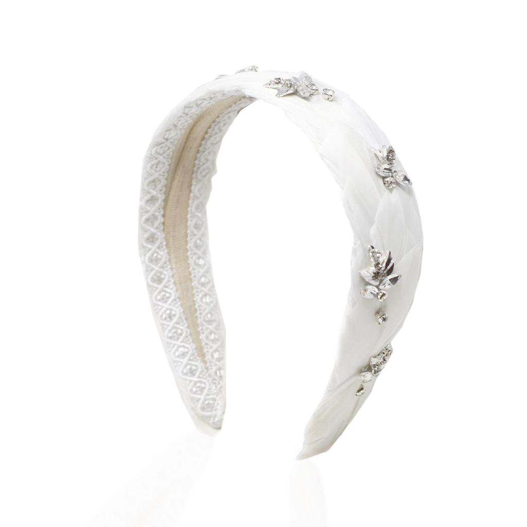 Descubre la elegancia atemporal con nuestra deslumbrante diadema de plumas blancas y joya en brillantes, perfecta para novias e invitadas que buscan un toque de sofisticación en su estilo nupcial.