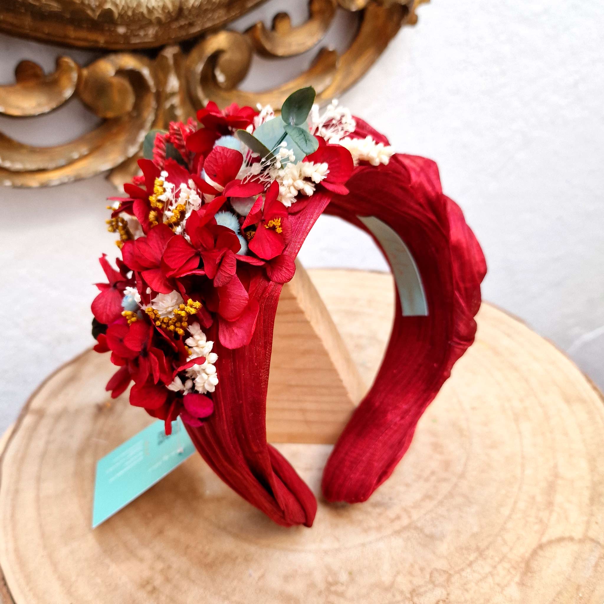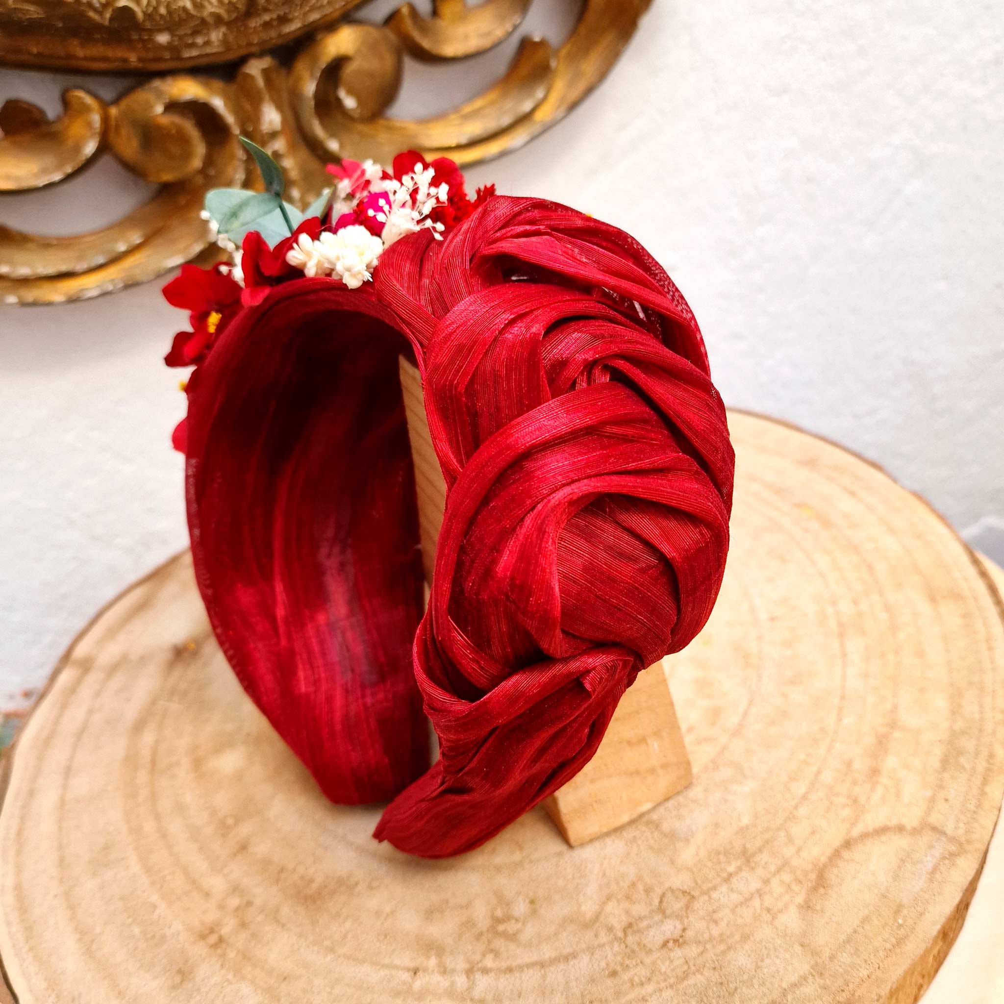 Diadema totalmente elaborada a mano con sinamay de color rojo con decoración lateral de flores preservadas. El otro lateral está compuesto por una arruga de la misma tela.