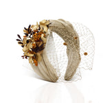 Diadema arrugada en seda de sinamay dorado decorada con flores preservadas en tonalidades  en uno de sus laterales. Al otro realizamos una arruga manual que aporta altura al look y lo estiliza.