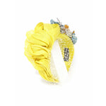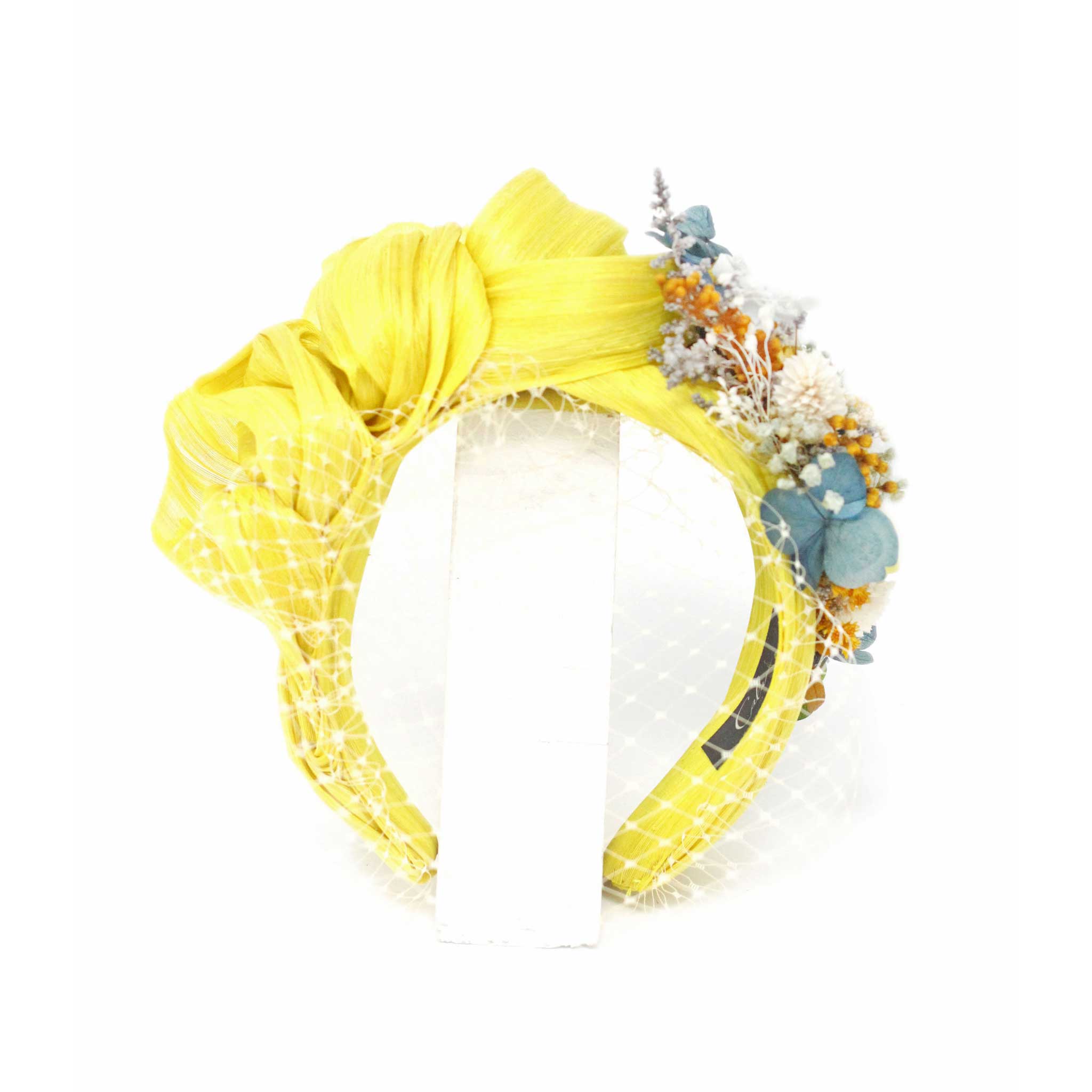 Diadema elaborada totalmente a mano recubierta de sinamay en tonalidad amarilla. Este diseño está decorado con flores preservadas en uno de sus laterales. Al otro realizamos una arruga manual que aporta altura al look y lo estiliza.