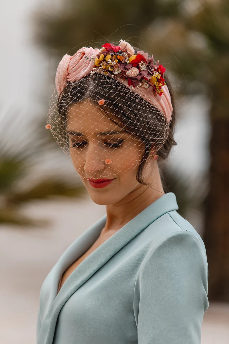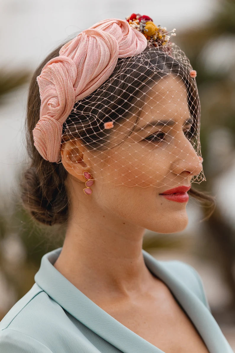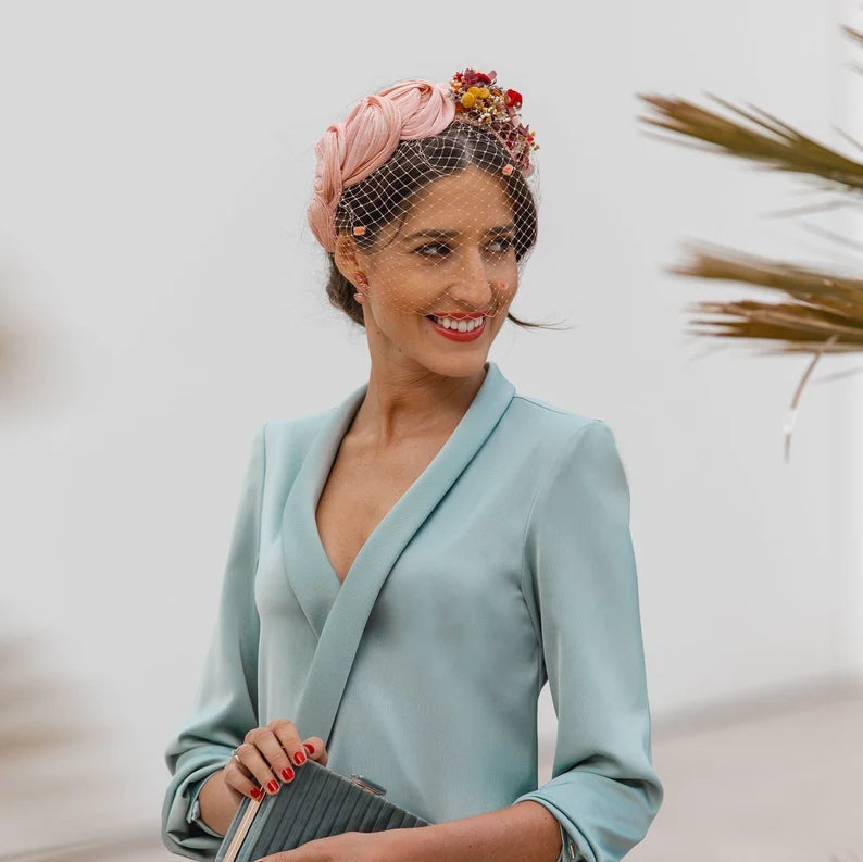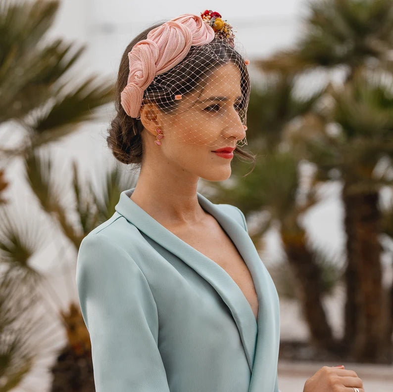 Valeria es una pieza de diseño exclusivo, elaborada manualmente en sinamay seda de alta calidad, un material noble que aporta ligereza y elegancia a cualquier look de ceremonia.