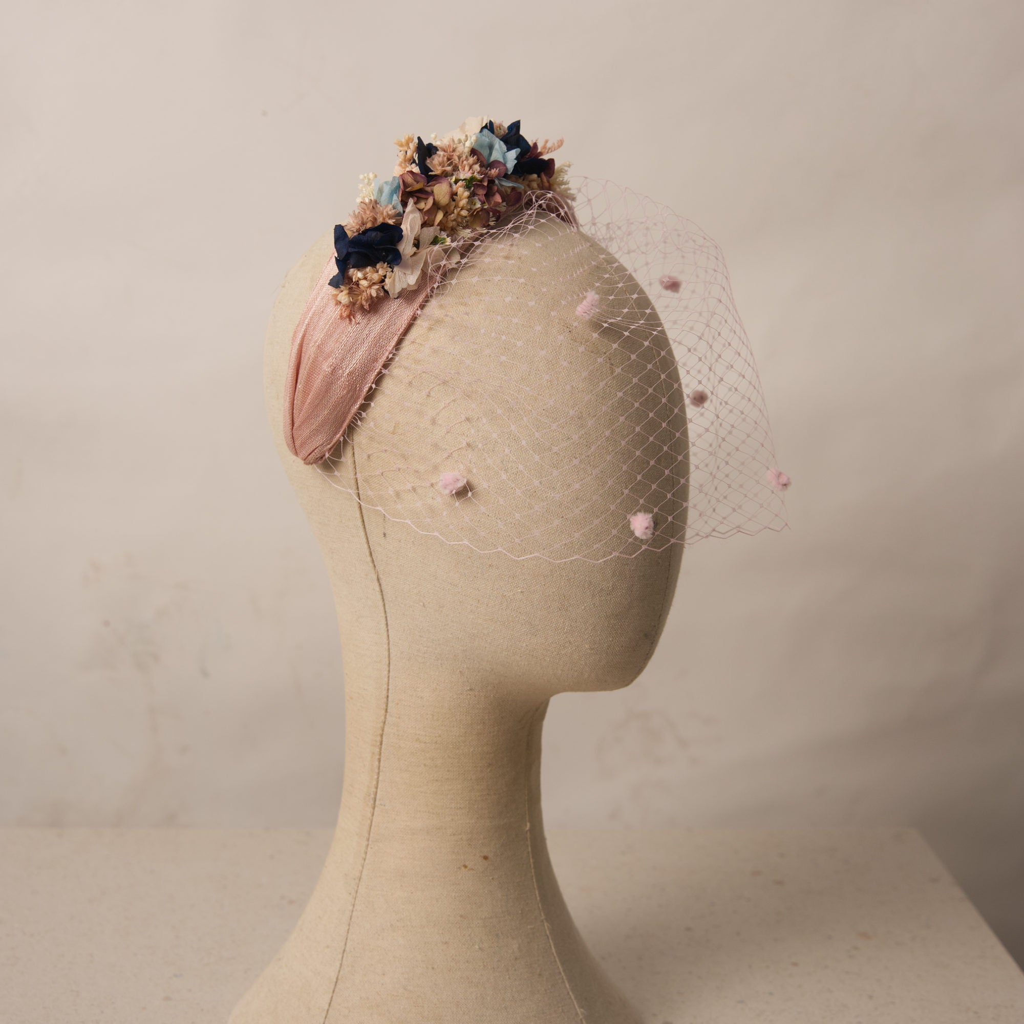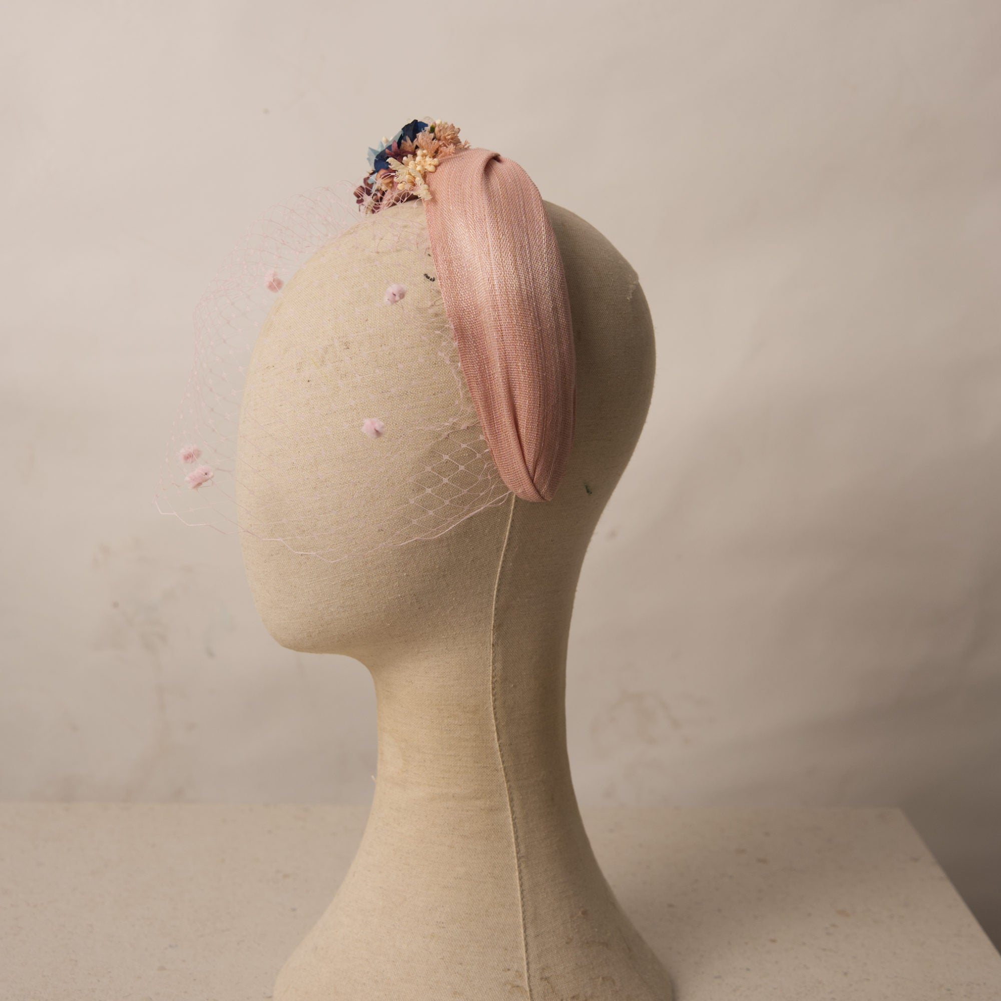 Diadema con diseño cruzado elaborada totalmente a mano son sinamay de color nude. Decoración de flores preservadas en uno de sus laterales.