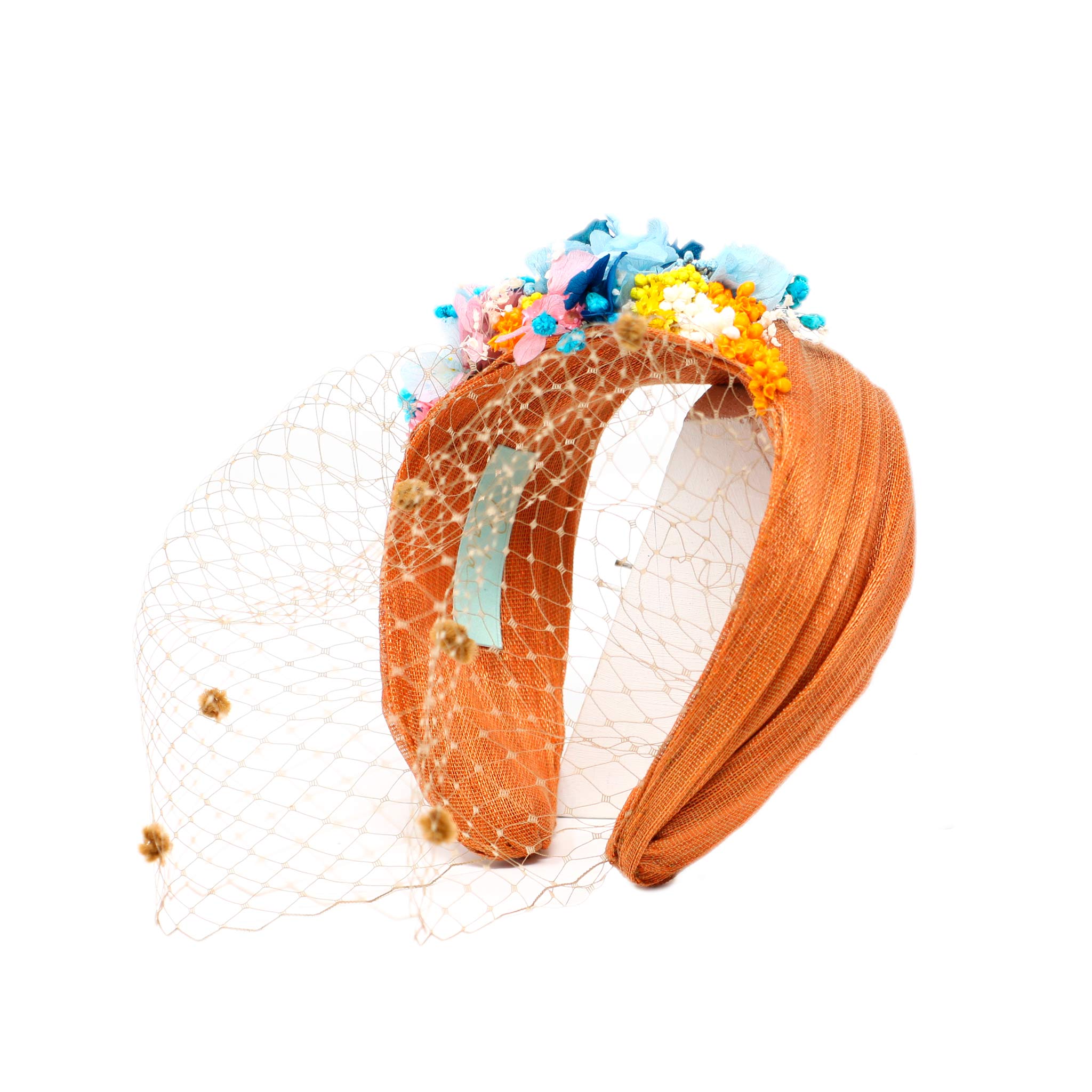 Diadema con diseño cruzado elaborada totalmente a mano son sinamay de color naranja. Decoración de flores preservadas en uno de sus laterales.